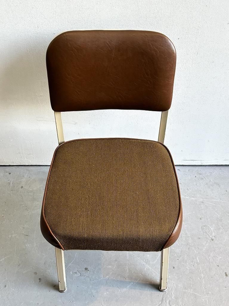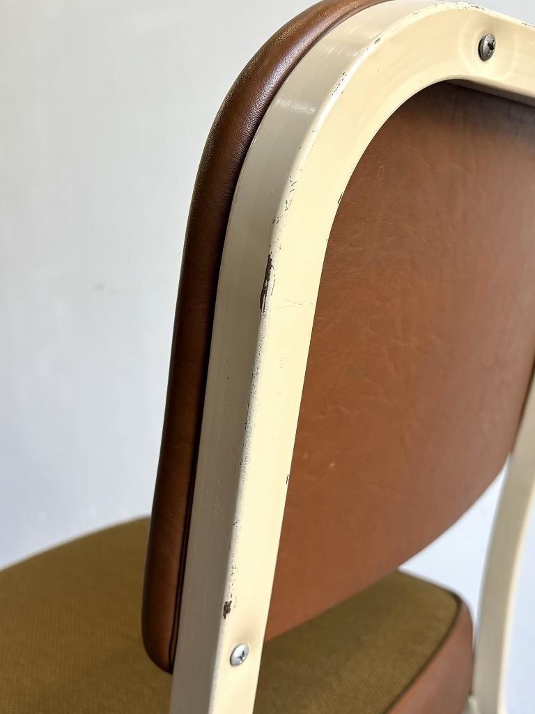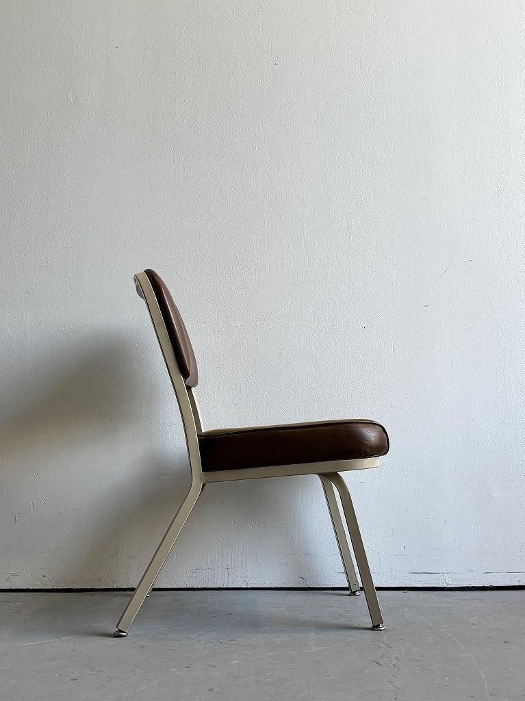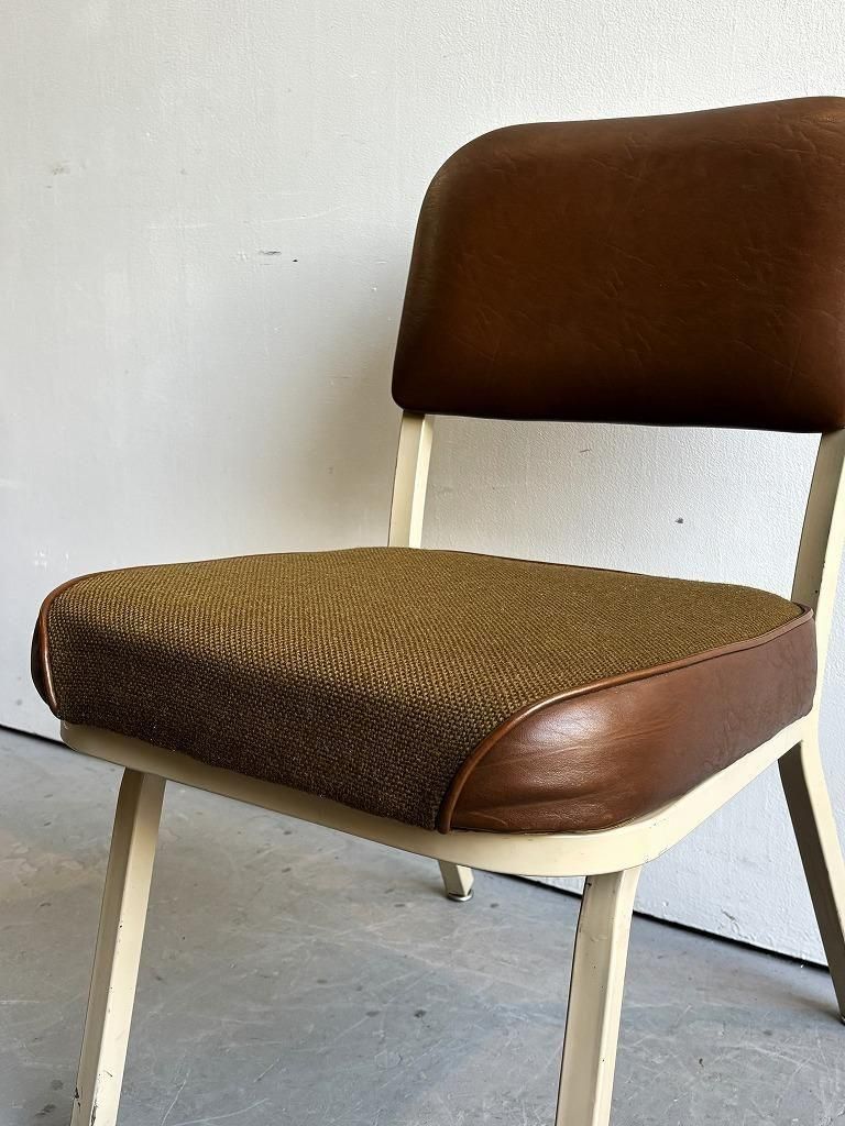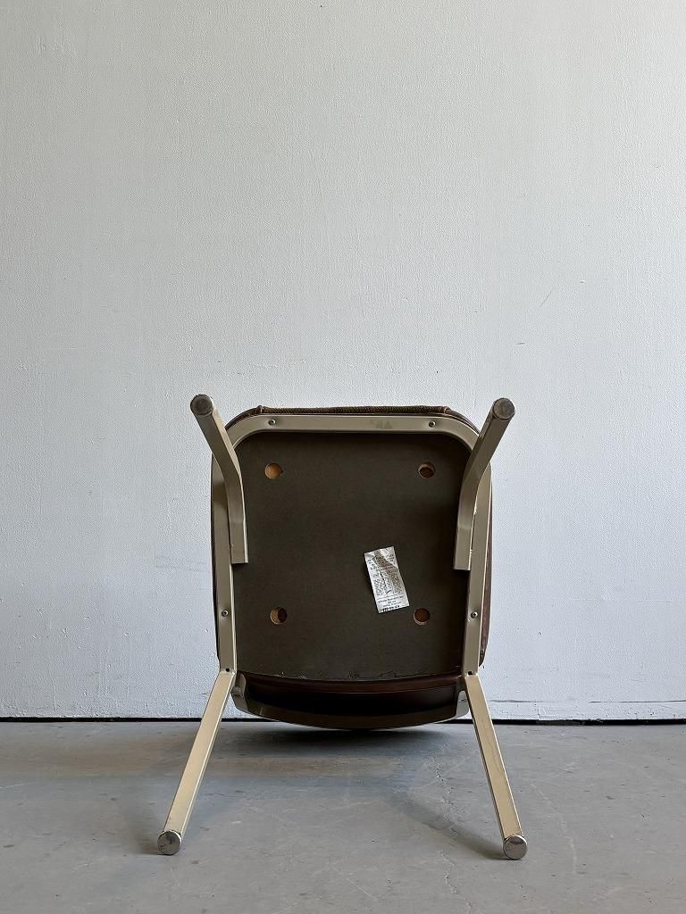 フレームはアイボリートーンのスチールで、70年代らしい柔らかな色調。背もたれと座面にはブラウンビニール×ブラウンファブリックの張り分けが施され、オフィスユースの堅牢さと、家庭用にも馴染む温かみをあわせ持つデザインに仕上がっています。