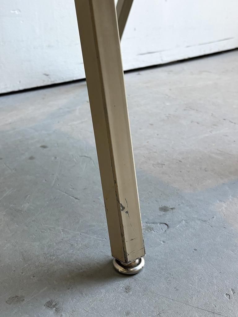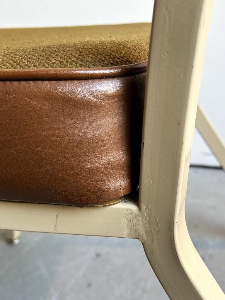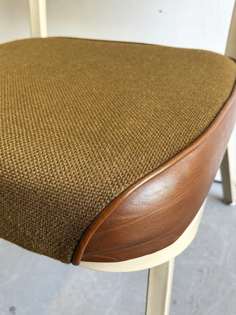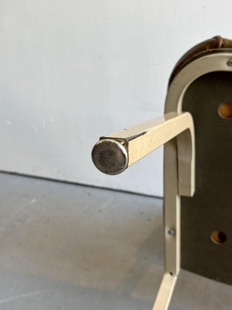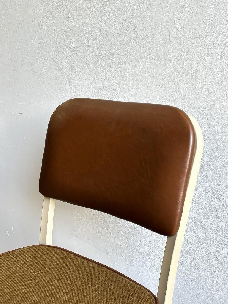 フレームはアイボリートーンのスチールで、70年代らしい柔らかな色調。背もたれと座面にはブラウンビニール×ブラウンファブリックの張り分けが施され、オフィスユースの堅牢さと、家庭用にも馴染む温かみをあわせ持つデザインに仕上がっています。