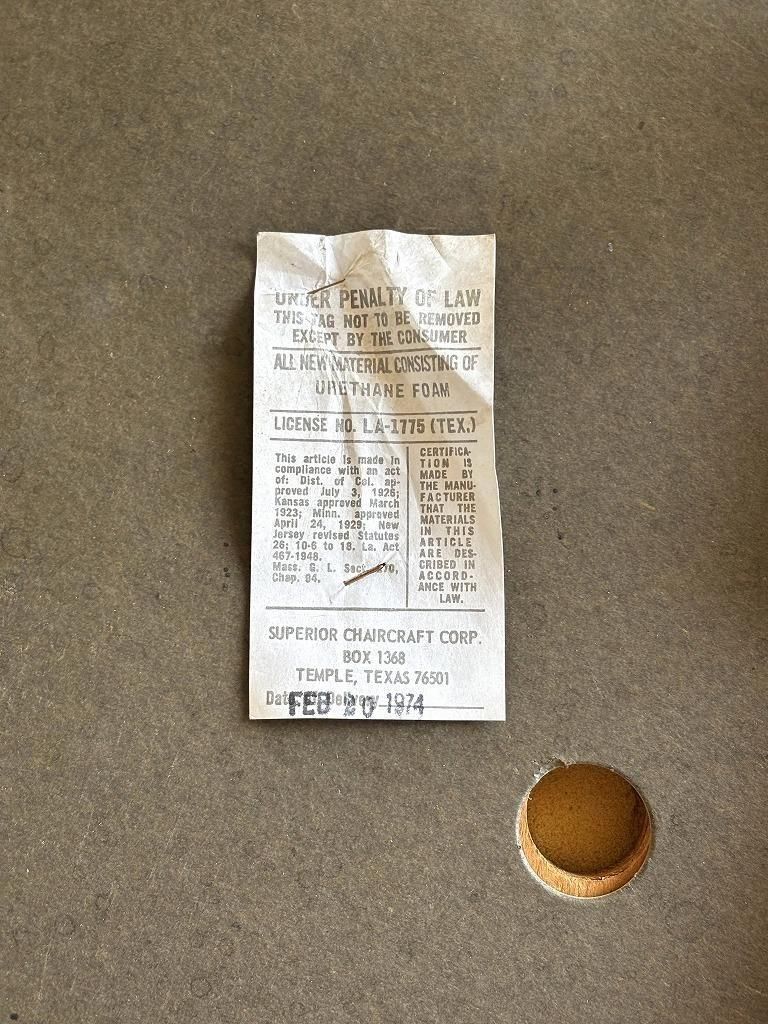 背・座のクッションには当時のタグが残り、1974年2月製造のスタンプが確認できる貴重な個体。ウレタンフォームの厚みがしっかりあり、ミッドセンチュリー以降のアメリカ家具らしい座り心地が体感できます。