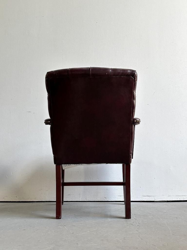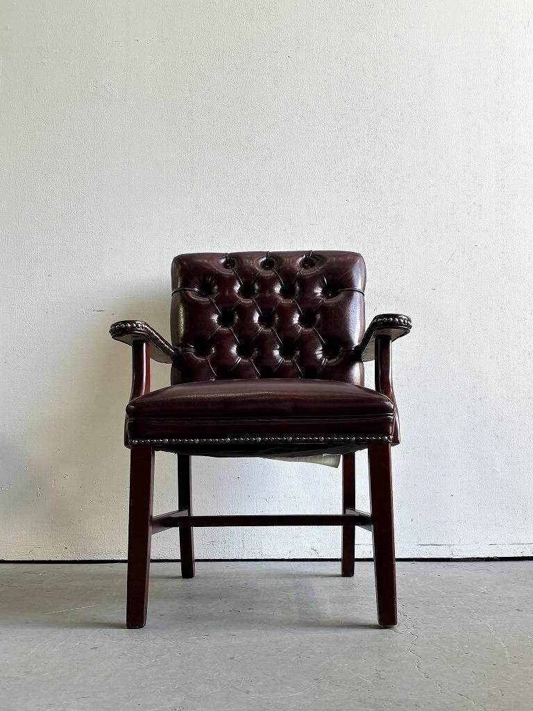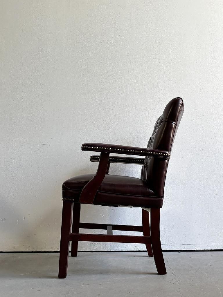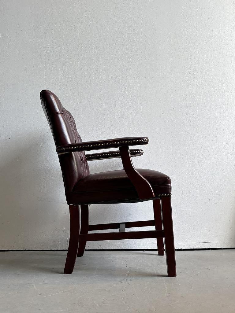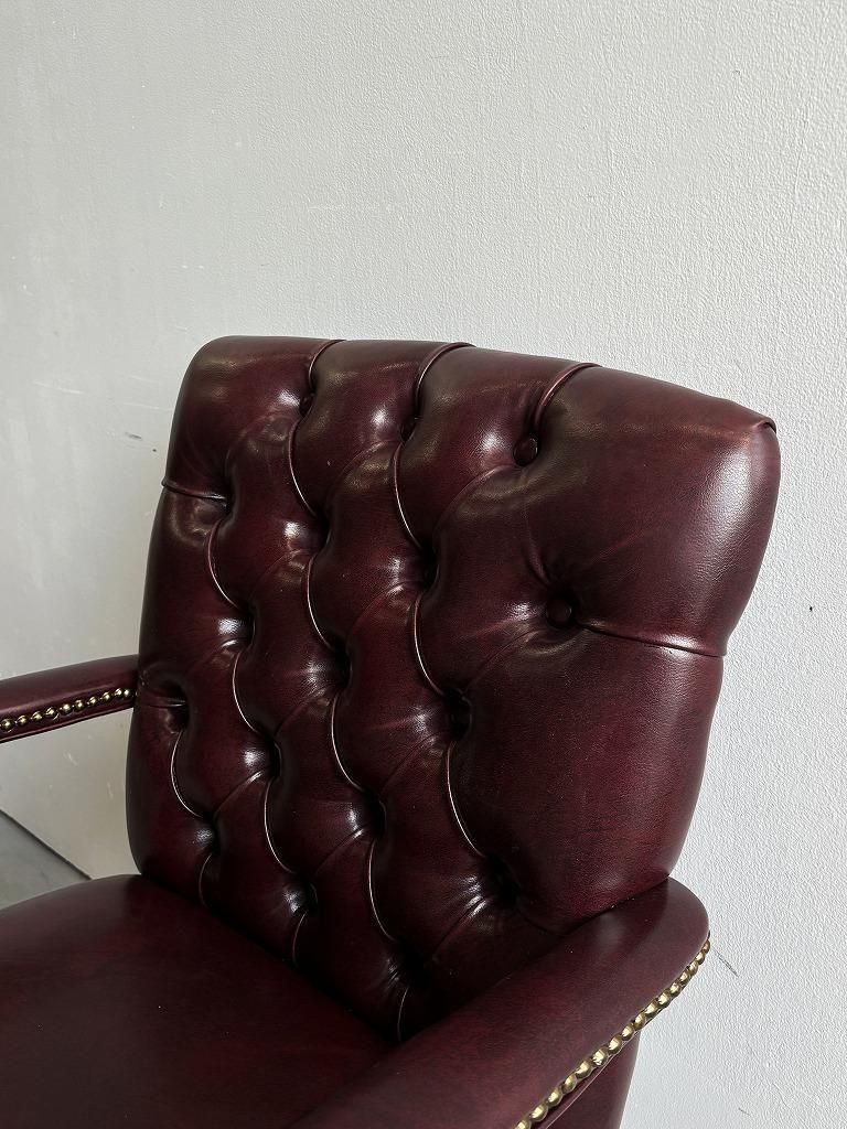 深いボルドーの張り地と、背もたれのボタン留めが印象的な、クラシックスタイルの一脚。ラウンジチェアのようなボリューム感と、デスクチェアとしても使える適度な存在感をあわせ持った一脚です。