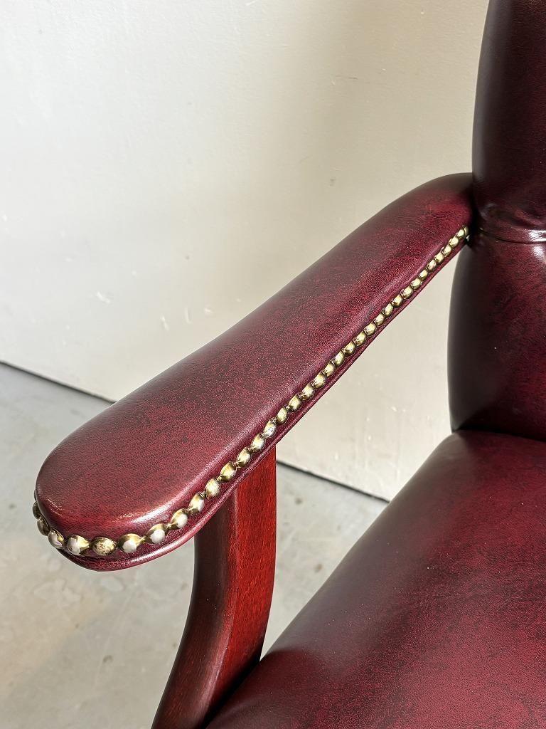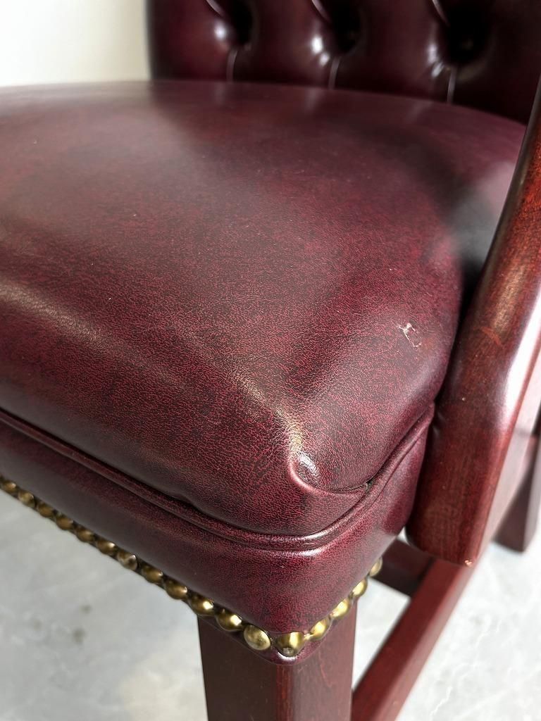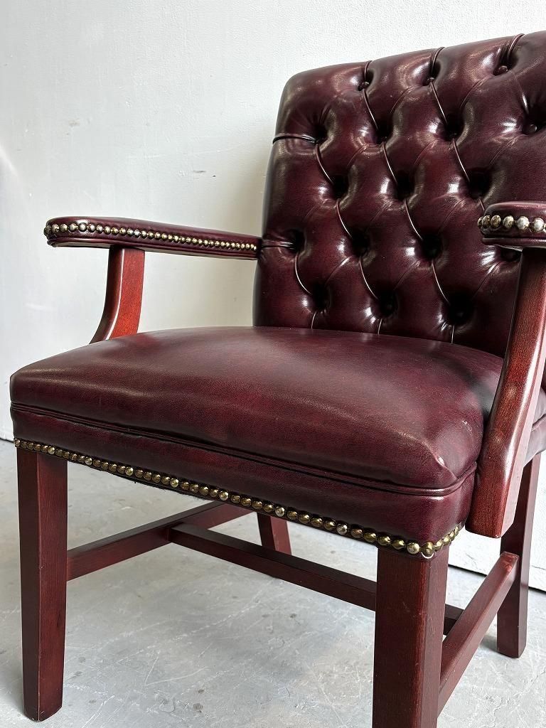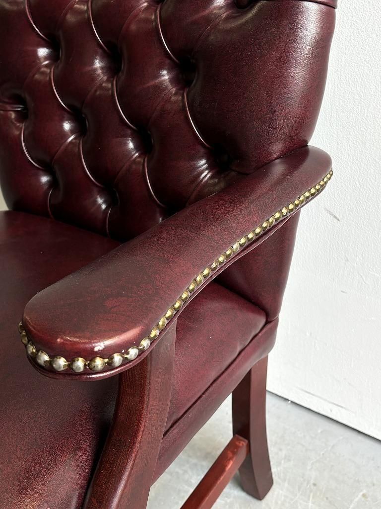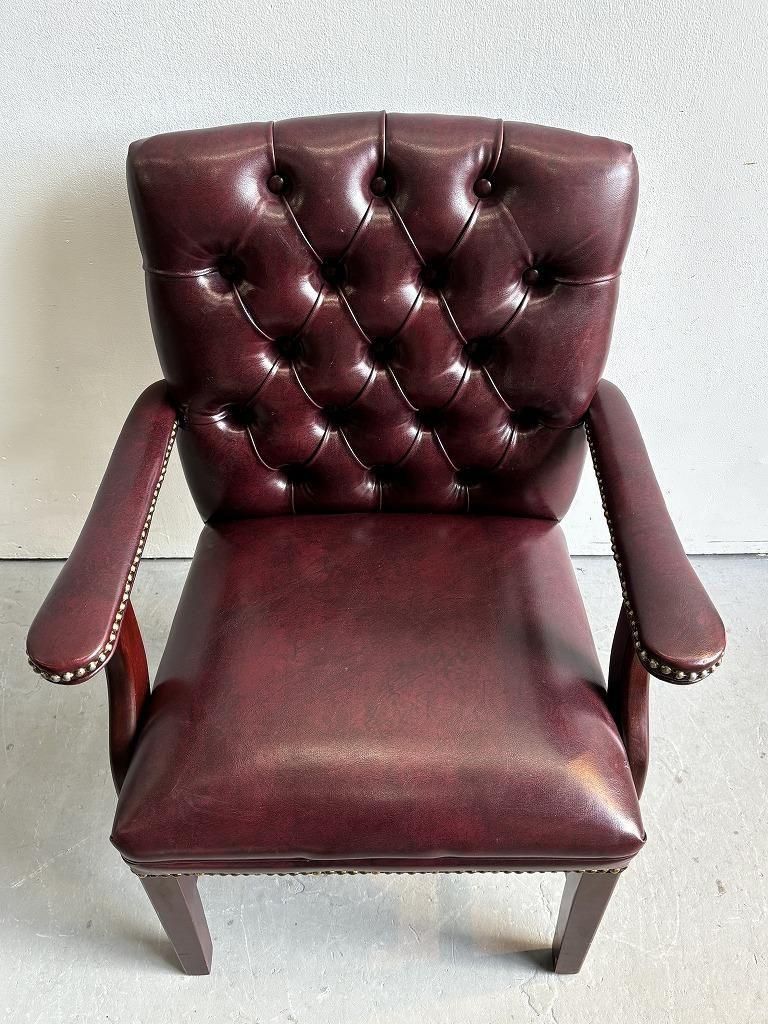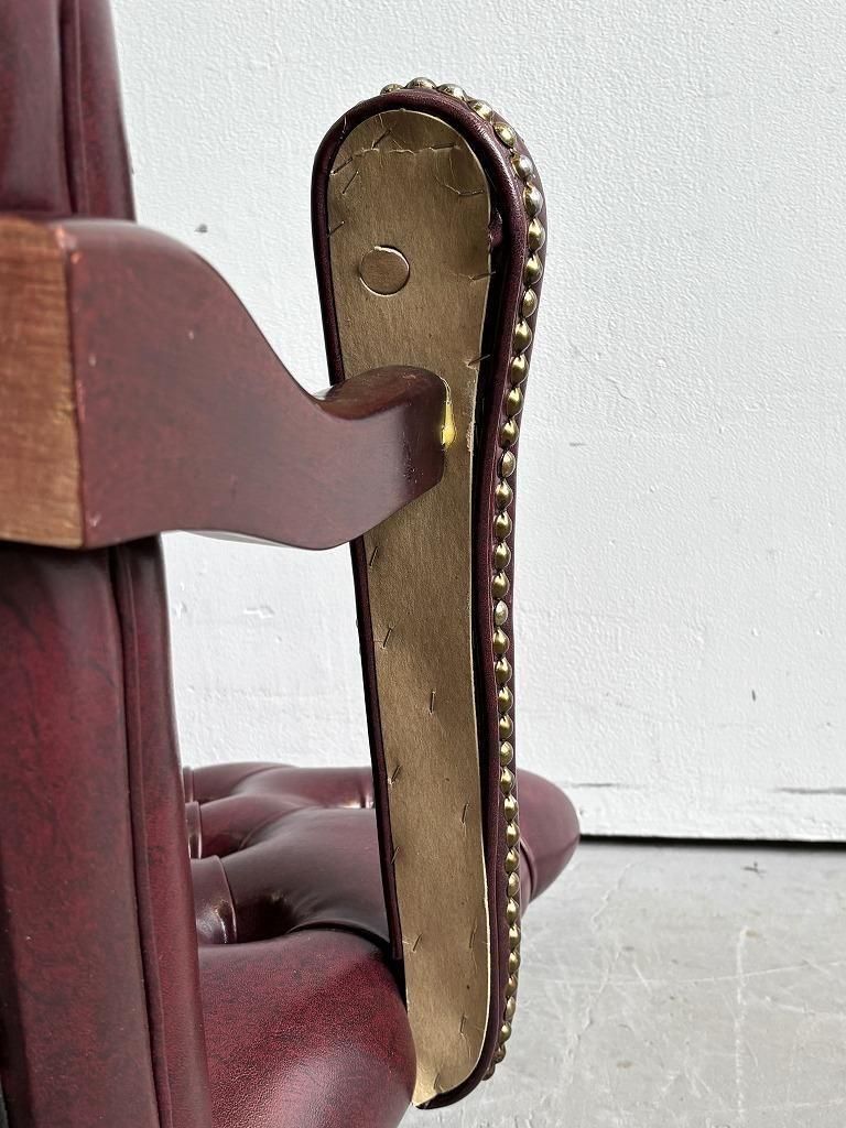 深いボルドーの張り地と、背もたれのボタン留めが印象的な、クラシックスタイルの一脚。ラウンジチェアのようなボリューム感と、デスクチェアとしても使える適度な存在感をあわせ持った一脚です。