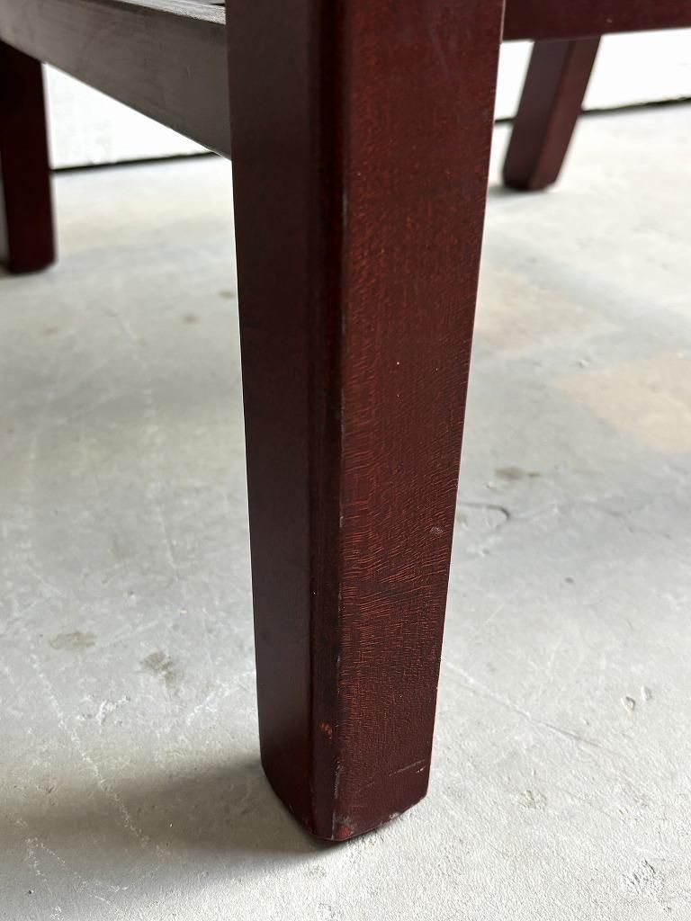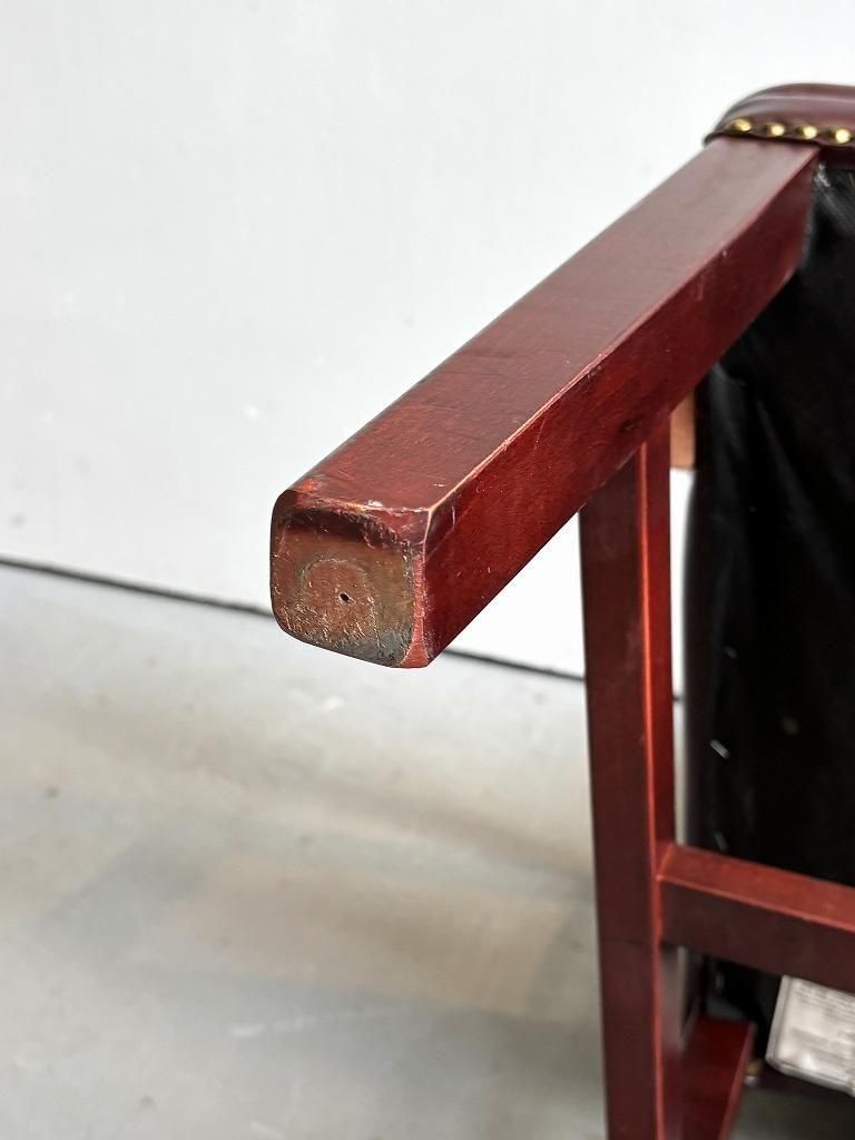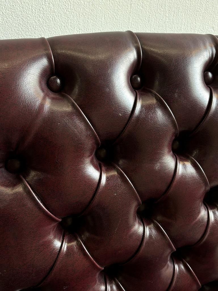 座面と背もたれは厚みがあり、アームまで丁寧に鋲打ち(スタッズ)が施され、クラシカルなチェスターフィールドスタイルの要素を踏襲しています。木製フレームの赤みのあるステインカラーとの相性も良く、落ち着いた重厚感を感じさせます。