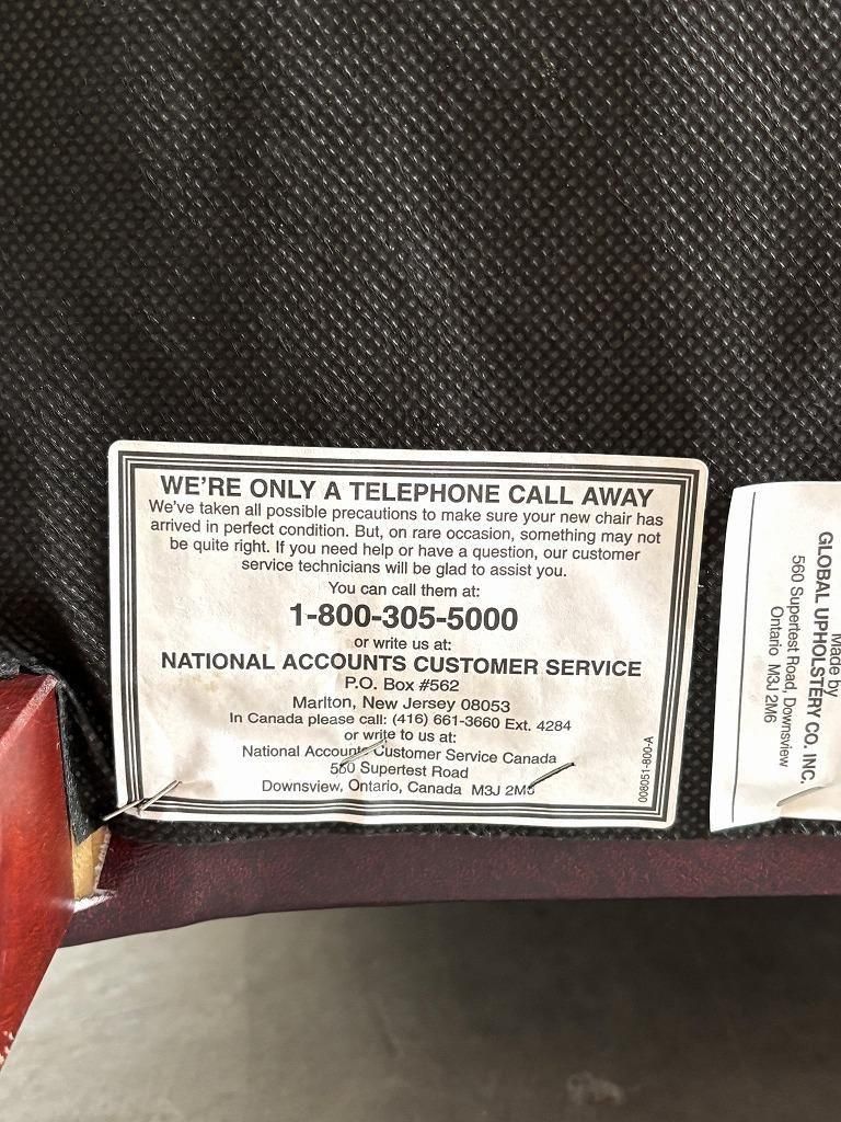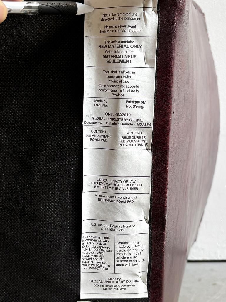 製造は GLOBAL UPHOLSTERY CO., INC.(カナダ・オンタリオ)。北米を中心にオフィスチェアやホスピタリティ向け家具を展開するメーカーで、アメリカのオフィス・行政施設などでも採用例が多いブランドです。座面裏のラベルから、ポリウレタンフォームを使用したしっかりとしたつくりであることが確認できます。