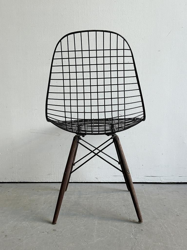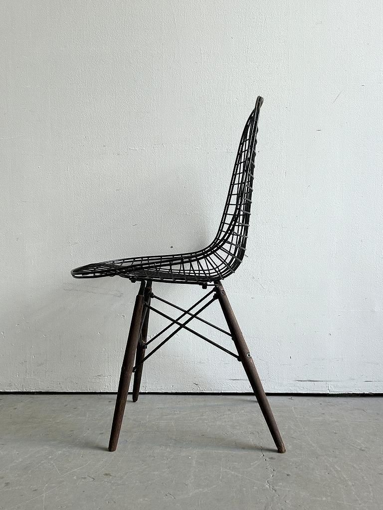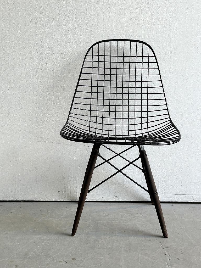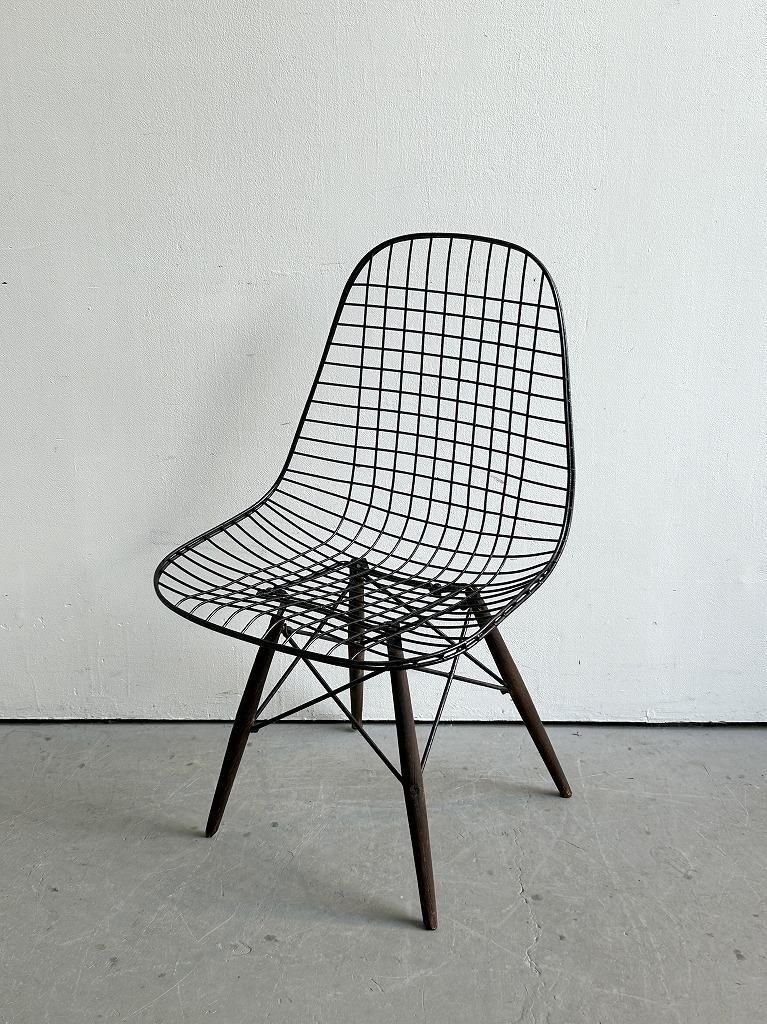 1950年代に Charles & Ray Eames(チャールズ&レイ・イームズ) によってデザインされた、ワイヤーシェルと木製レッグを組み合わせた DKW(Dining Height K-wire Wood Base)チェア。ワイヤーシェル専用に開発された希少な“ウッドダヴェルベース”を採用したモデルで、現在ではほとんど市場に出ない初期仕様です。