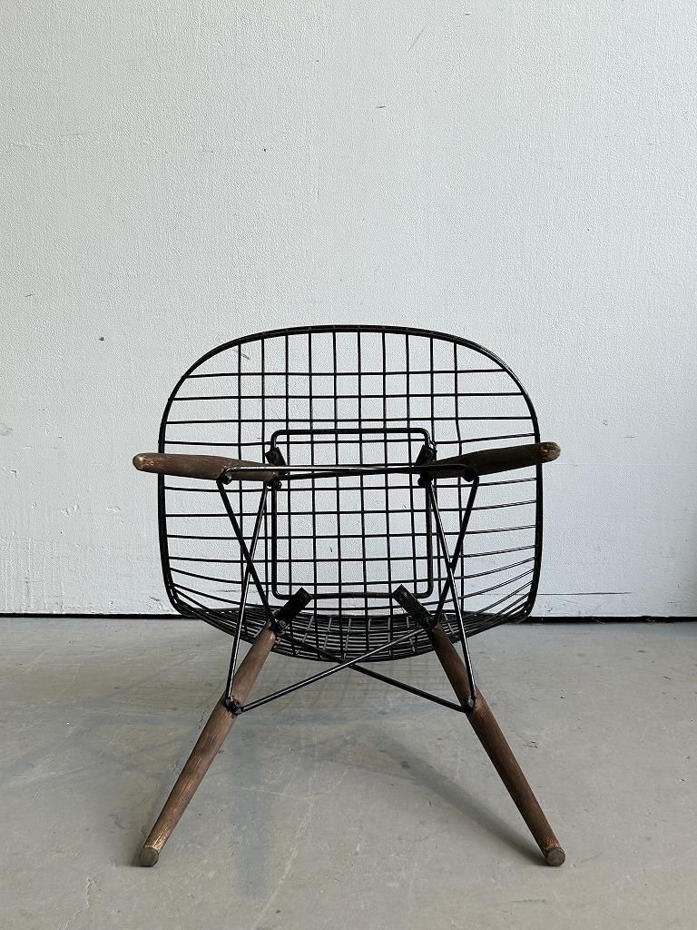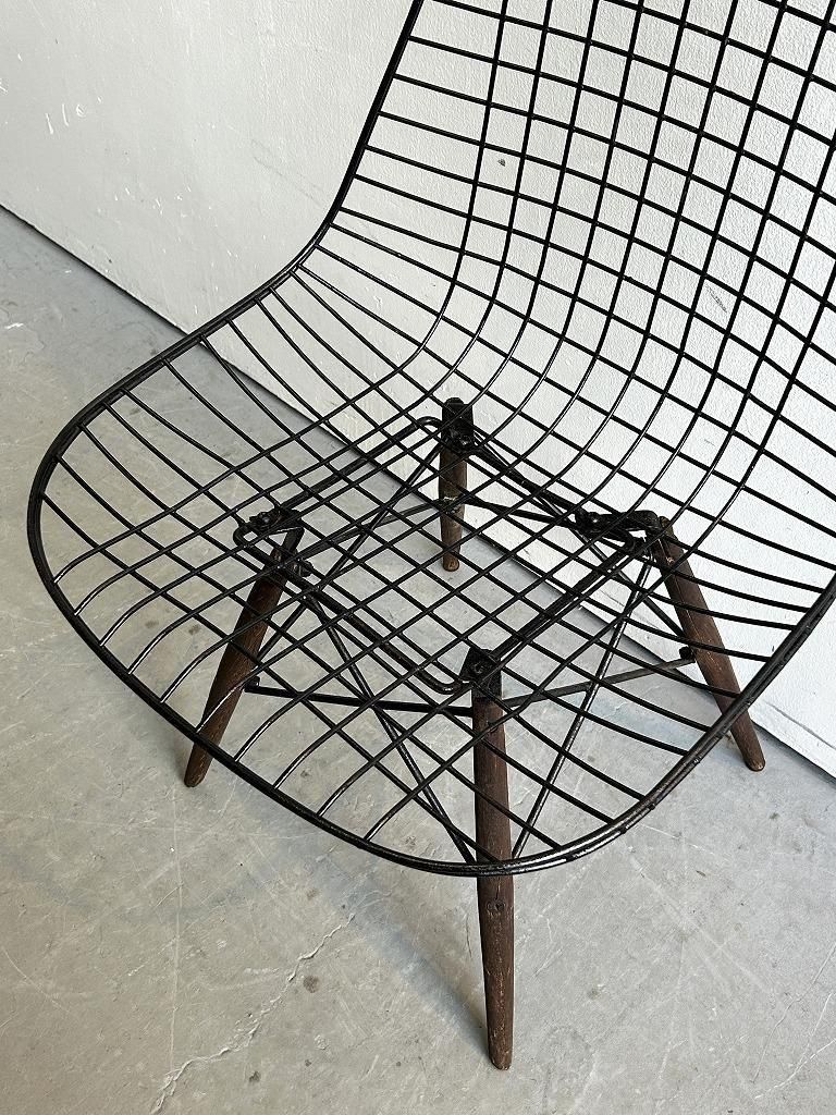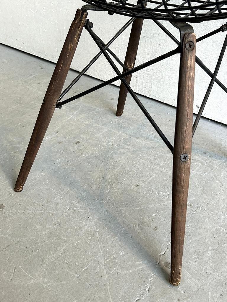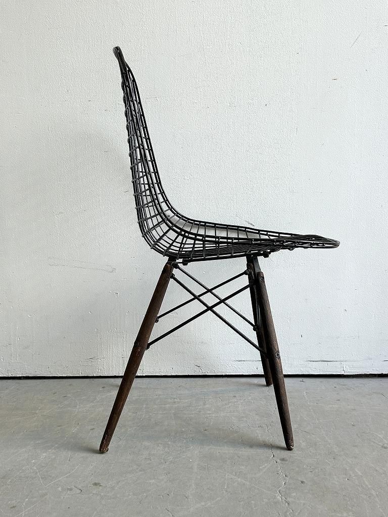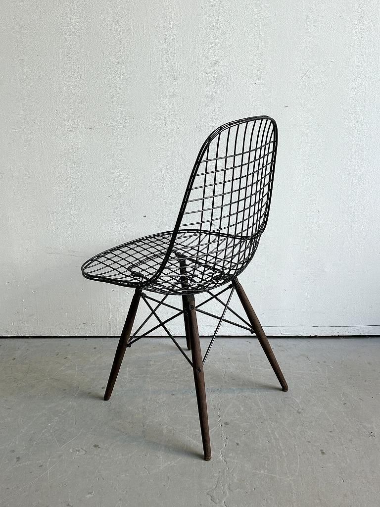 1950年代に Charles & Ray Eames(チャールズ&レイ・イームズ) によってデザインされた、ワイヤーシェルと木製レッグを組み合わせた DKW(Dining Height K-wire Wood Base)チェア。ワイヤーシェル専用に開発された希少な“ウッドダヴェルベース”を採用したモデルで、現在ではほとんど市場に出ない初期仕様です。