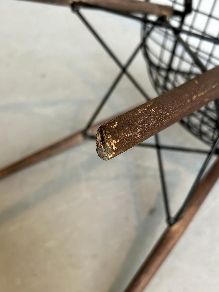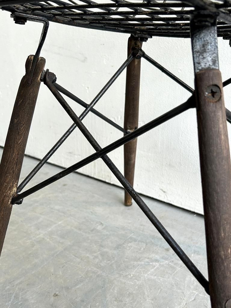 長い年月を経た鉄ワイヤーの酸化、木脚の摩耗、荒々しい金具のディテールなど、この年代ならではの素材感がしっかりと残り、オブジェとして非常に存在感のある佇まいです。座面下の補強金具も当時の構造を保っており、ディスプレイ用として空間に強い存在感を与えます。