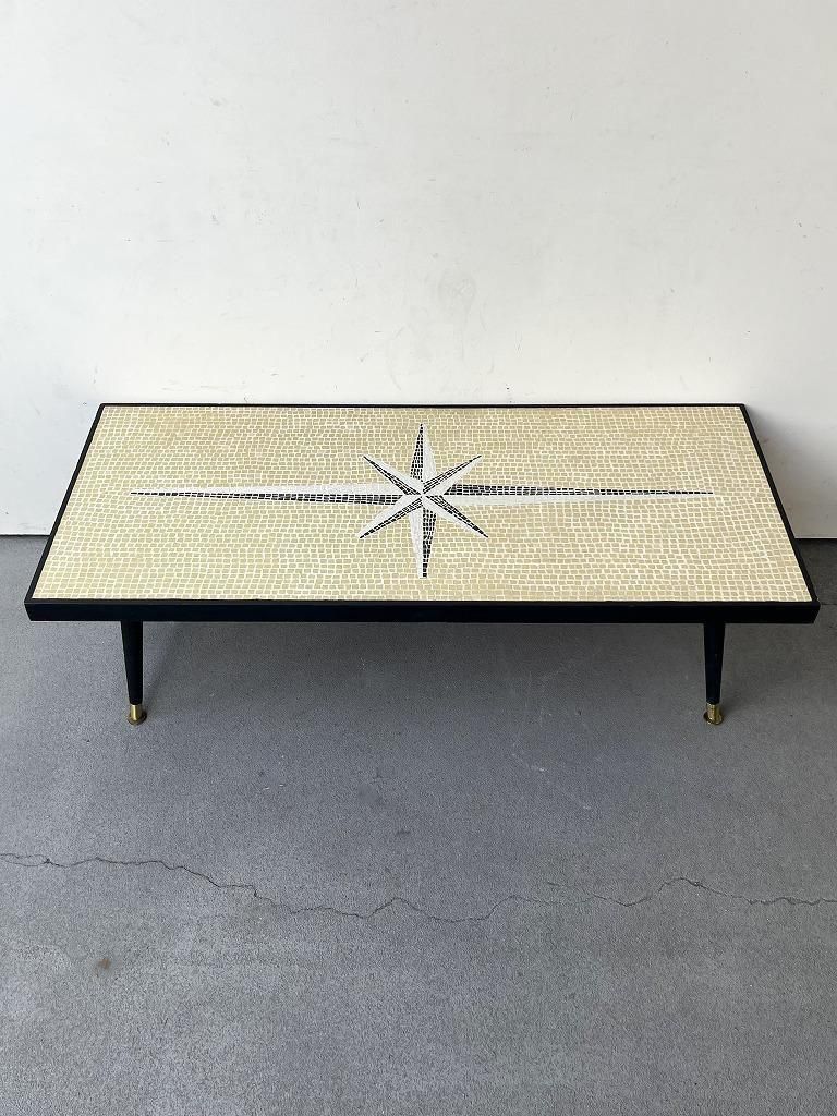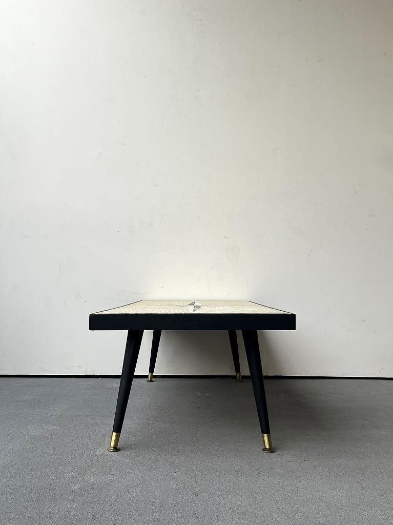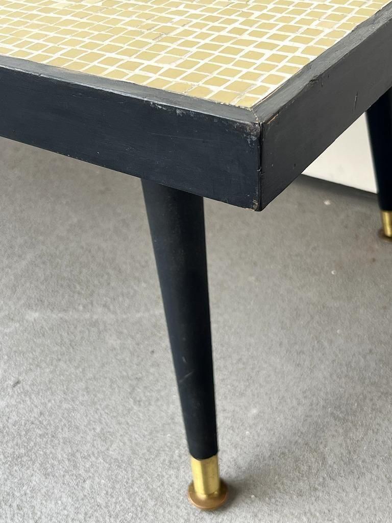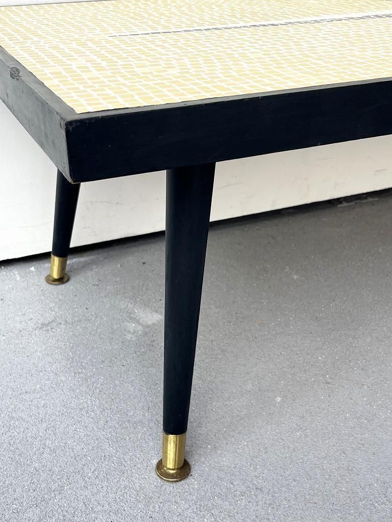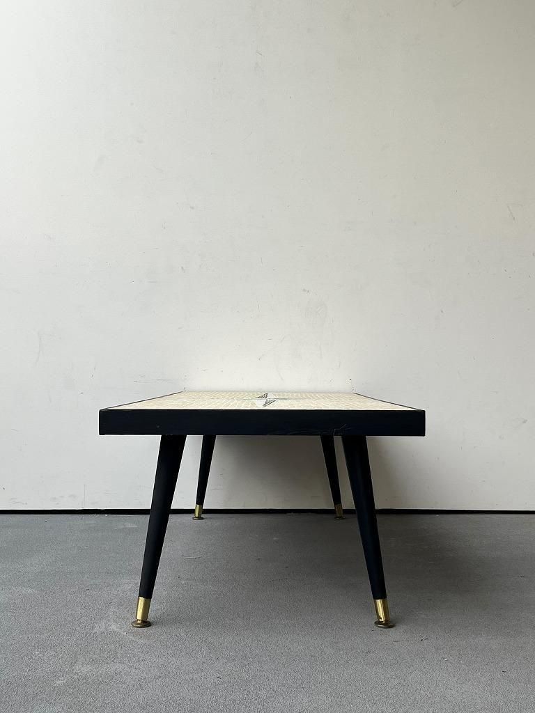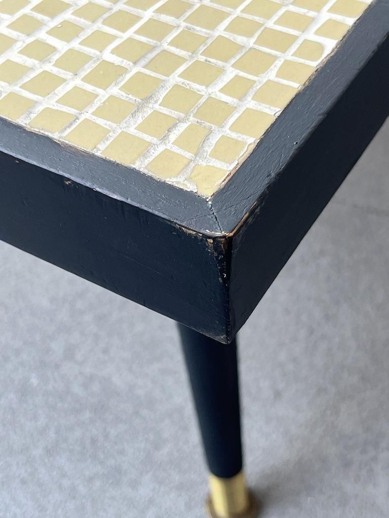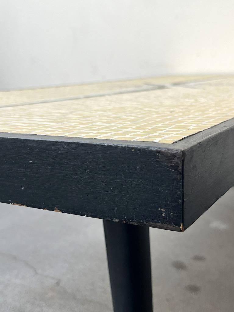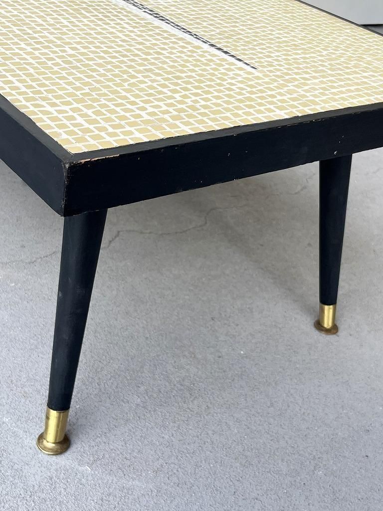 当時流行したモザイクタイル天板と、細身のテーパードレッグを組み合わせた、ミッドセンチュリー期の典型的なスタイルの一台。