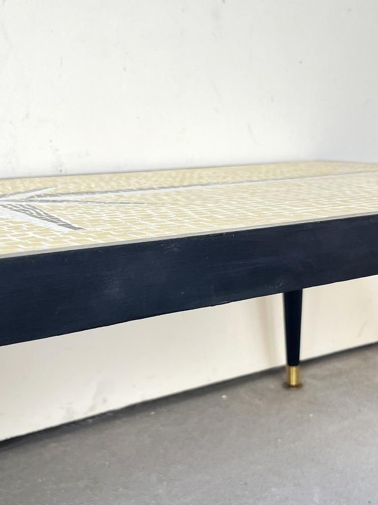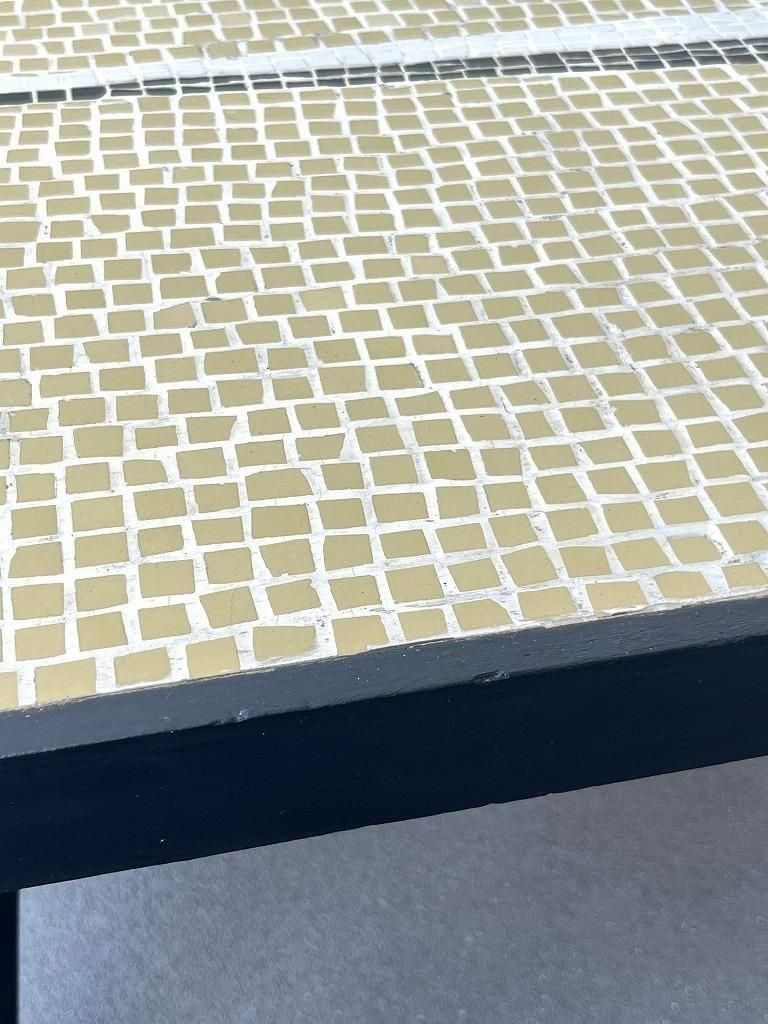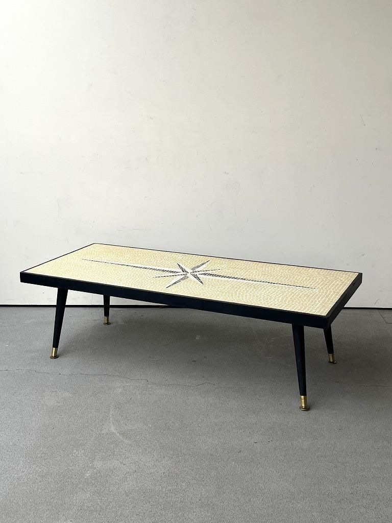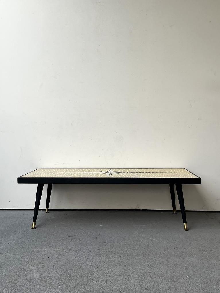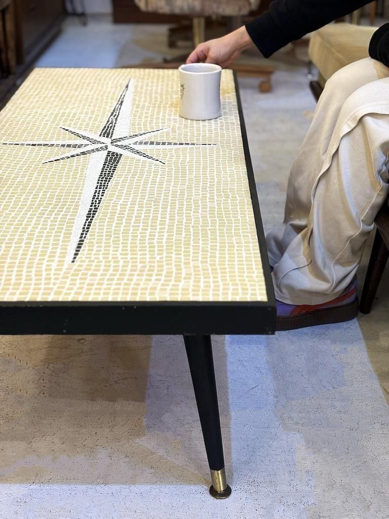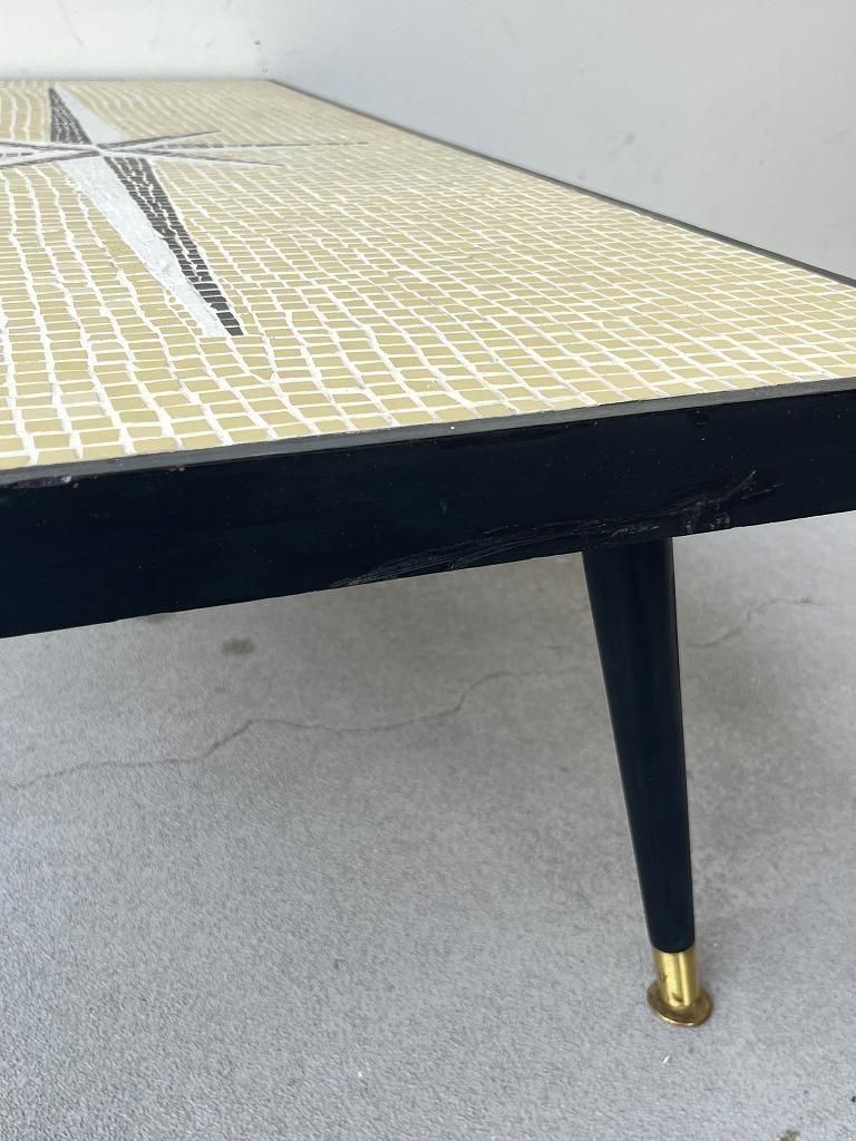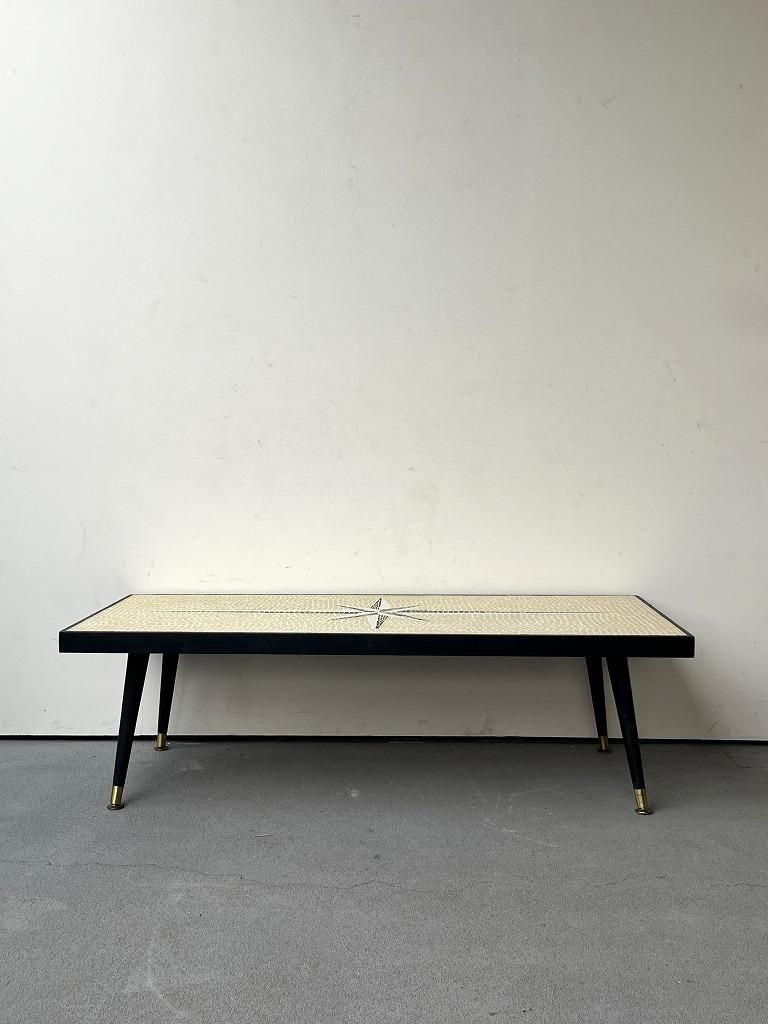当時流行したモザイクタイル天板と、細身のテーパードレッグを組み合わせた、ミッドセンチュリー期の典型的なスタイルの一台。