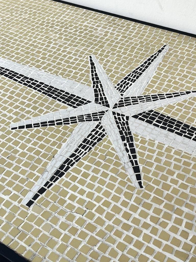 天板には、1950年代の住宅やダイナーでも人気を博したモザイクタイルワークが丁寧に施され、中央にはシンボリックなコンパススターが描かれています。このスターバーストモチーフは、宇宙開発や未来志向への関心が高まった当時のアメリカ文化を象徴するデザイン要素で、年代の真実味を感じさせてくれます。