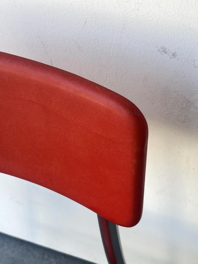 アメリカの老舗家具メーカー Heywood-Wakefield社が、戦後のスクールファニチャー向けに製造していたプラスチックチェアシリーズ。座面裏には同社独自の熱硬化性樹脂 “HeyWoodite” の刻印が入り、ベークライト(フェノール樹脂)をベースとした重厚な素材感が特徴です。