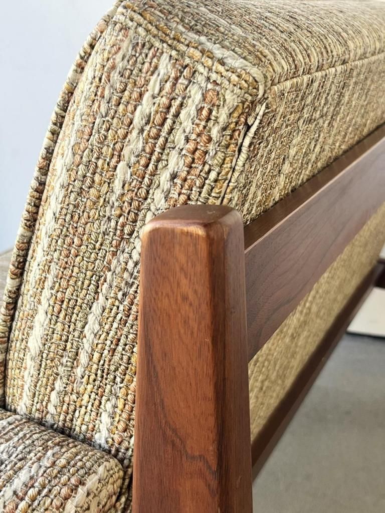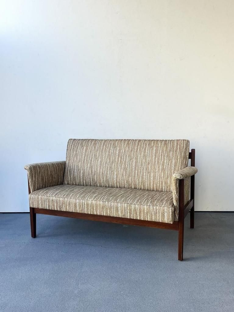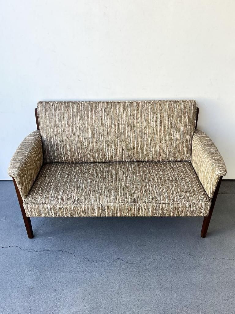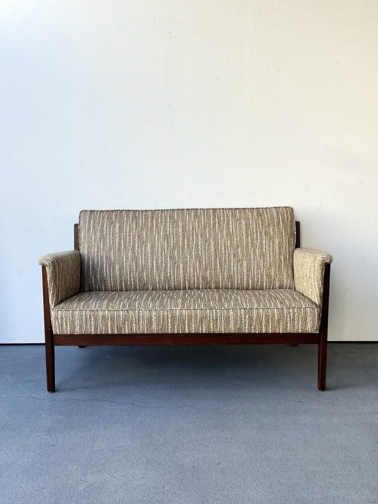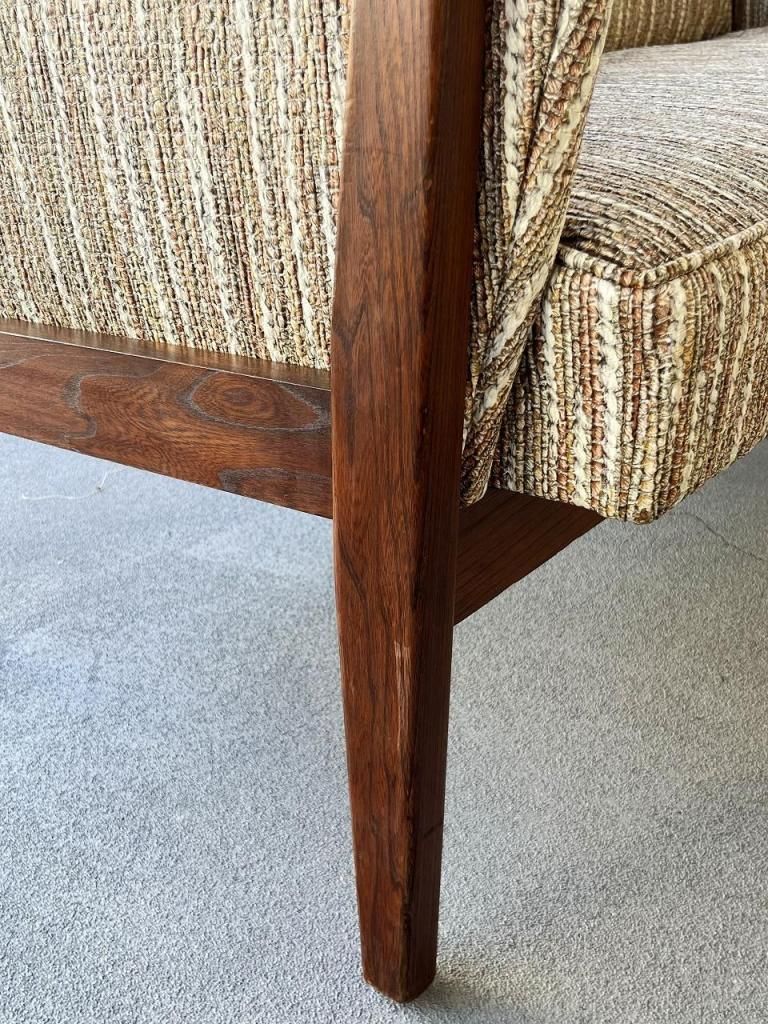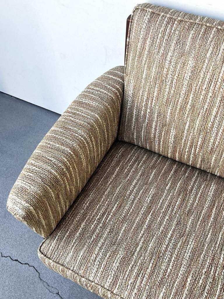 アメリカン・ミッドセンチュリー特有の直線と柔らかさのバランスが心地よい一台。端正なフレーム構造と優しい曲線を描くアーム、そして細身の脚部まで、当時の木製ソファのデザイン要素をしっかりと感じられます。