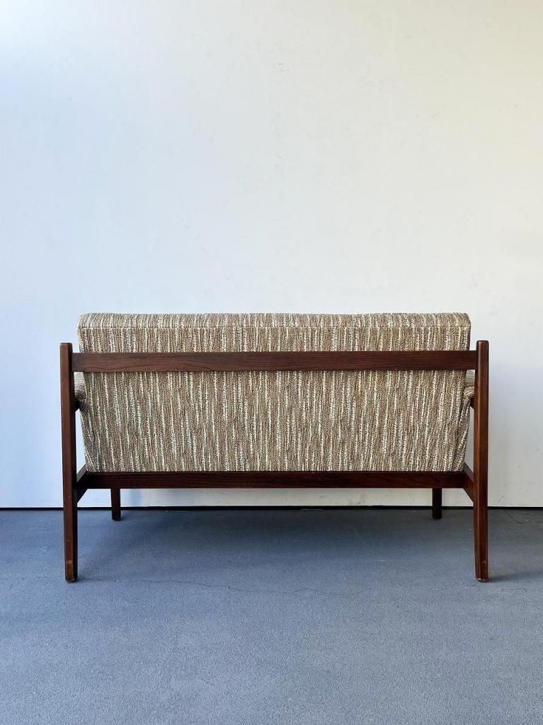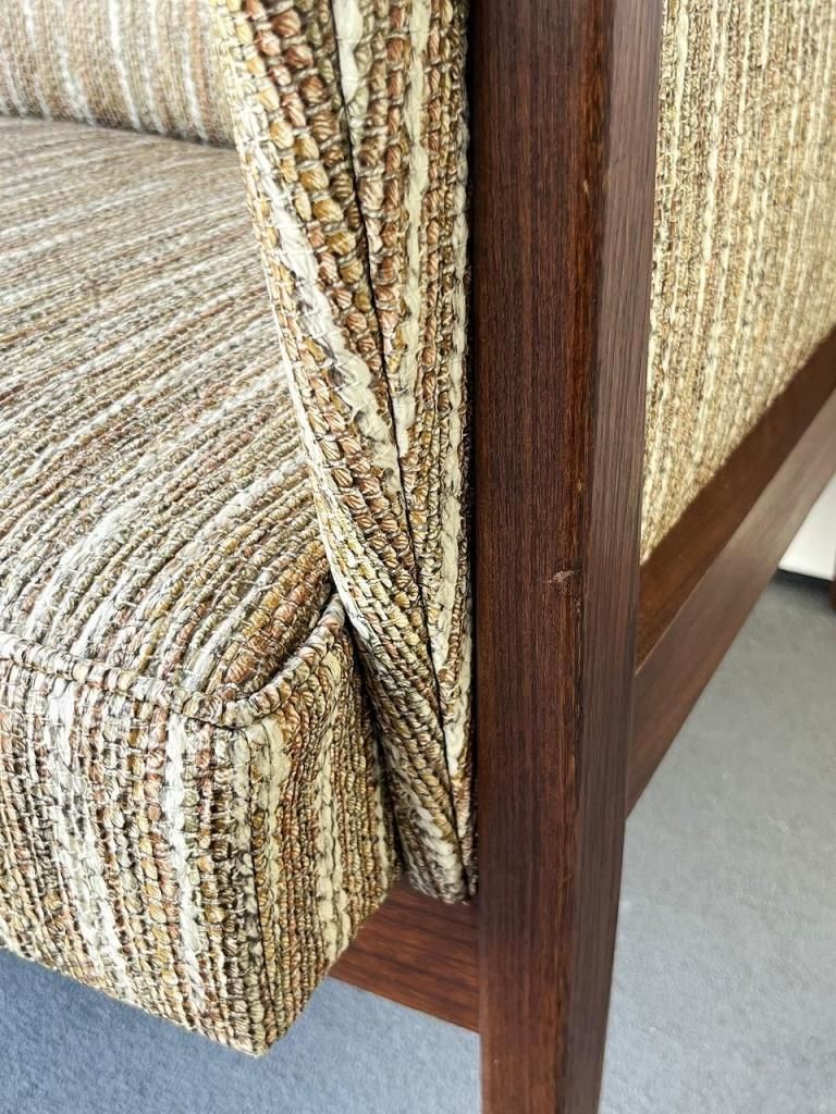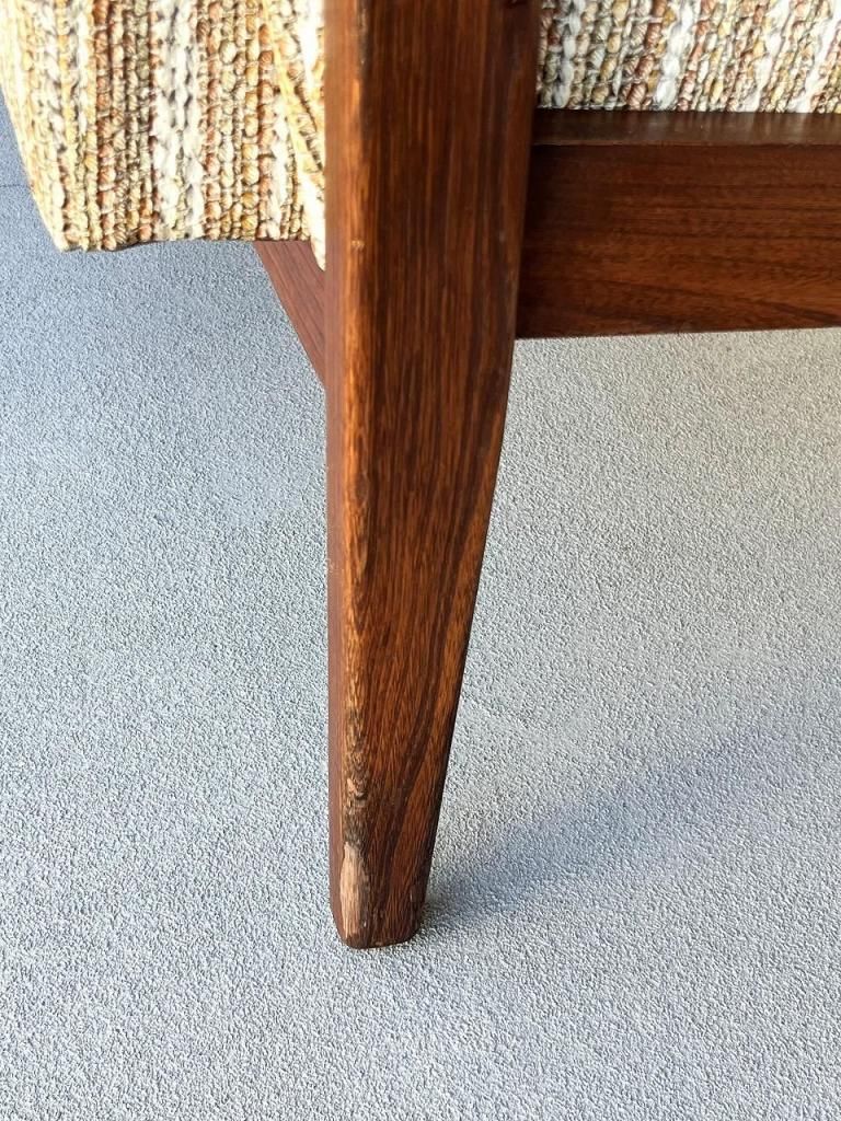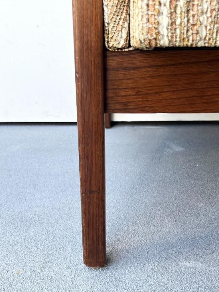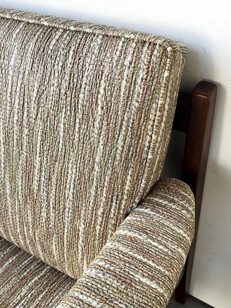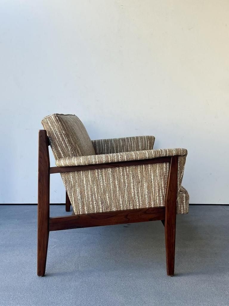 アメリカン・ミッドセンチュリー特有の直線と柔らかさのバランスが心地よい一台。端正なフレーム構造と優しい曲線を描くアーム、そして細身の脚部まで、当時の木製ソファのデザイン要素をしっかりと感じられます。