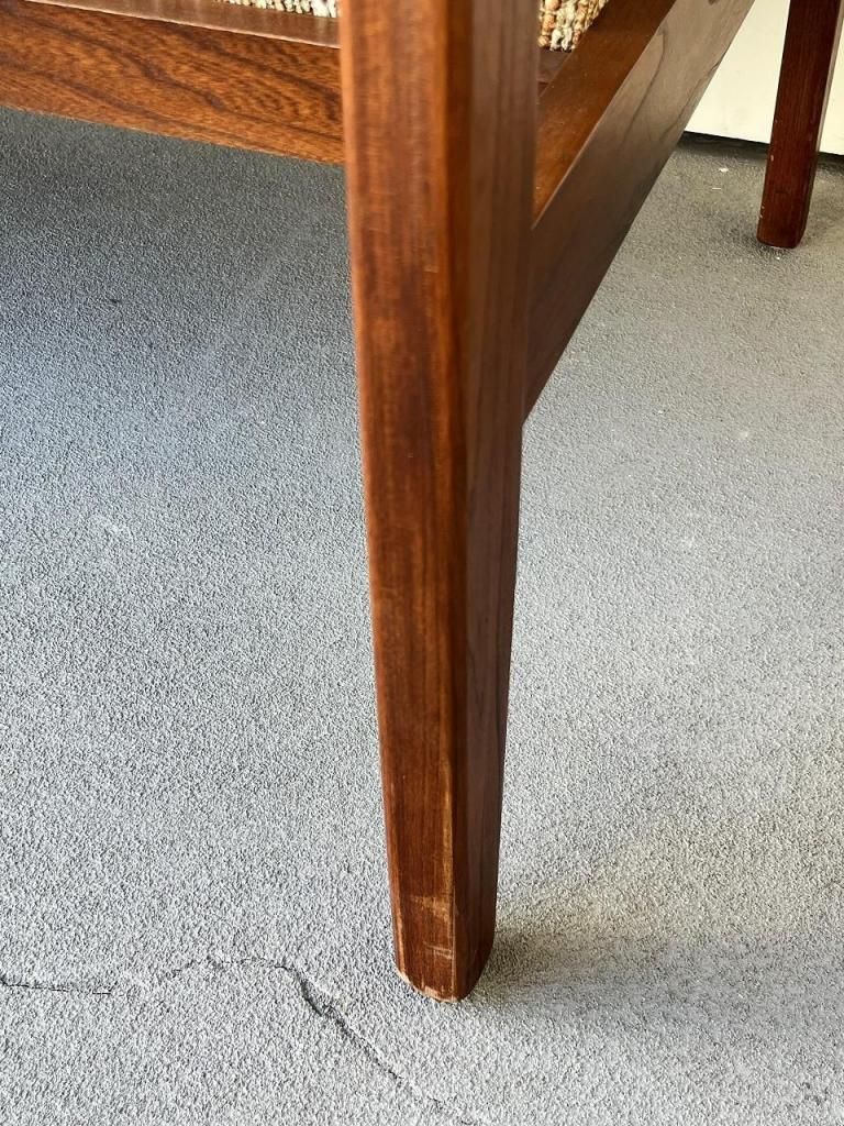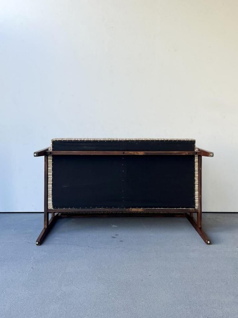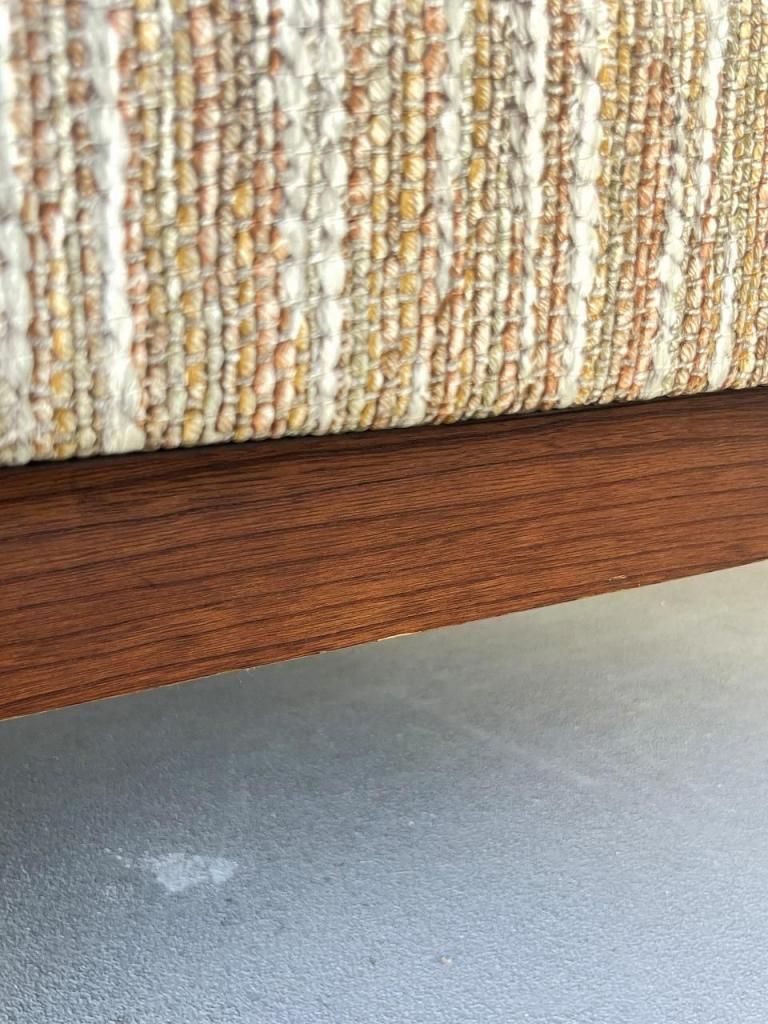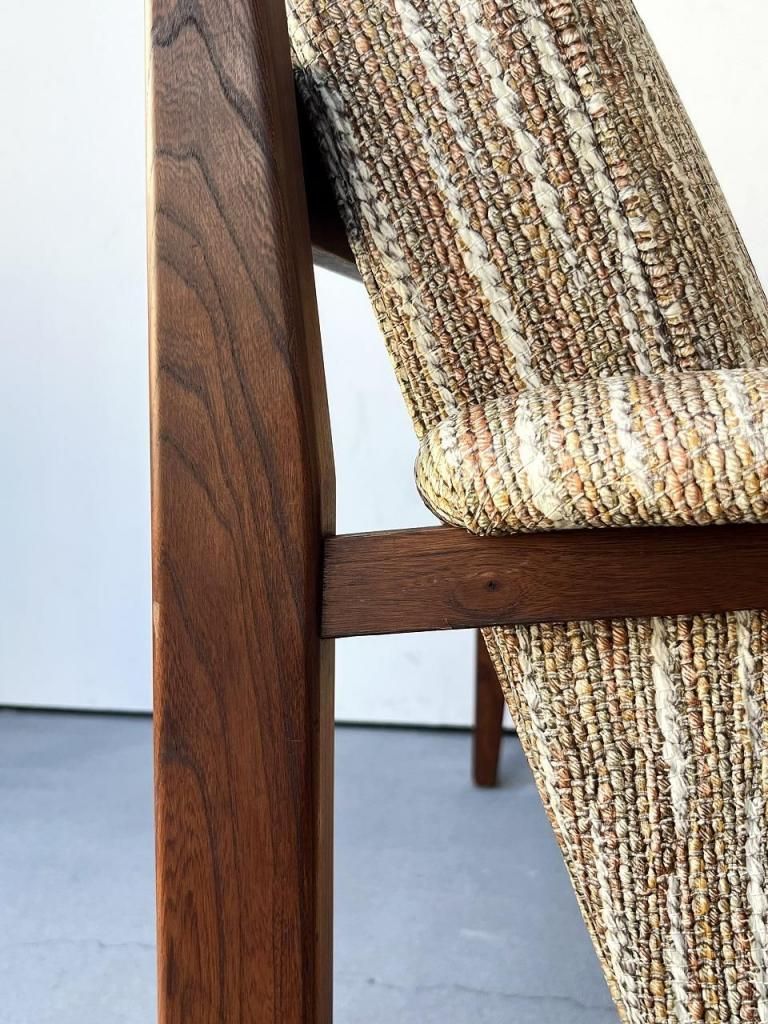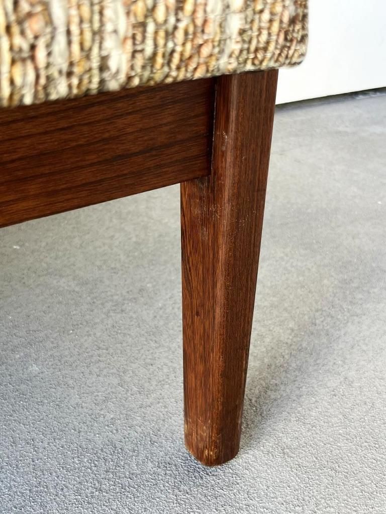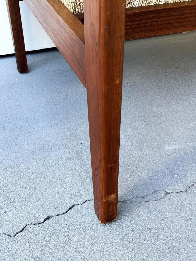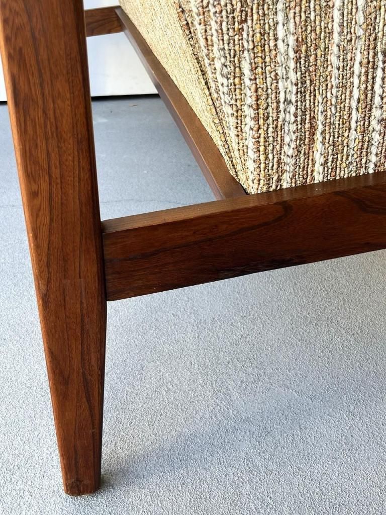 アメリカン・ミッドセンチュリー特有の直線と柔らかさのバランスが心地よい一台。端正なフレーム構造と優しい曲線を描くアーム、そして細身の脚部まで、当時の木製ソファのデザイン要素をしっかりと感じられます。