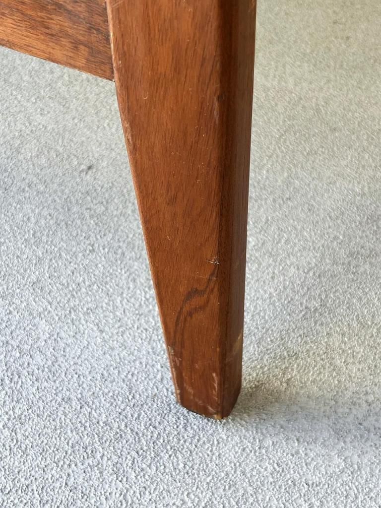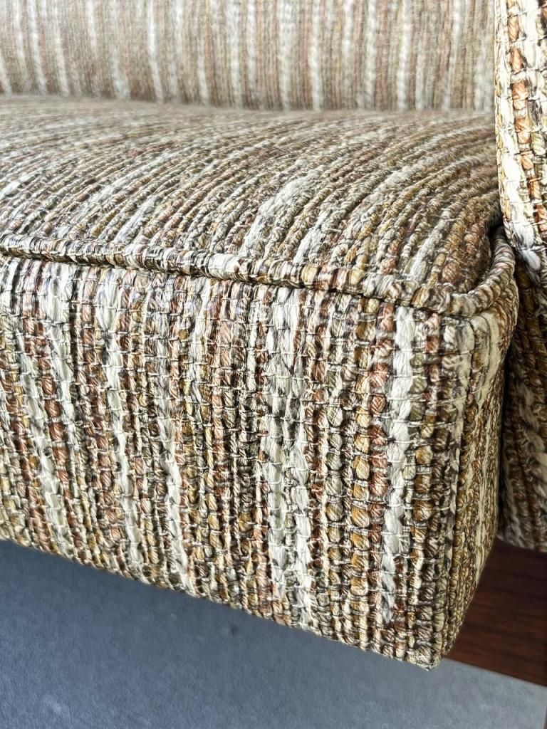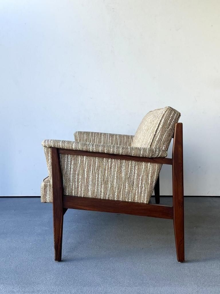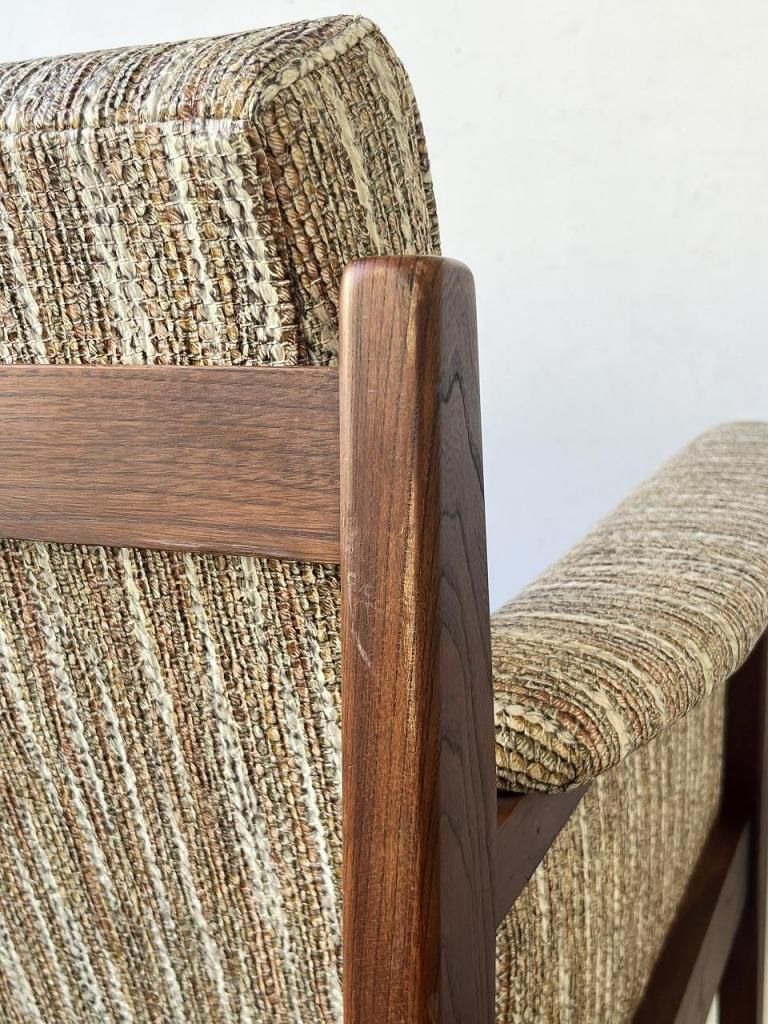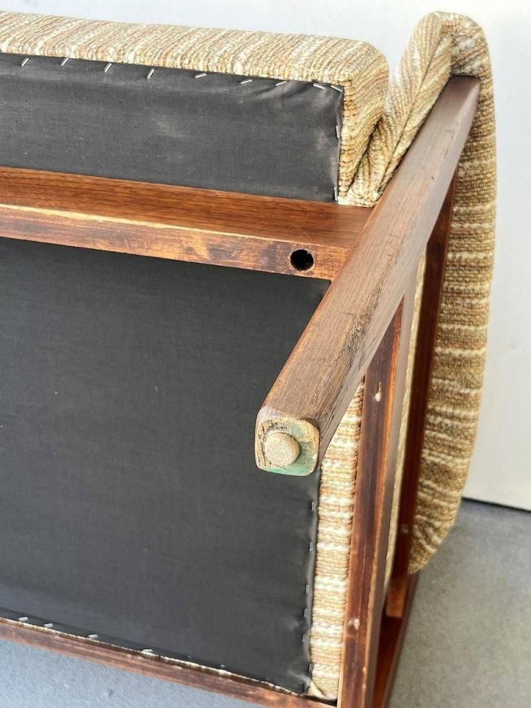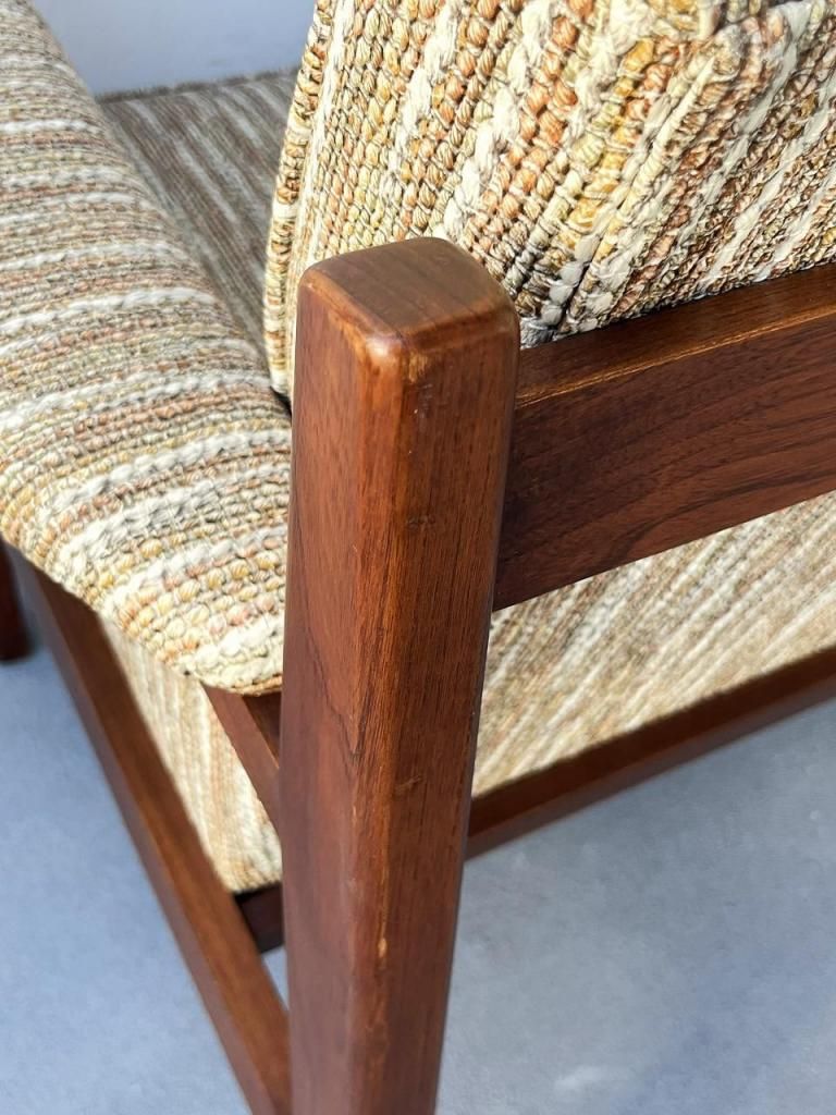 アメリカン・ミッドセンチュリー特有の直線と柔らかさのバランスが心地よい一台。端正なフレーム構造と優しい曲線を描くアーム、そして細身の脚部まで、当時の木製ソファのデザイン要素をしっかりと感じられます。