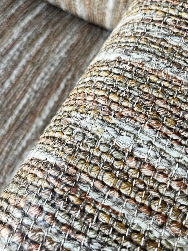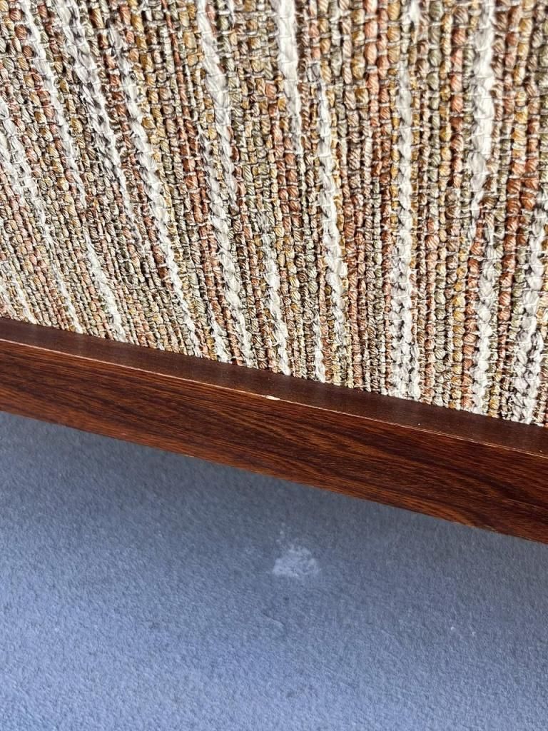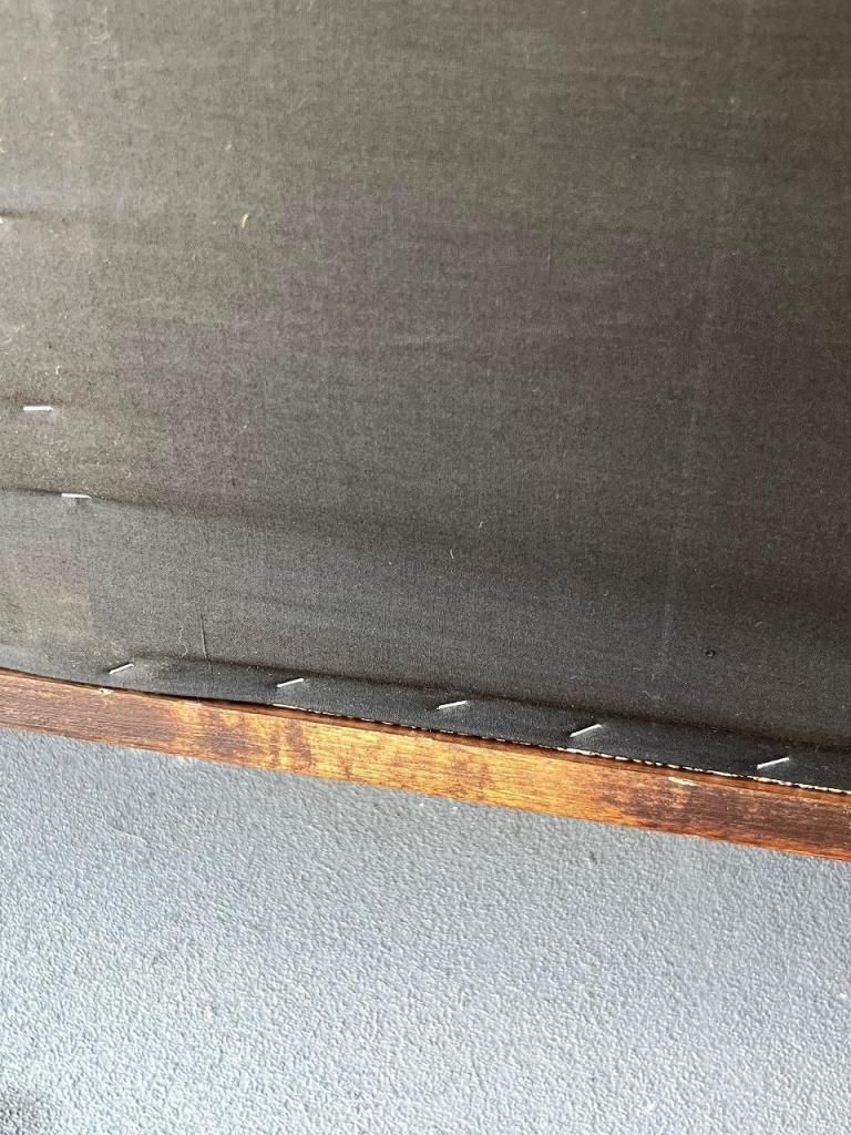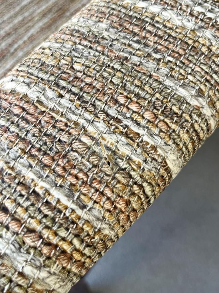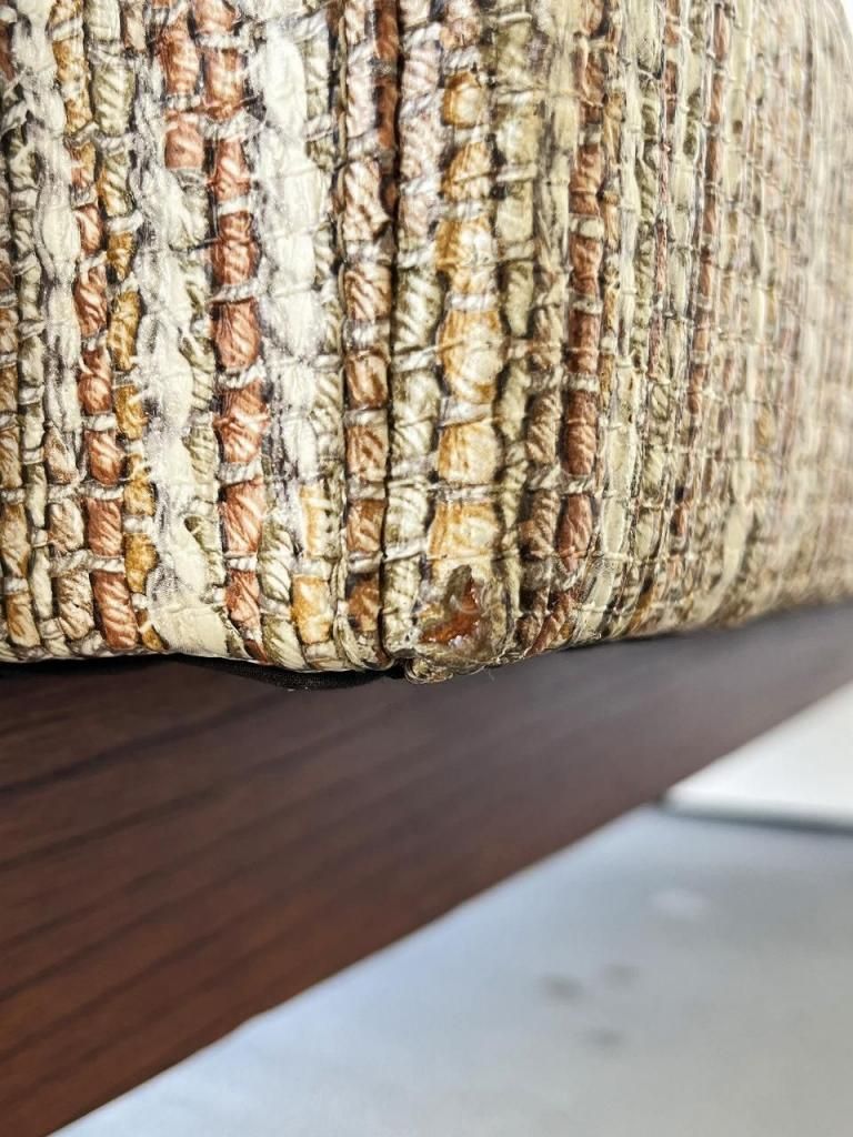 一見するとファブリックのように見える張り地ですが、こちらはPVC(ビニールレザー)仕上げ。独特のざらっとした織り柄をプリントで表現しており、1950-60年代のアメリカでよく見られたテキスタイルの質感をフェイクレザーに落とし込む遊び心あるデザイン手法が魅力です。