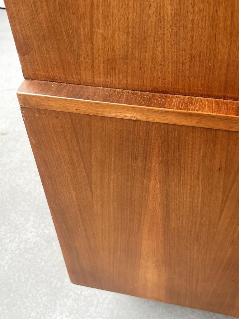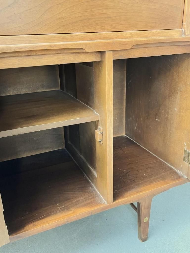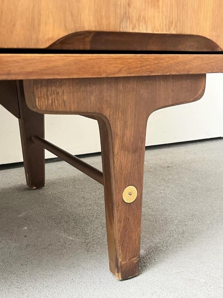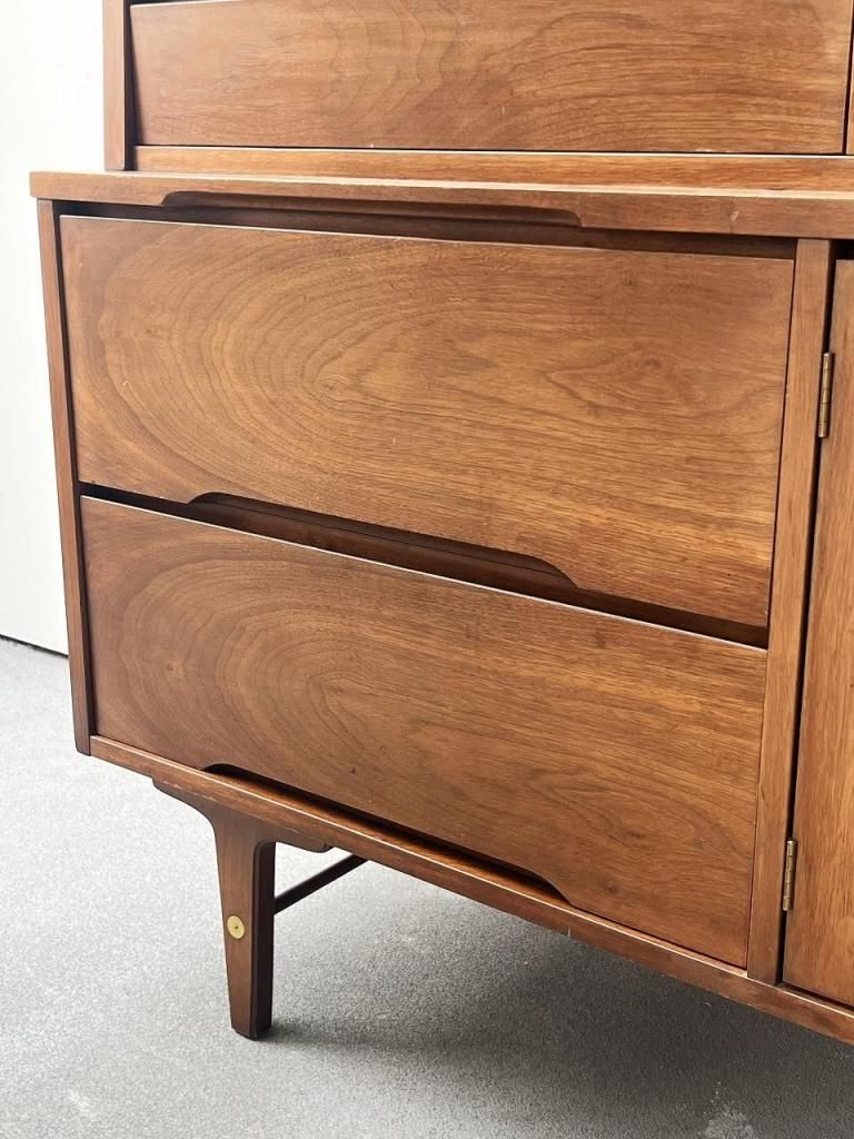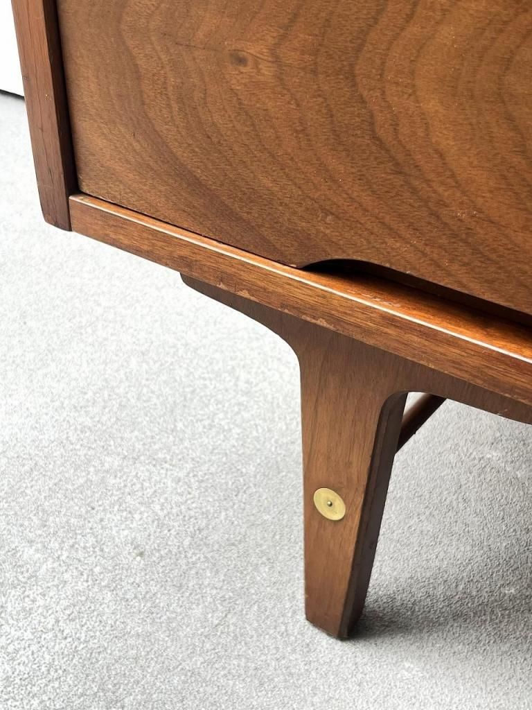 ウォールナットを主材に、脚部にワッシャーのような真鍮装飾が施されたStanley Furnitureらしいディティールの1台。