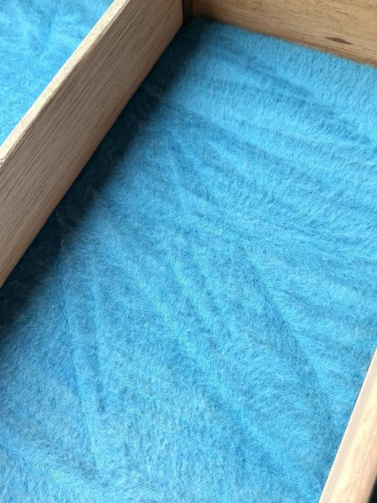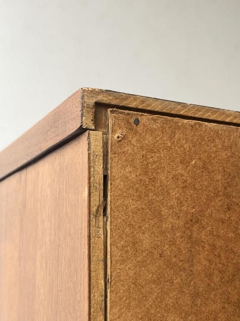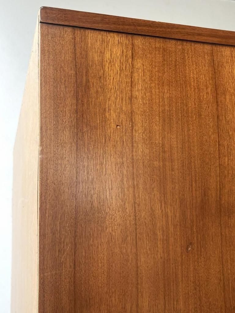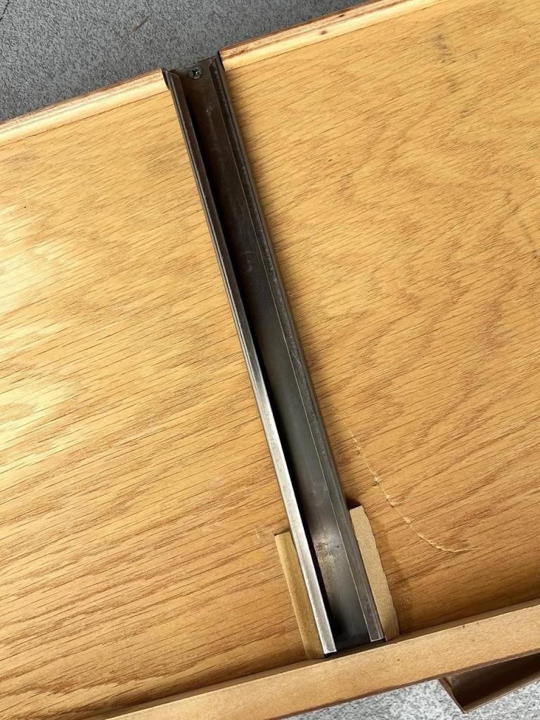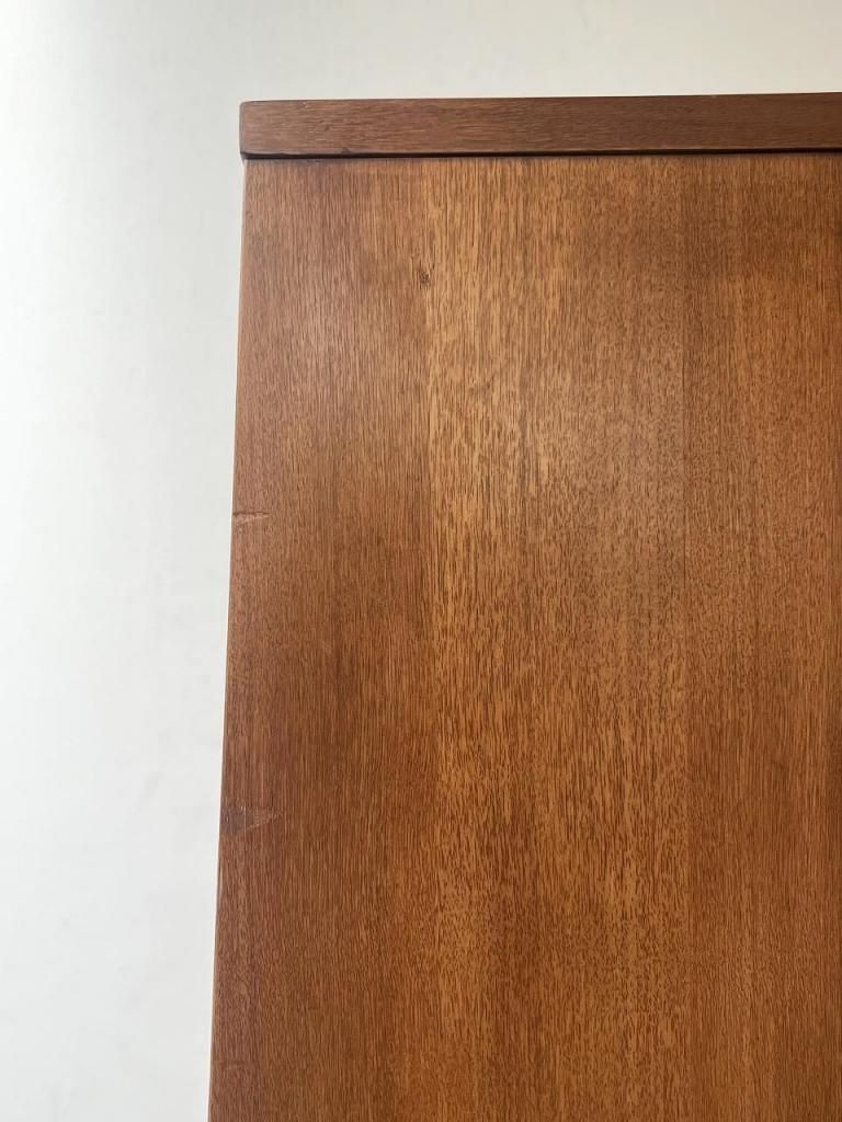 引き出し・扉には金具ハンドルではなく、彫り込んで持ち手形状を作るミニマルな意匠。スタンレー社の象徴的なディテールであり、北欧ミッドセンチュリーのような空気感も感じられます。