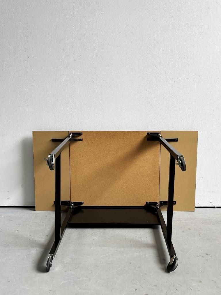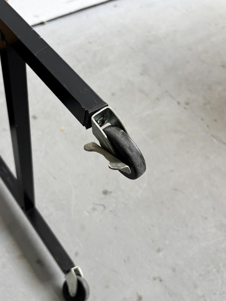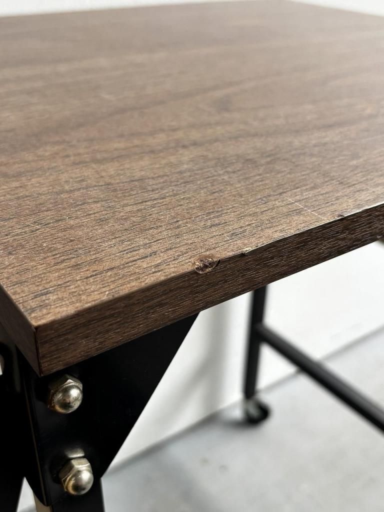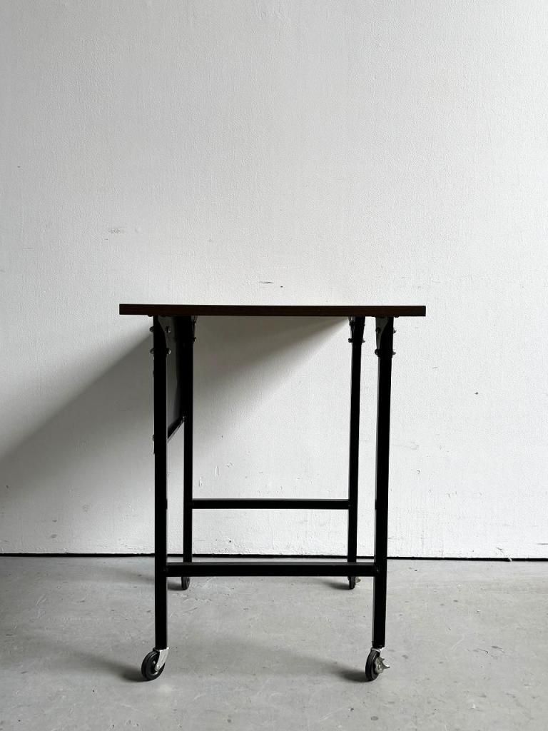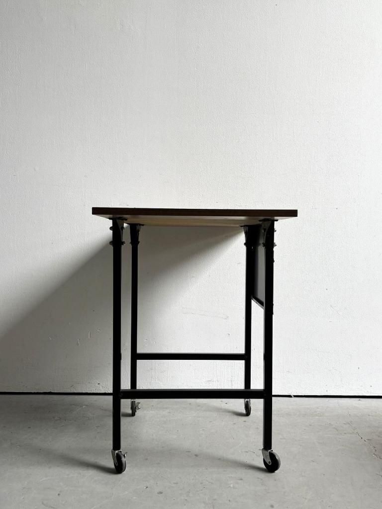 木目調の天板に、ブラックスチールの脚部を組み合わせたシンプルな作りで、キャスター付きのため移動もスムーズ。すっきりとしたシルエットのためお部屋にも取り入れやすいサイズ感もポイントです。