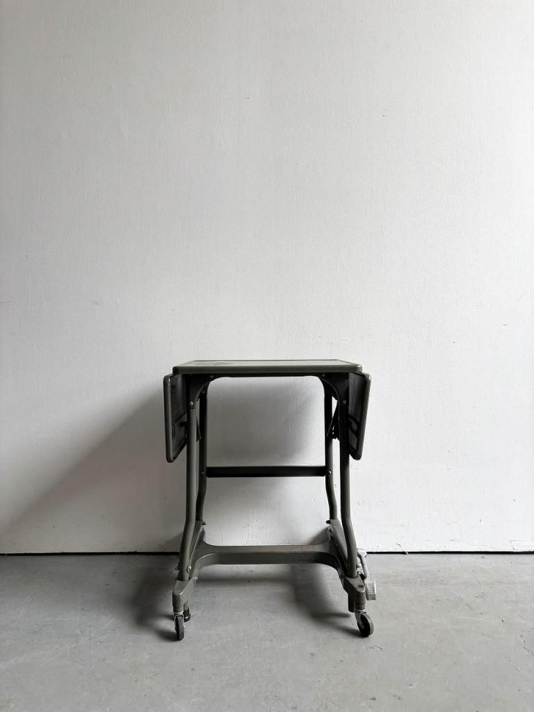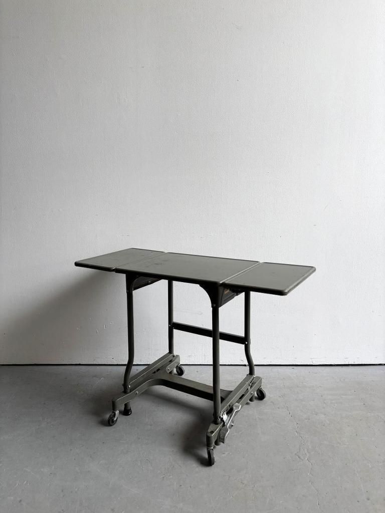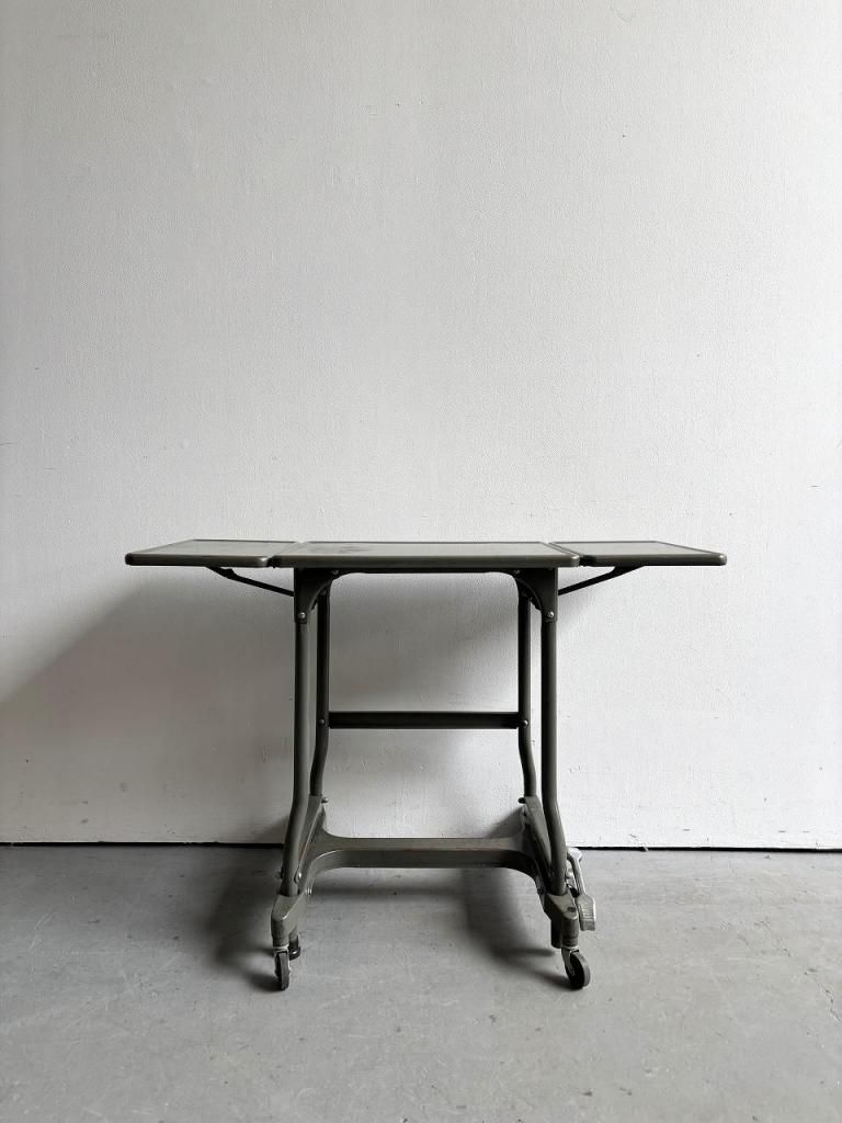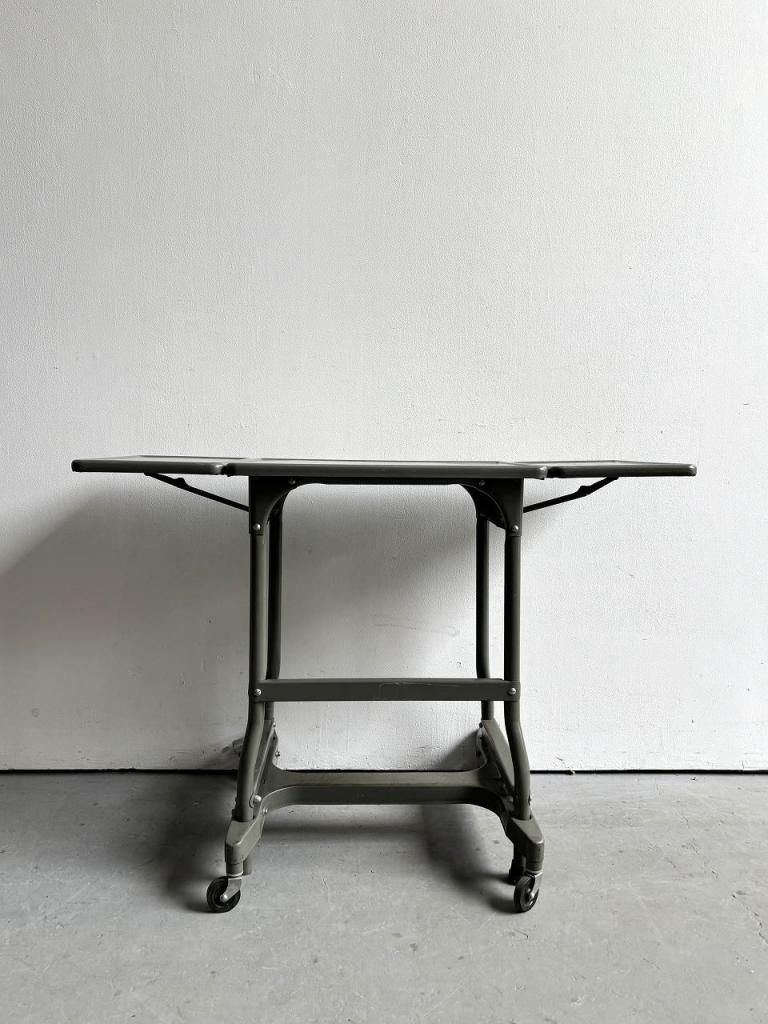軽く上に持ち上げると天板の両側が折りたためるバタフライタイプの作りで、スチールならではの無骨さと、用途に応じて左右の天板を拡張できる優れた機能性を併せ持っています。