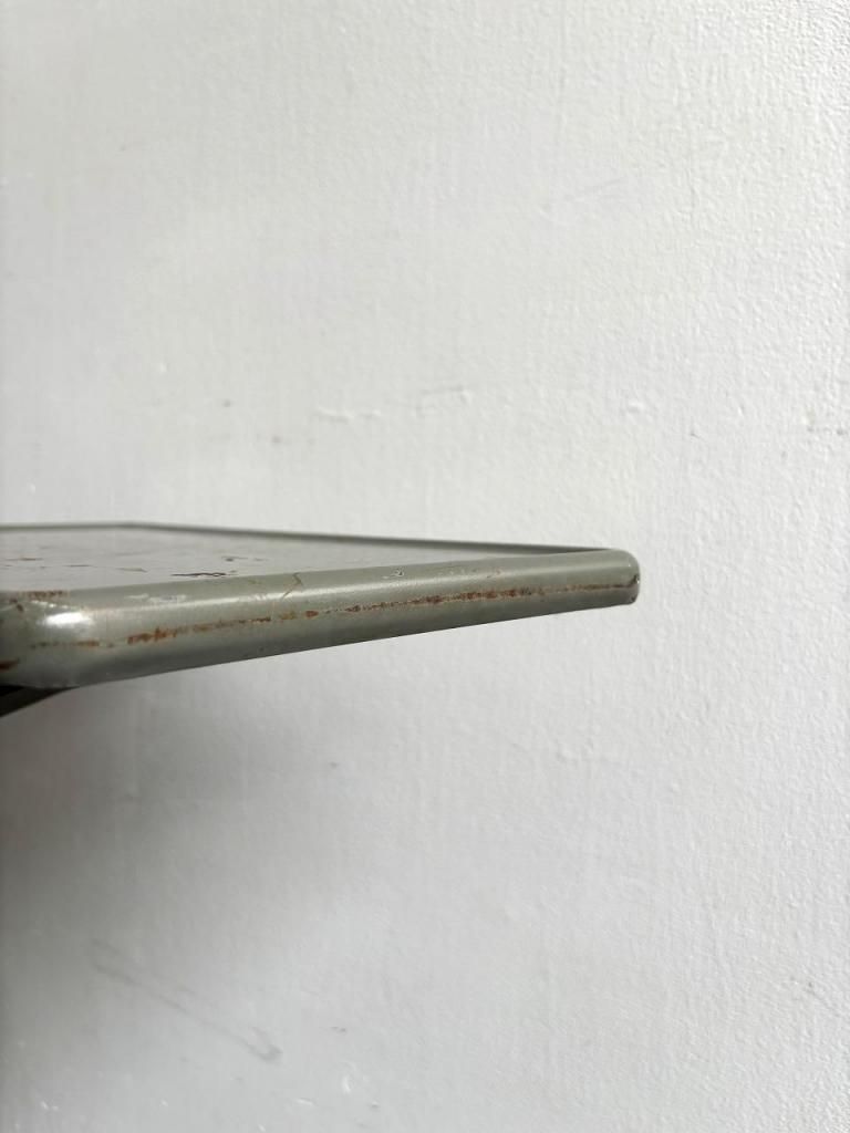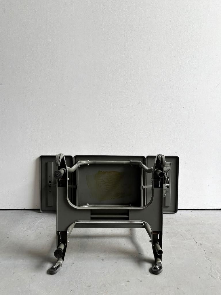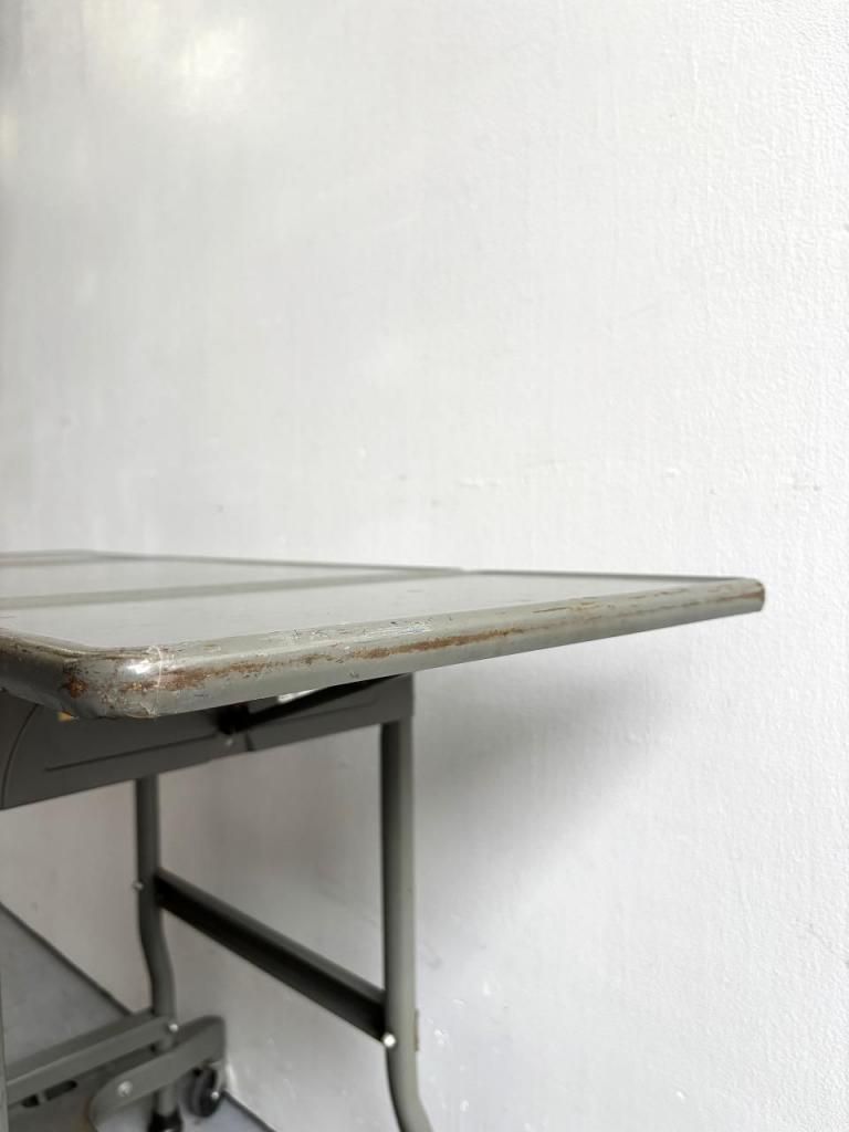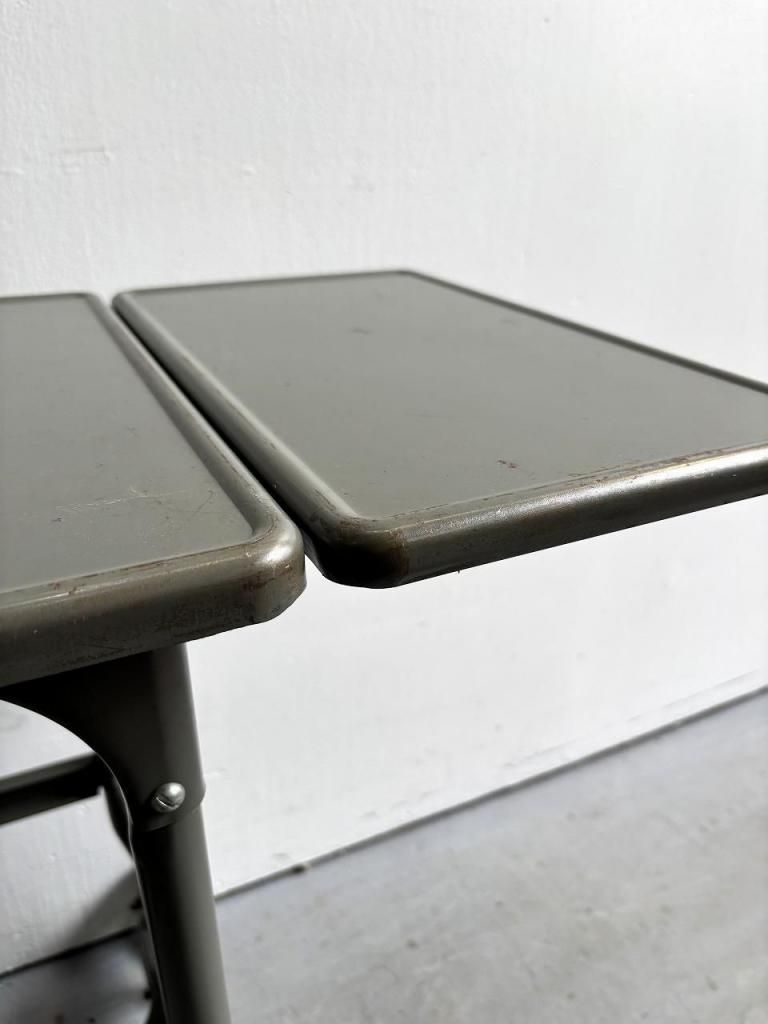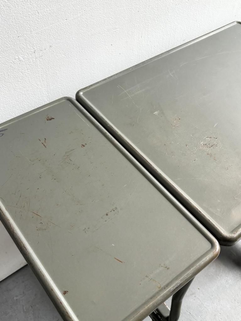 軽く上に持ち上げると天板の両側が折りたためるバタフライタイプの作りで、スチールならではの無骨さと、用途に応じて左右の天板を拡張できる優れた機能性を併せ持っています。
