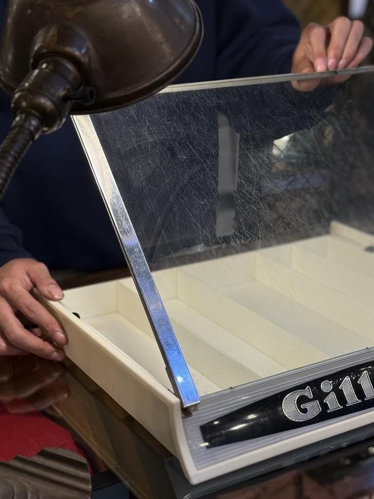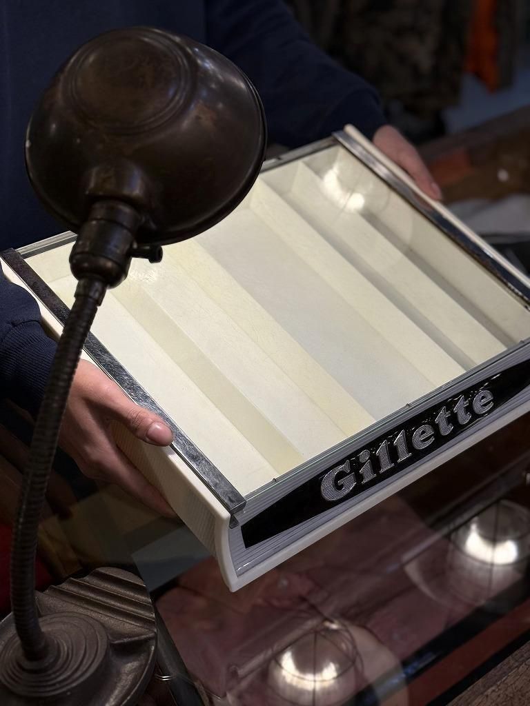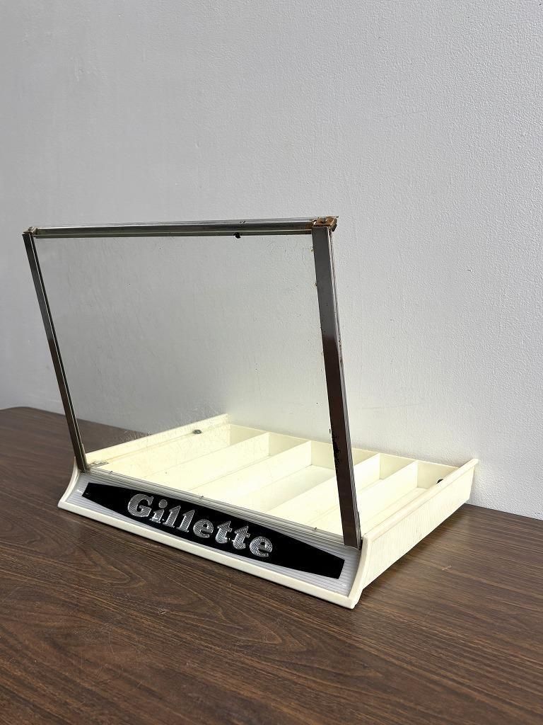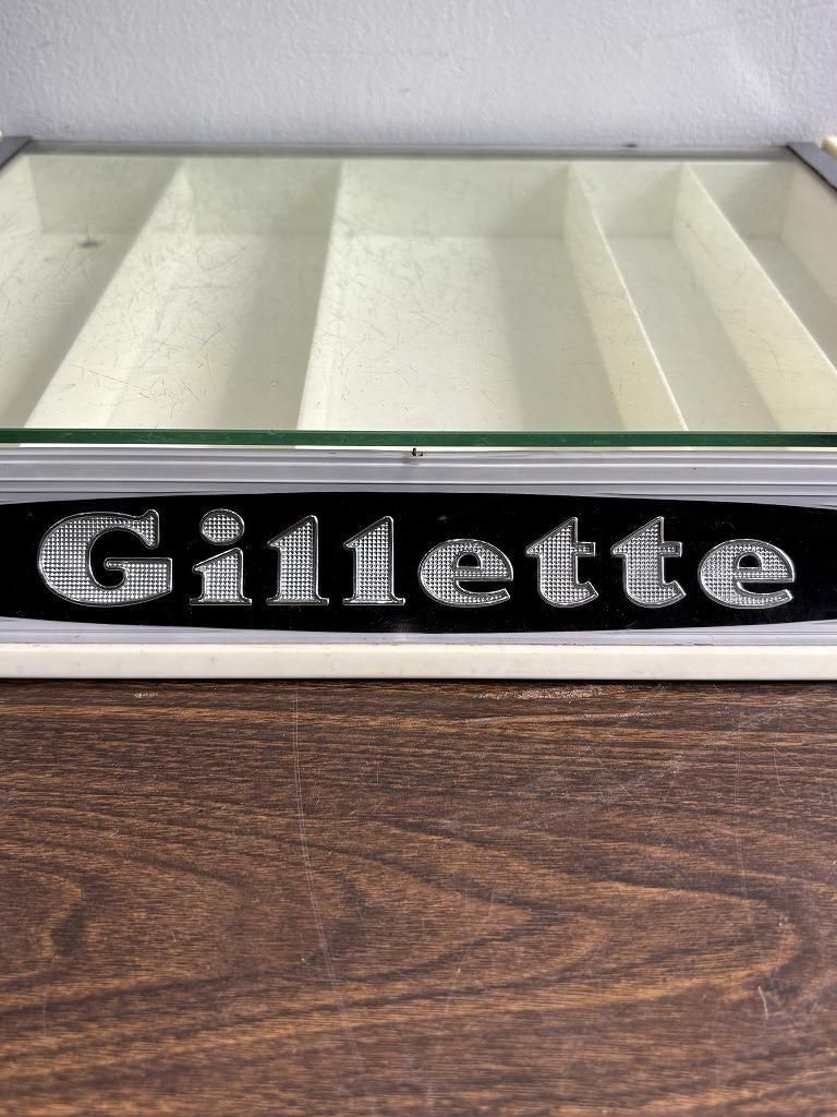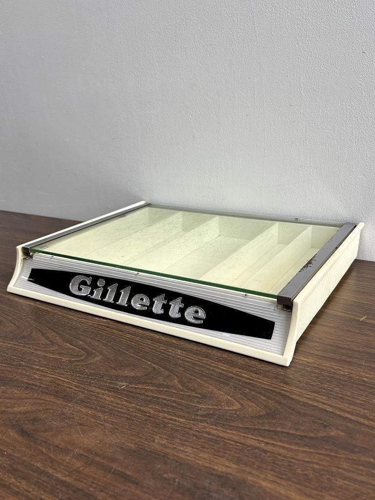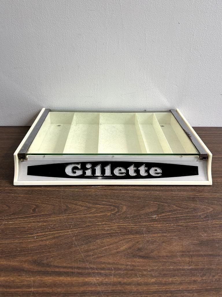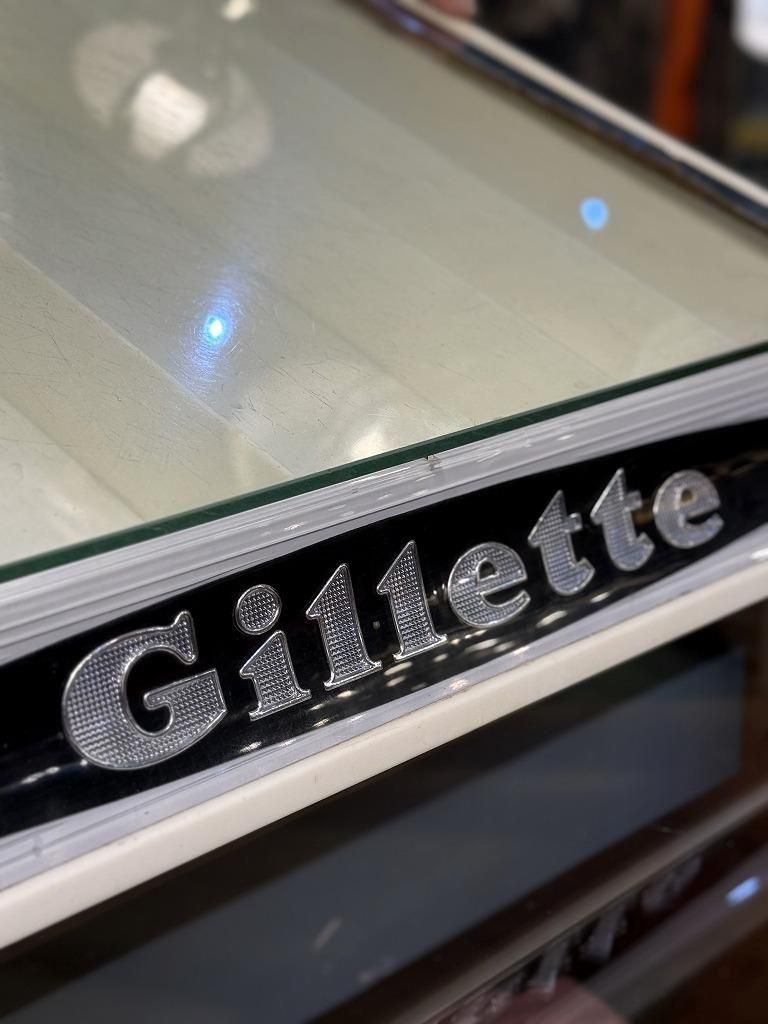 前面には象徴的なGilletteロゴがあしらわれ、当時の替刃やシェービングクリームを扱うバーバーショップのカウンターで使われていたであろうアイテム。