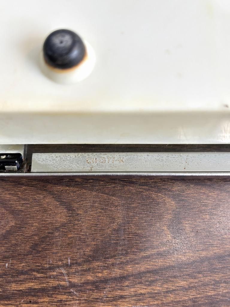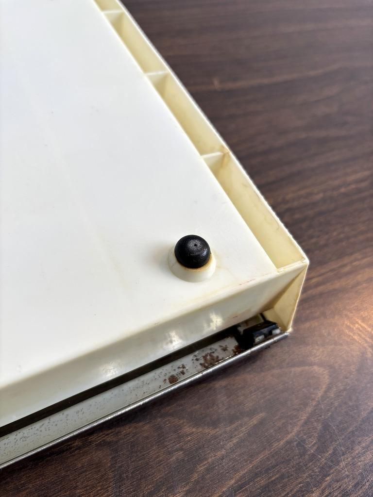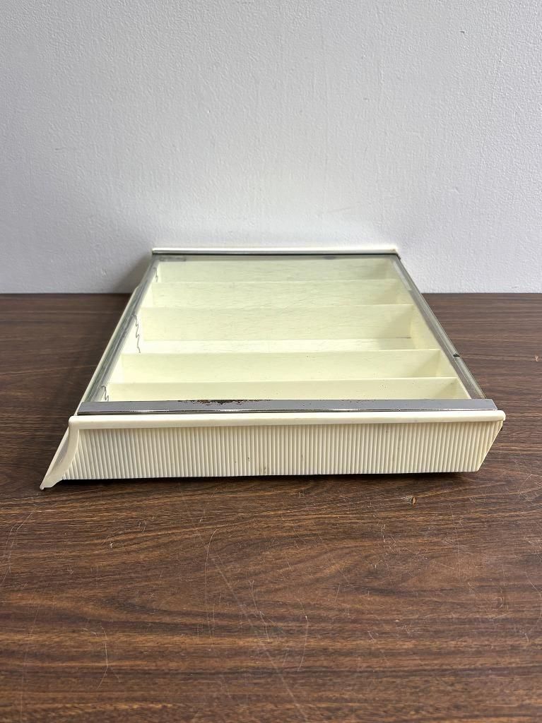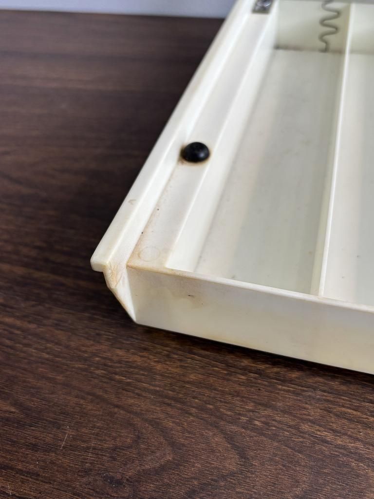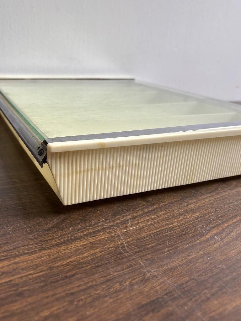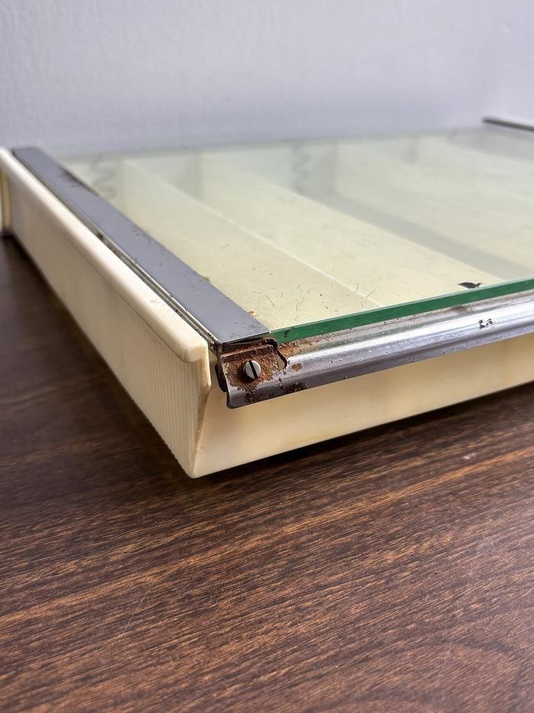 白い成型プラスチックのベースに、ガラスのトップパネル、クロームメタルのフレームを組み合わせた、この時代らしい実用性とモダンデザインが融合したプロダクトです。