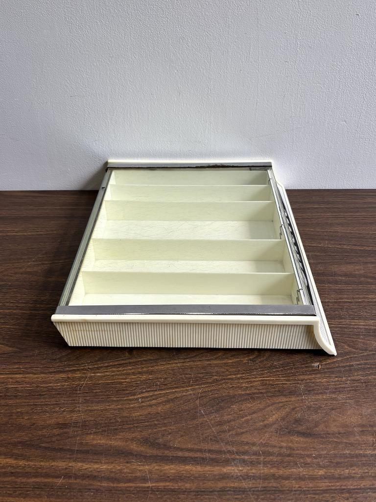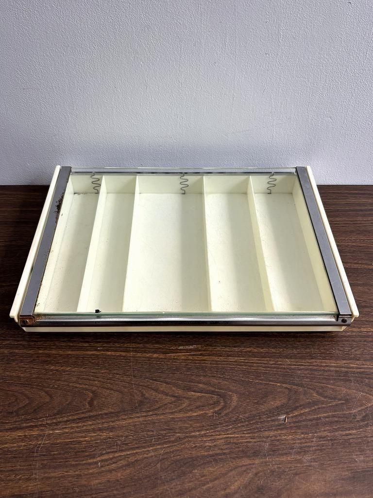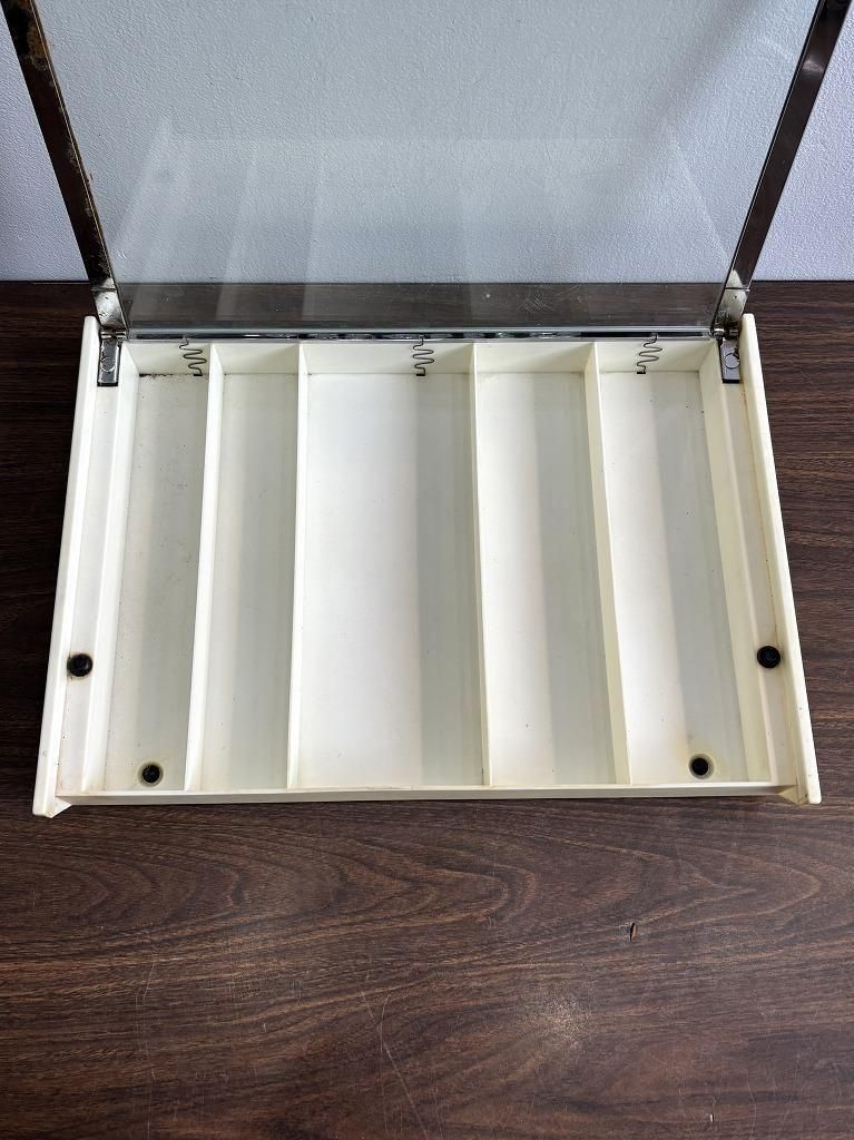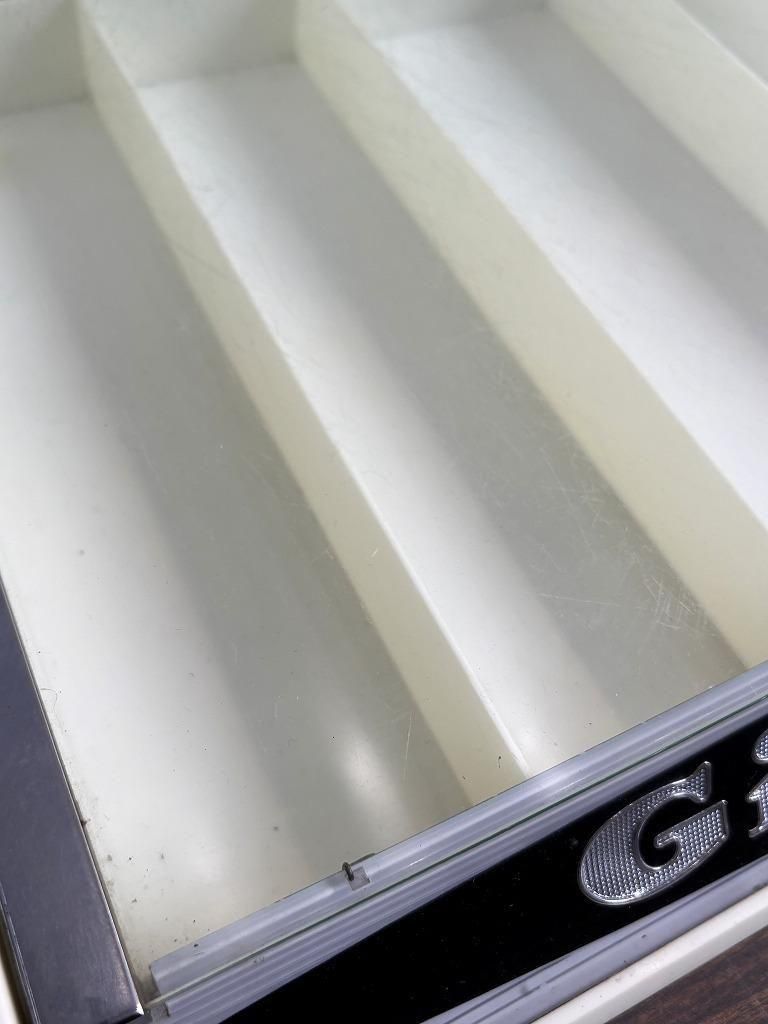 内部は細かく仕切られたトレイ構造で、替刃を整然と並べるためのプッシュ機構(後部のバネ)が残っており、商業什器としてのリアルな機能美が感じられます。