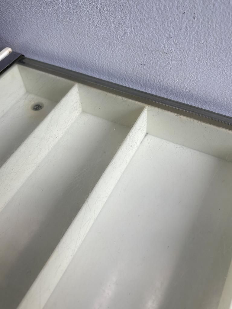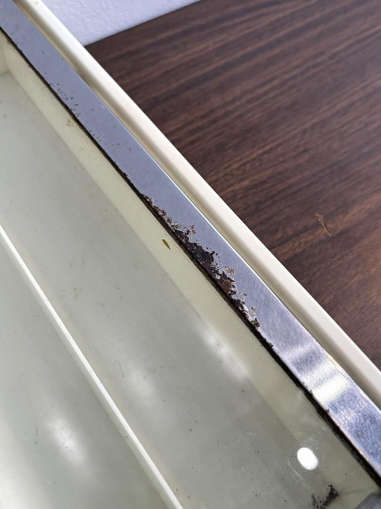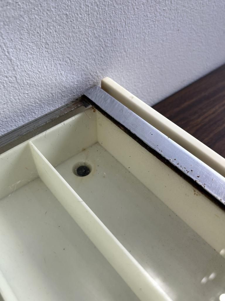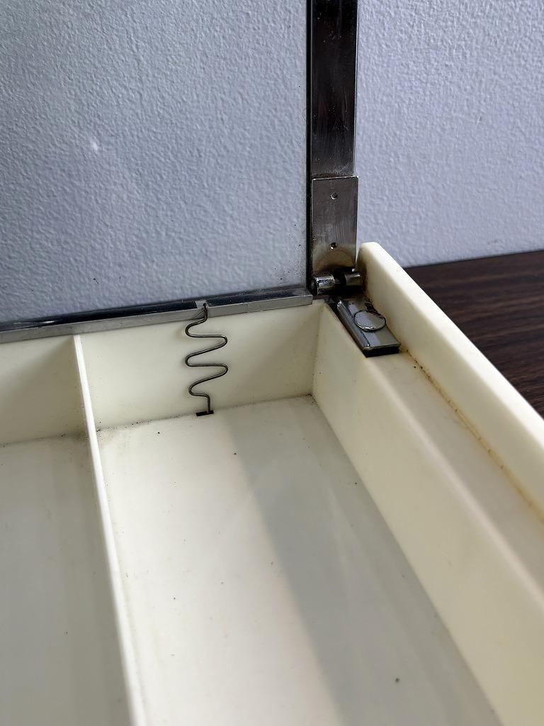内部は細かく仕切られたトレイ構造で、替刃を整然と並べるためのプッシュ機構(後部のバネ)が残っており、商業什器としてのリアルな機能美が感じられます。