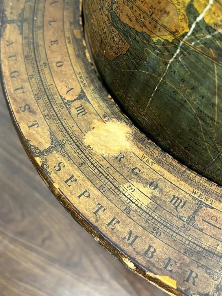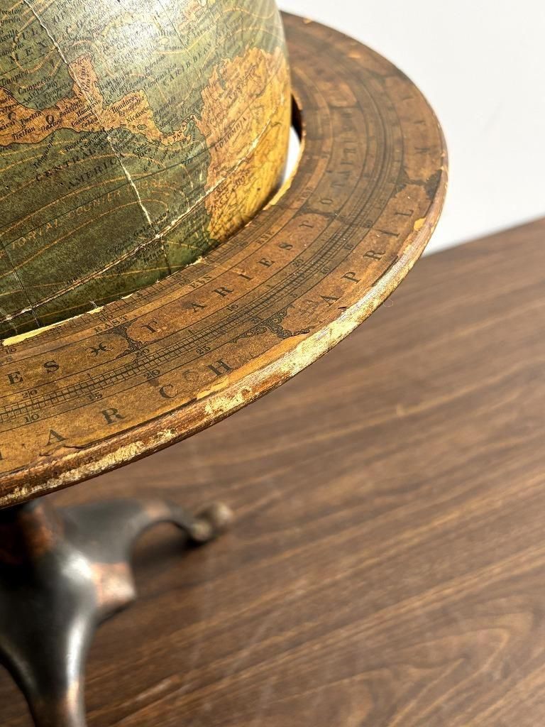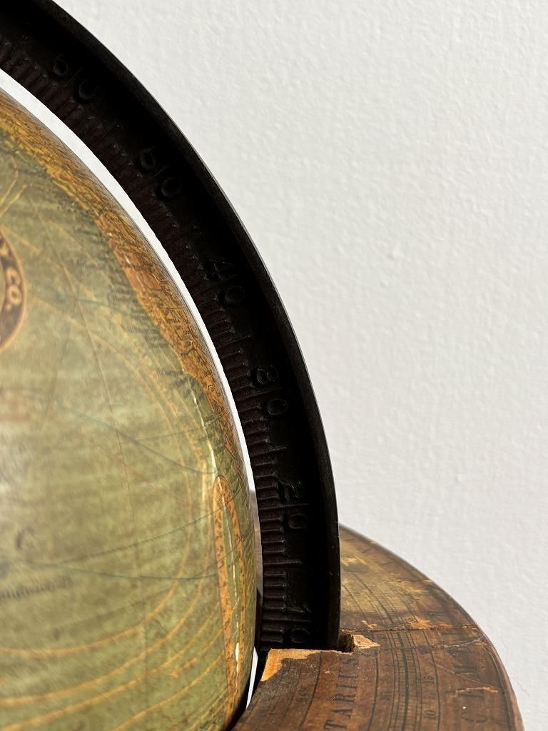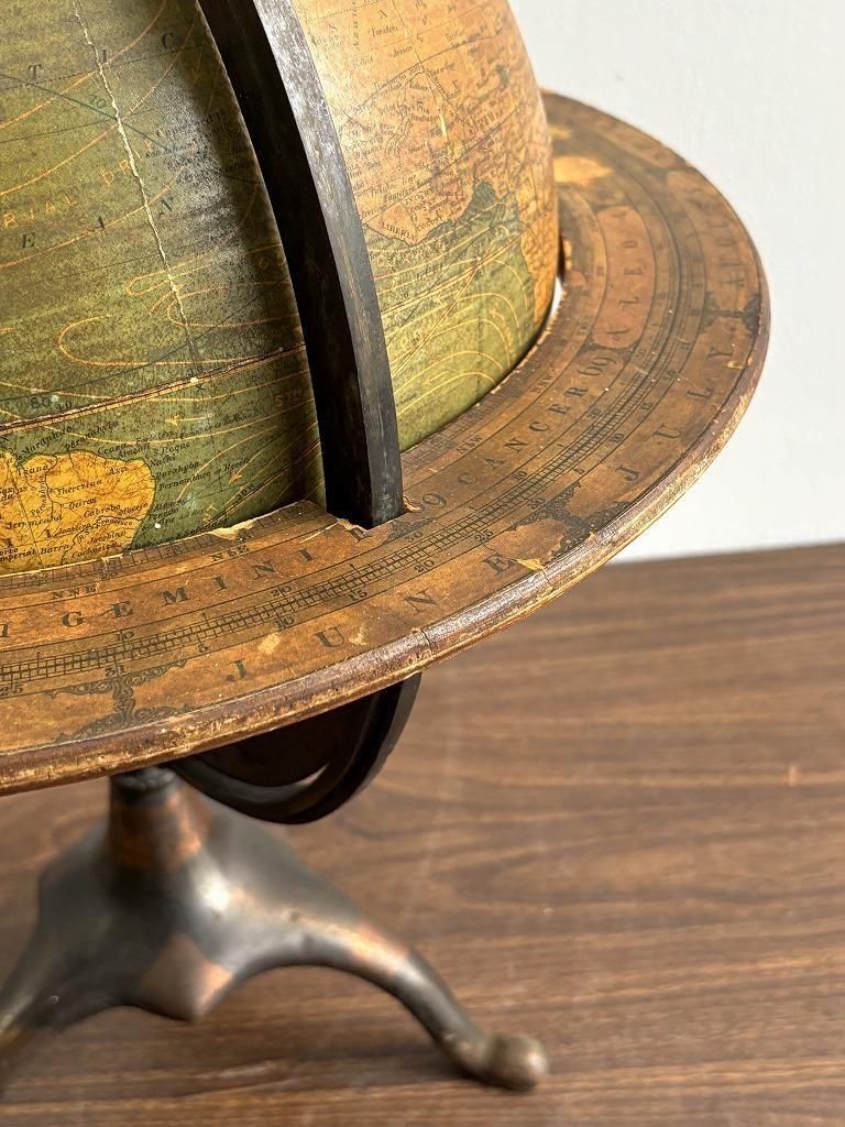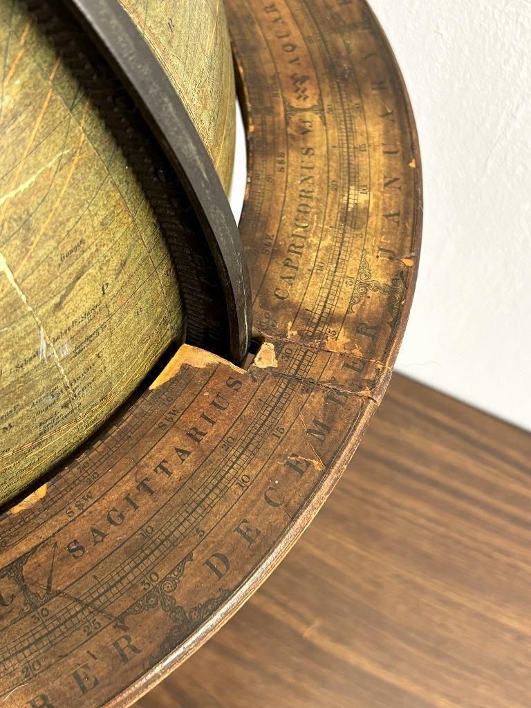 紙貼りの球体にリング状ウッドフレームを組み合わせ、鋳鉄ベースにはジャパンカラーを使用。この塗装は1890-1910年代にかけてアメリカで流行した意匠で、和漆のような深い黒と金の風合いを模したものになります。当時の高級教育器具や科学機器にもよく使われ、現存品が非常に少ない仕上げです。