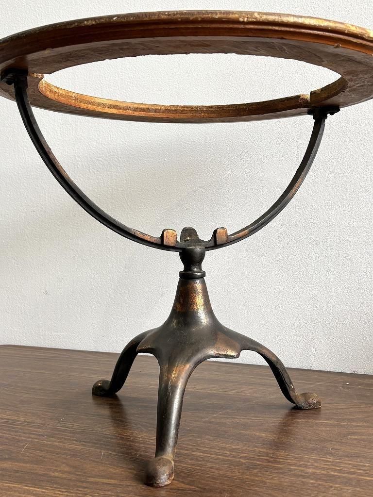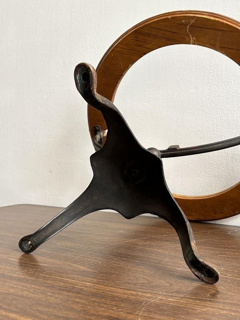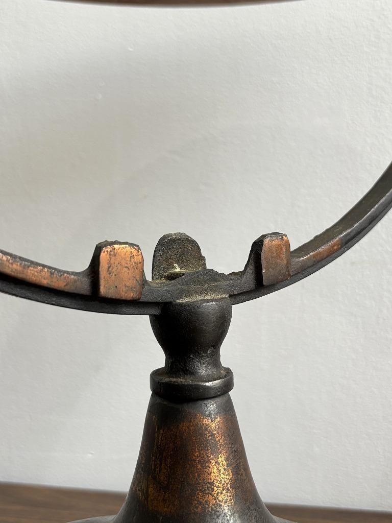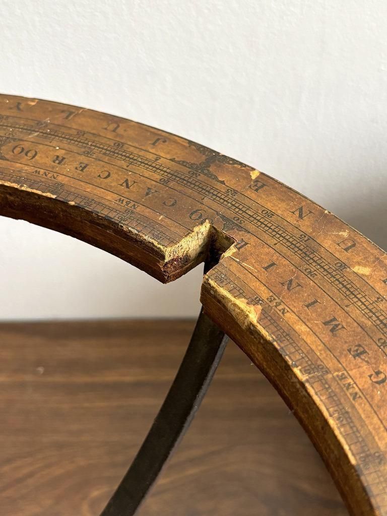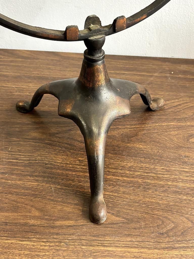 紙貼りの球体にリング状ウッドフレームを組み合わせ、鋳鉄ベースにはジャパンカラーを使用。この塗装は1890-1910年代にかけてアメリカで流行した意匠で、和漆のような深い黒と金の風合いを模したものになります。当時の高級教育器具や科学機器にもよく使われ、現存品が非常に少ない仕上げです。
