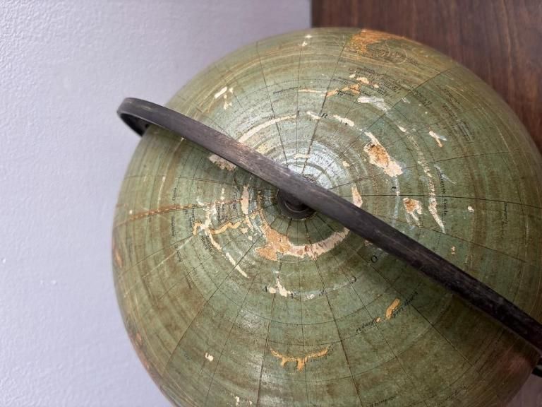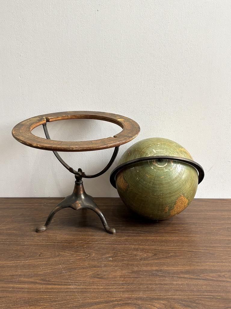 当時のスクールグローブらしい機能性の高さも魅力です。球体は回転し、さらに外周のメタルリング(子午線リング)も可動するため、地域・緯度・角度を立体的に確認できる構造になっています。単なる装飾品ではなく、実際に授業で使われていたものであることが手に取るように感じられるポイントです。