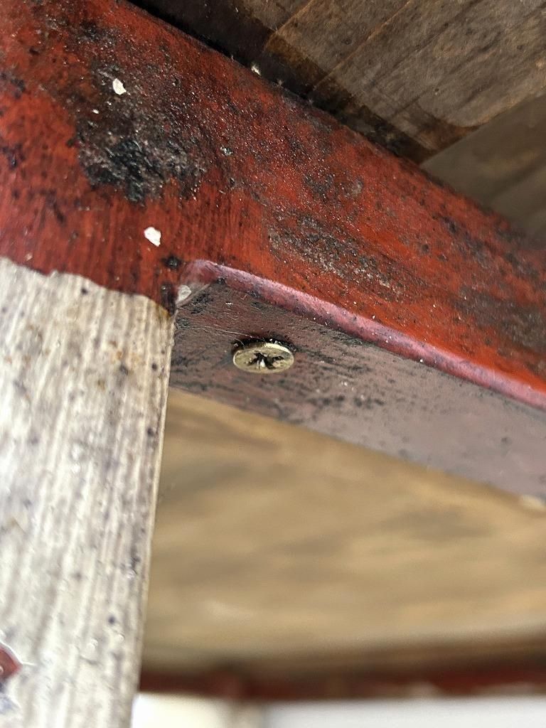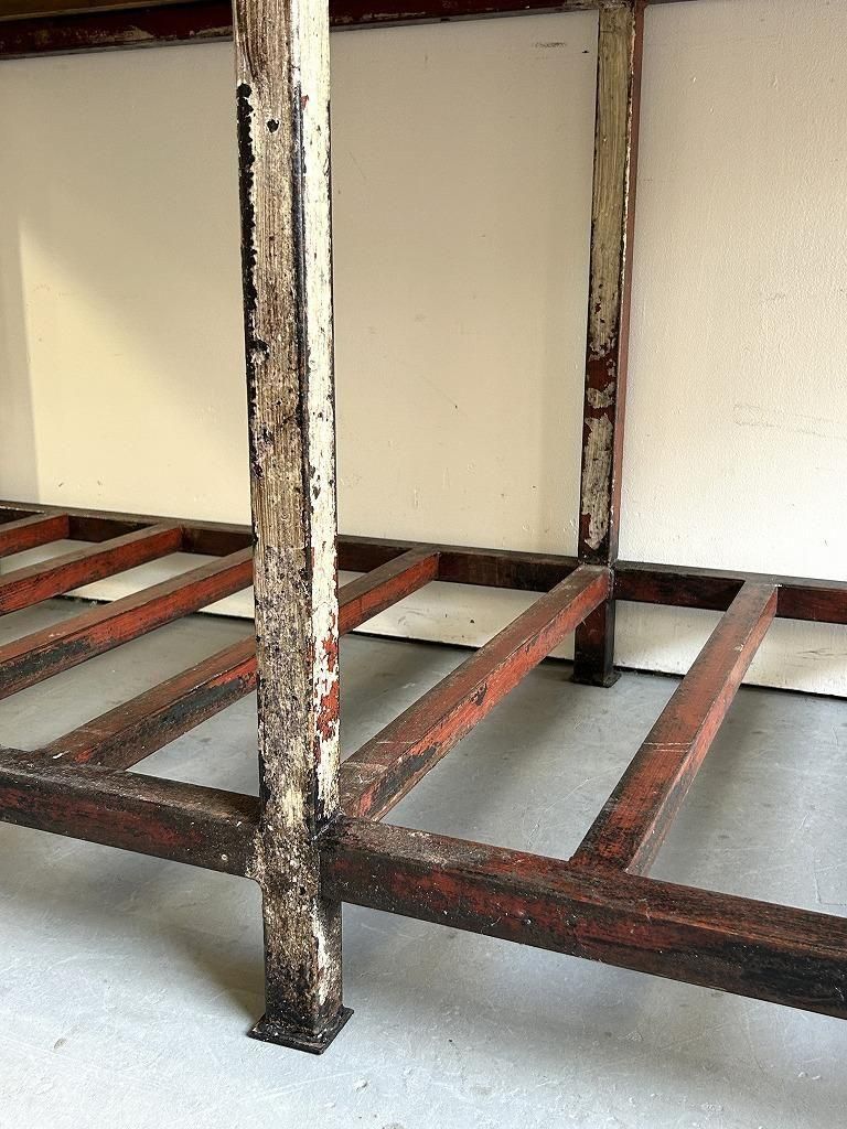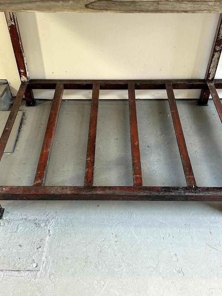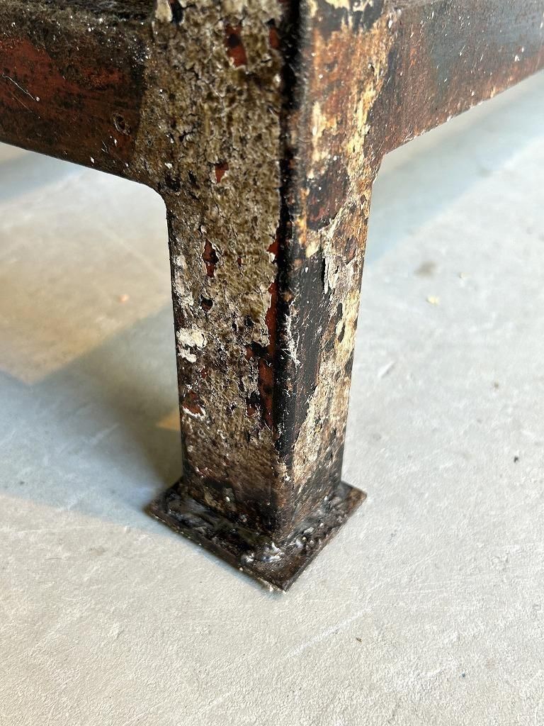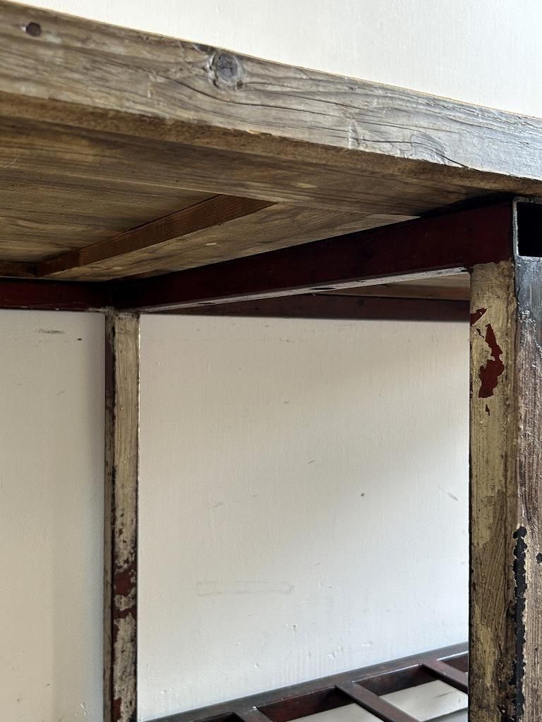 棚部分は物を載せても圧迫感がない格状のスチールフレームで構成されており、経年による塗装の剥がれ、鉄のくすみ、下地の赤錆色が浮き出しインダスリーで無骨な佇まいとなっています。