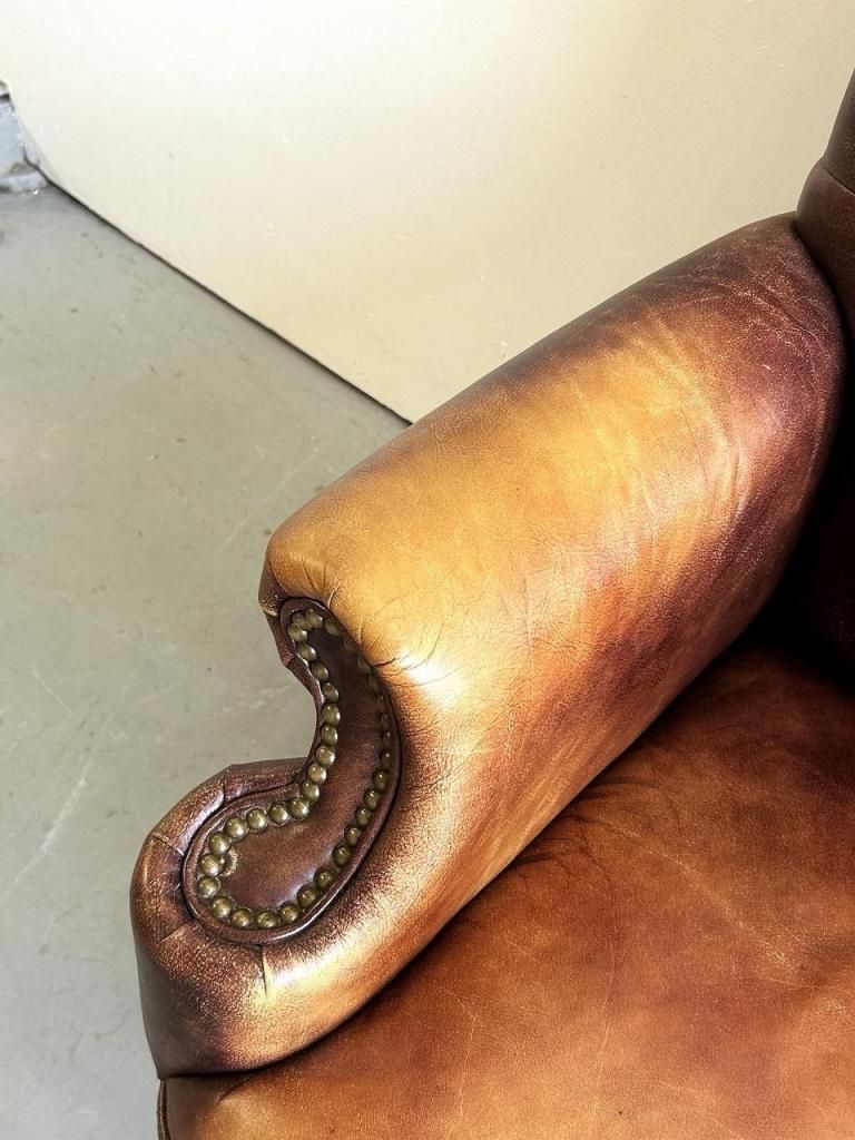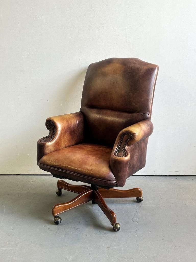 重厚なシルエットとクラシックなディテールを備えた一脚で、アメリカのオフィスや書斎で実際に使用されていたものです。伝統的なクラブチェアの意匠を忠実に踏襲したデザインが印象的です。
