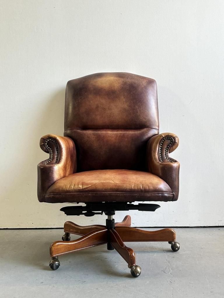 張り地にはビニールレザーを採用し、使い込まれた本革のような色ムラやパティーナが魅力です。アームには鋲打ち装飾が施され、背もたれの厚みや丸みのあるプロポーションがエグゼクティブチェアらしい堂々とした存在感を放っています。