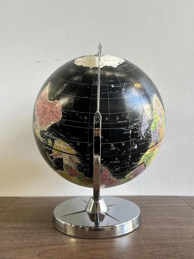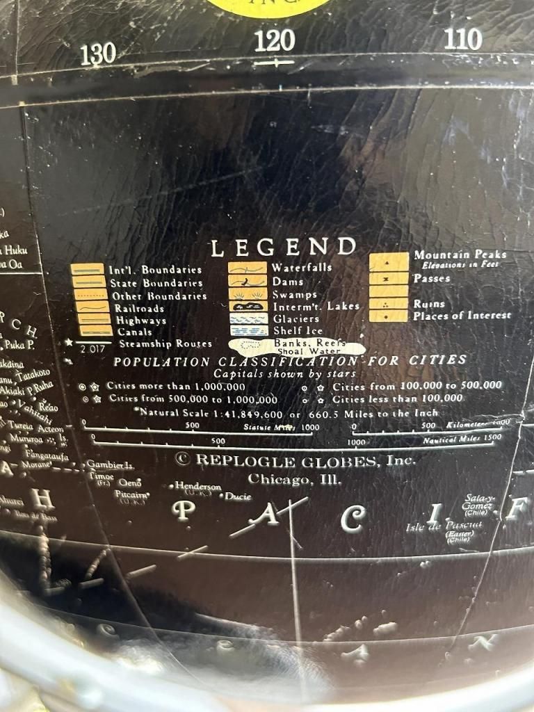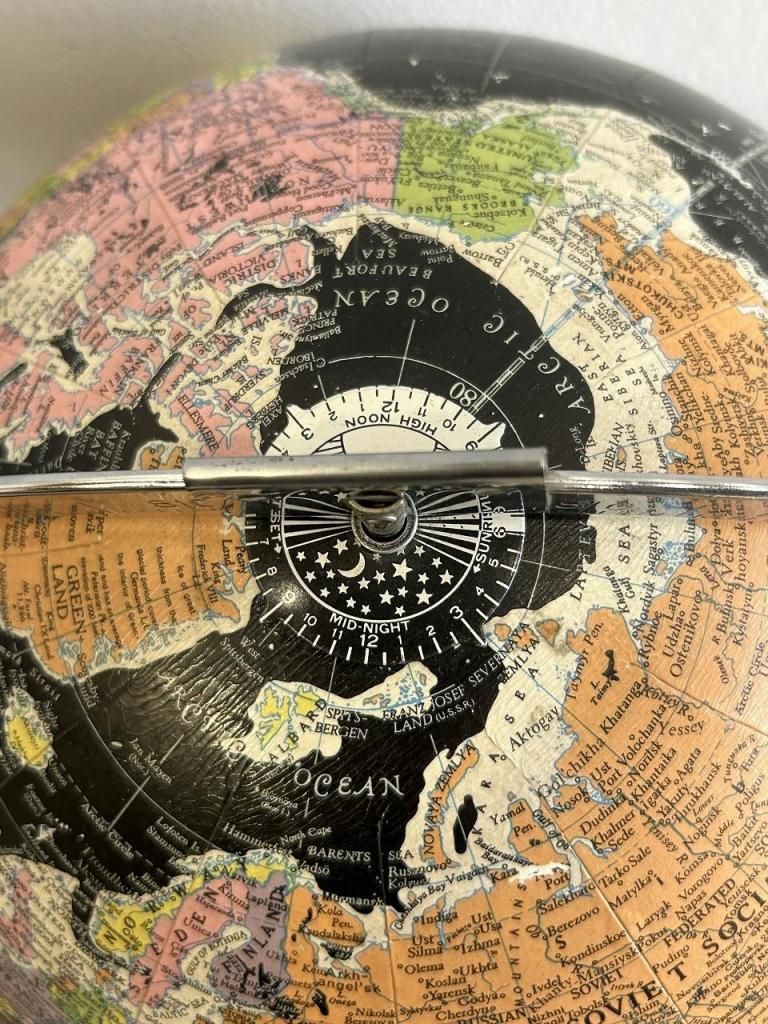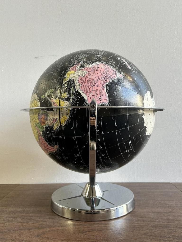 この個体はReplogleが最も評価される時期の地球儀デザインで、黒い海(ブラックオーシャン)にパステルカラーの国表示、細かい文字の密度が高く、オブジェとしてインパクトが強いです。