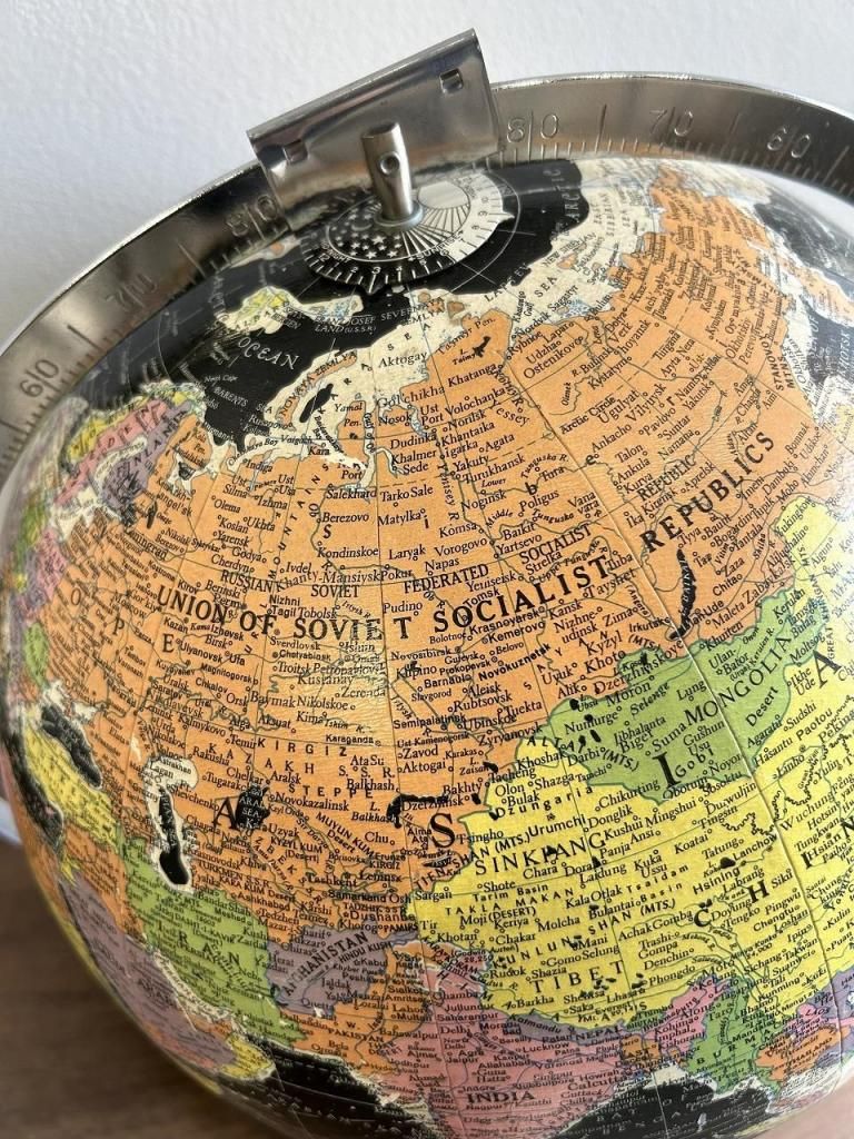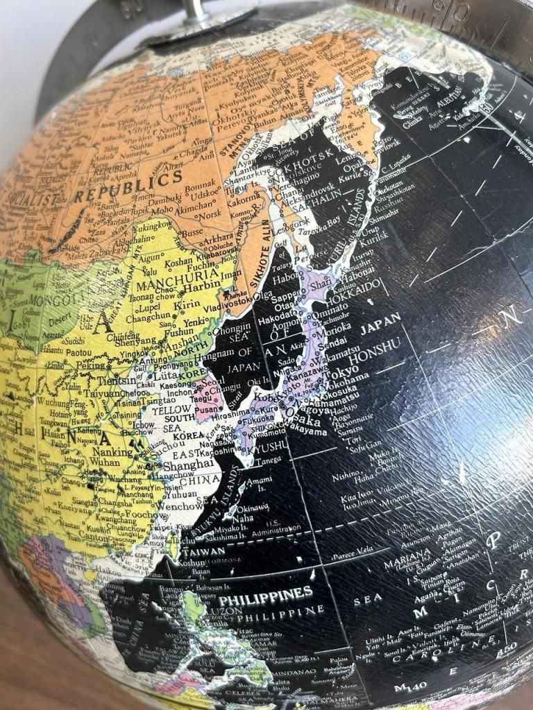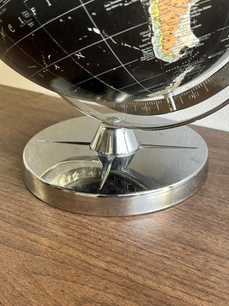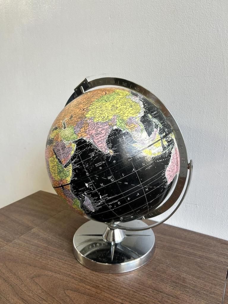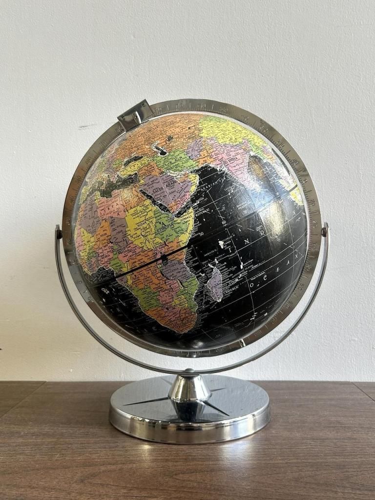 この個体はReplogleが最も評価される時期の地球儀デザインで、黒い海(ブラックオーシャン)にパステルカラーの国表示、細かい文字の密度が高く、オブジェとしてインパクトが強いです。