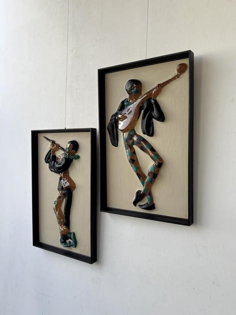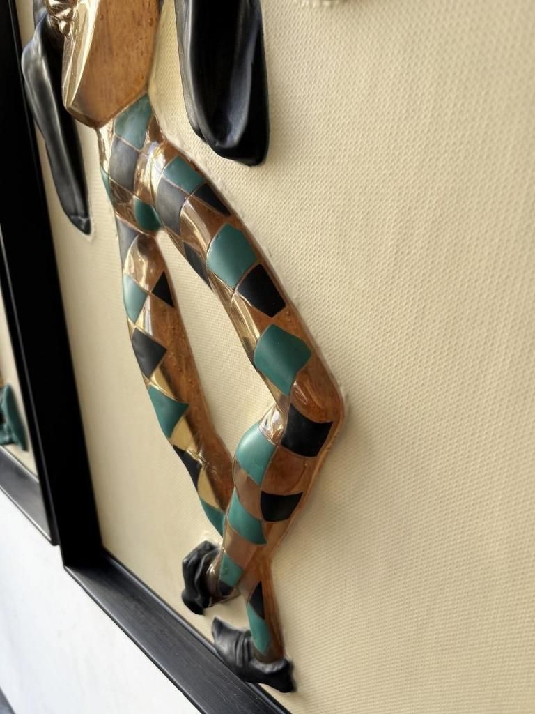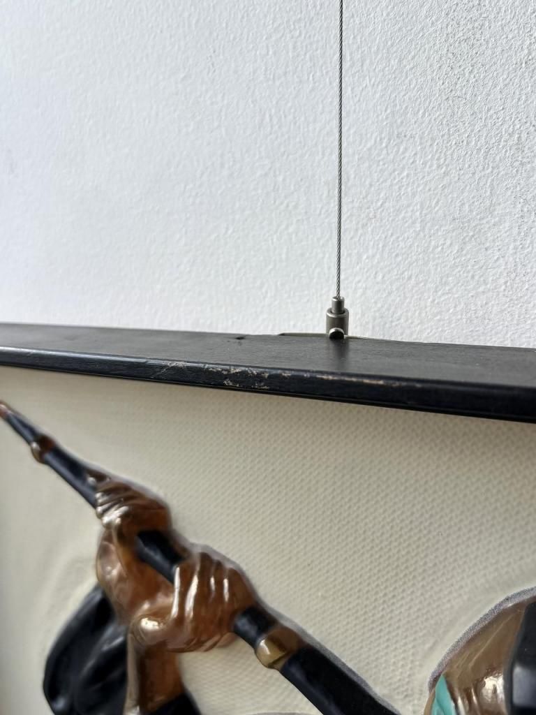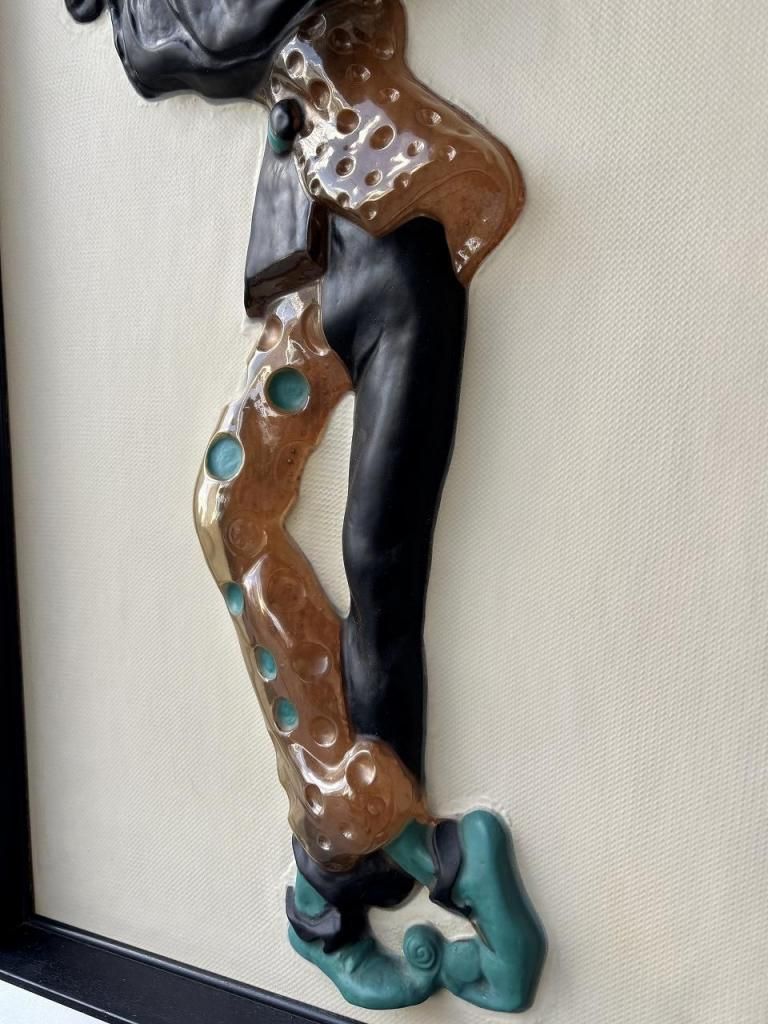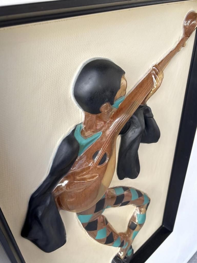 メインの人物は1950年代のウォールデコらしいプラスチック製。陶器のような光沢感とマットな質感が共存し、立体的で動きのあるポーズ造形が彫刻的で魅力的となっています。