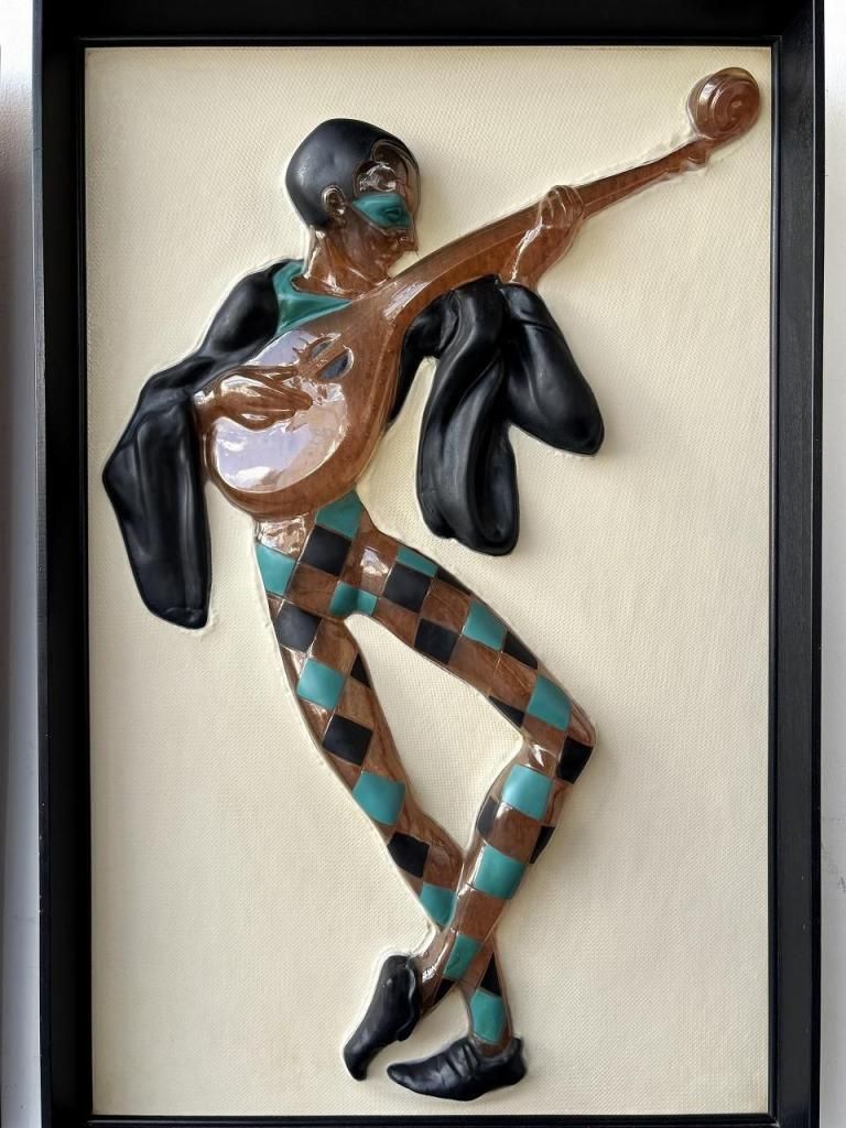 ヨーロッパの古典劇コメディア・デラルテの登場人物や、仮面舞踏会の演奏家を連想させるデザインの一品。