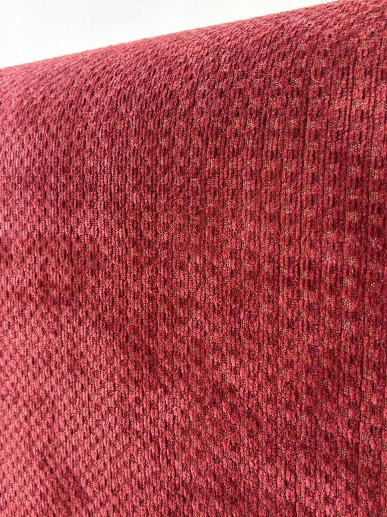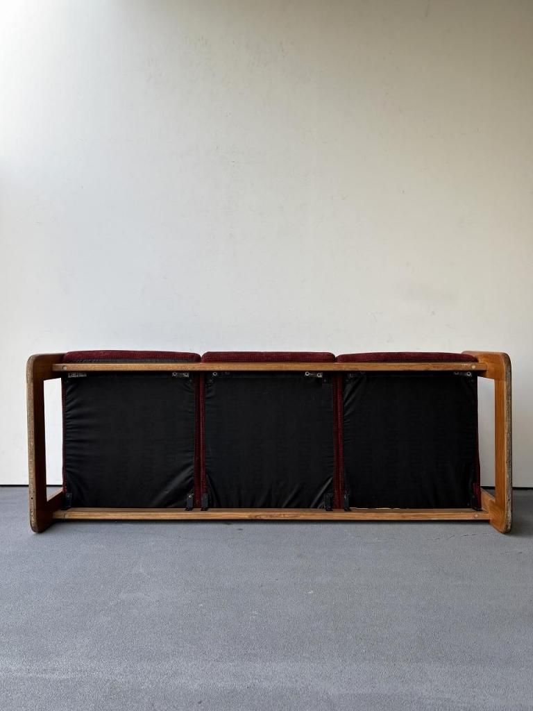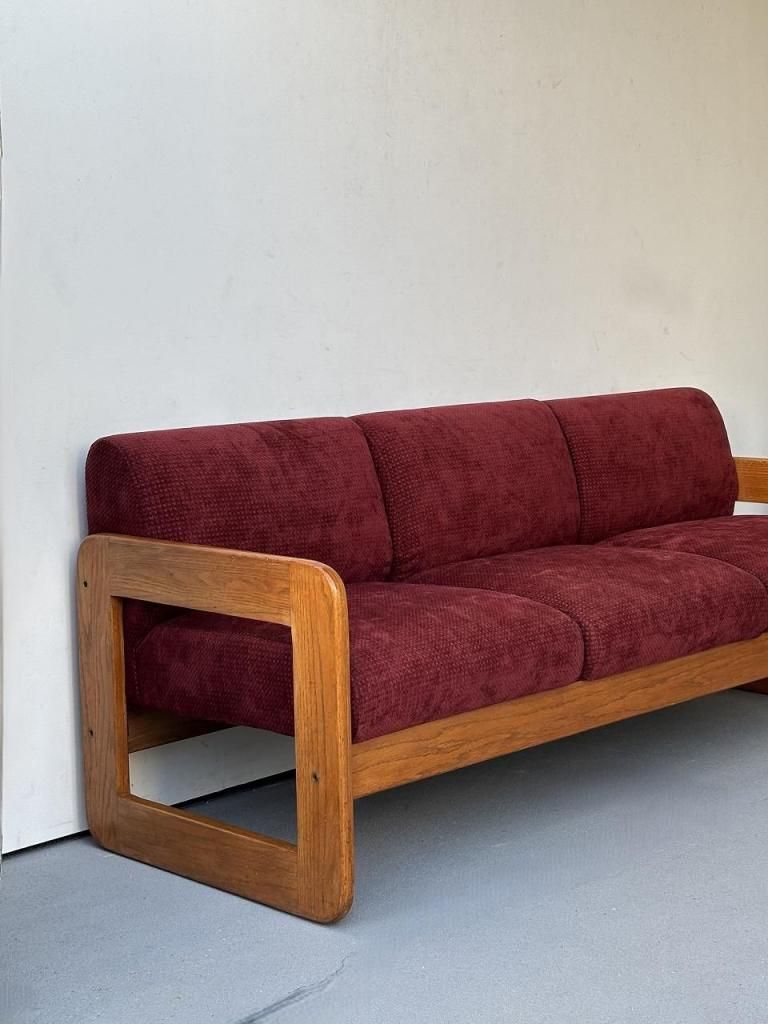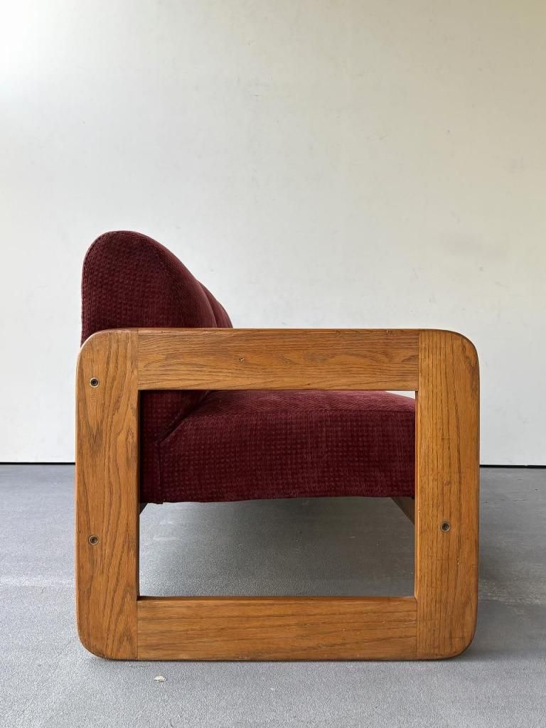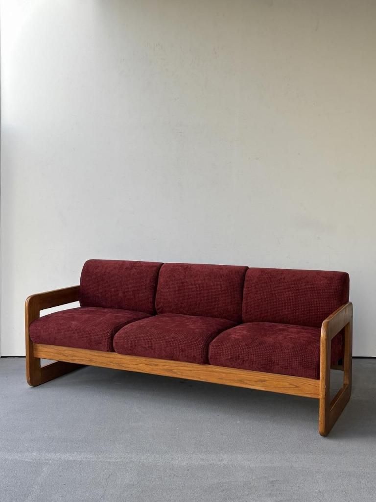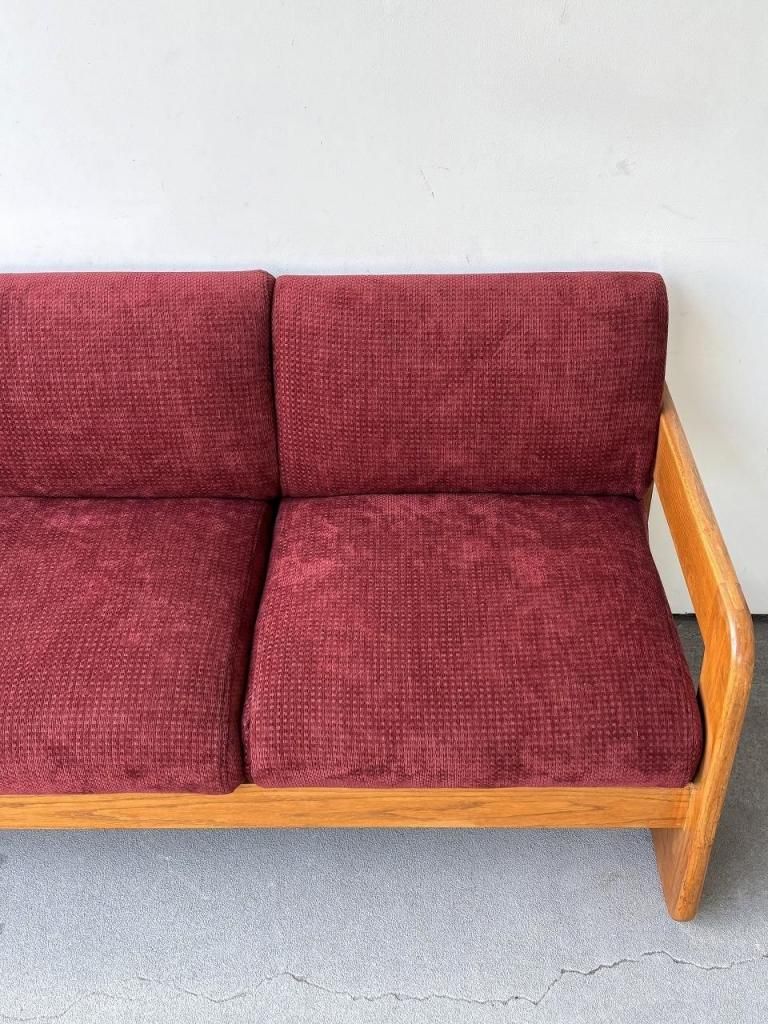 ウッドフレームと生地のコントラストが美しく、木の温かみ×深いボルドーカラーの生地という組み合わせは現代家具とも好相性で、細かい格子状の織りが入った立体的なファブリックは色に奥行きを生み、ソファに表情を作ります。