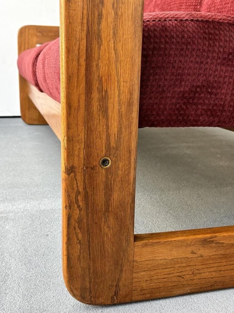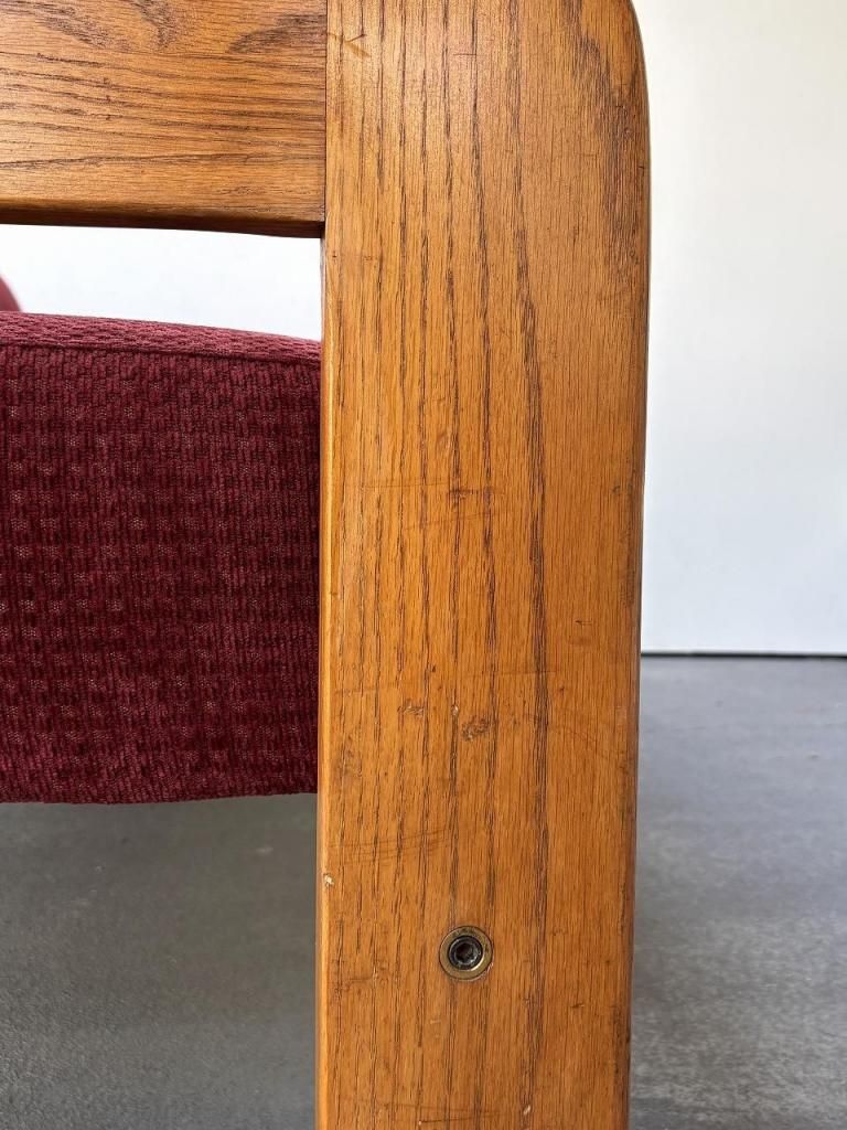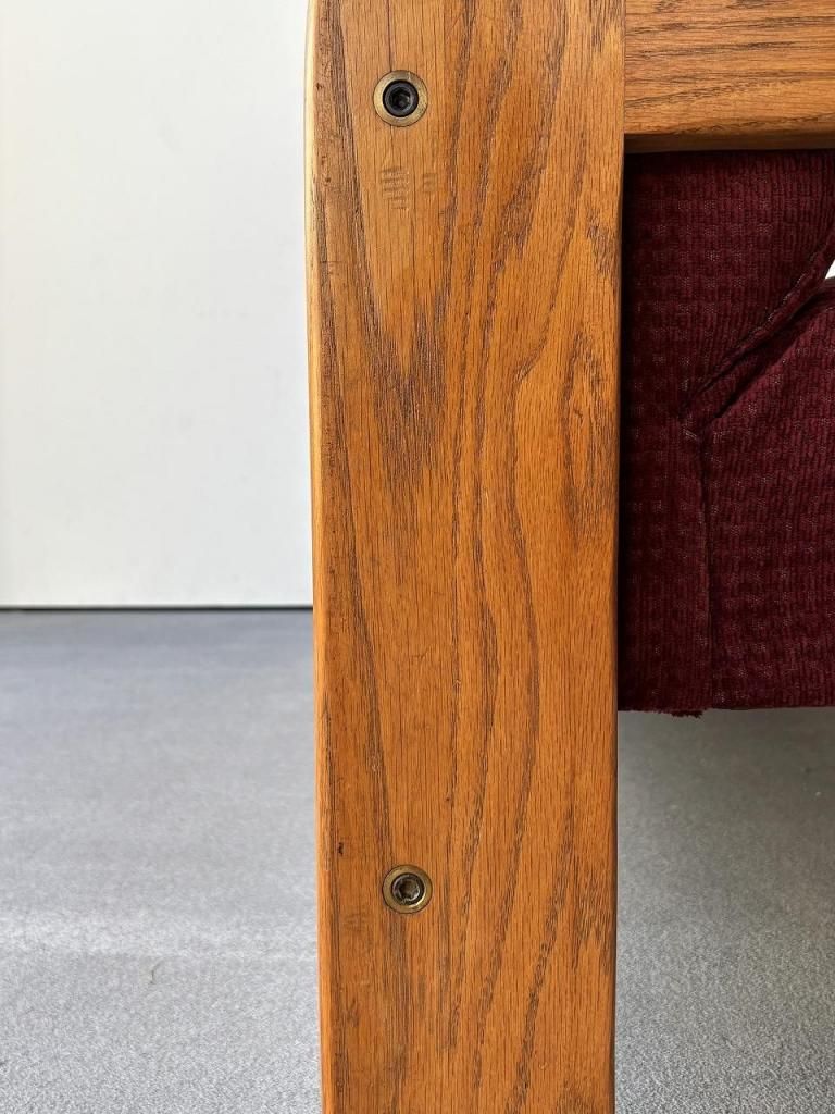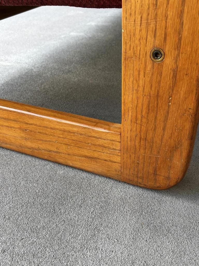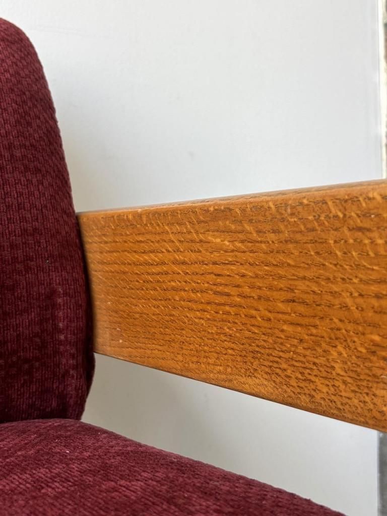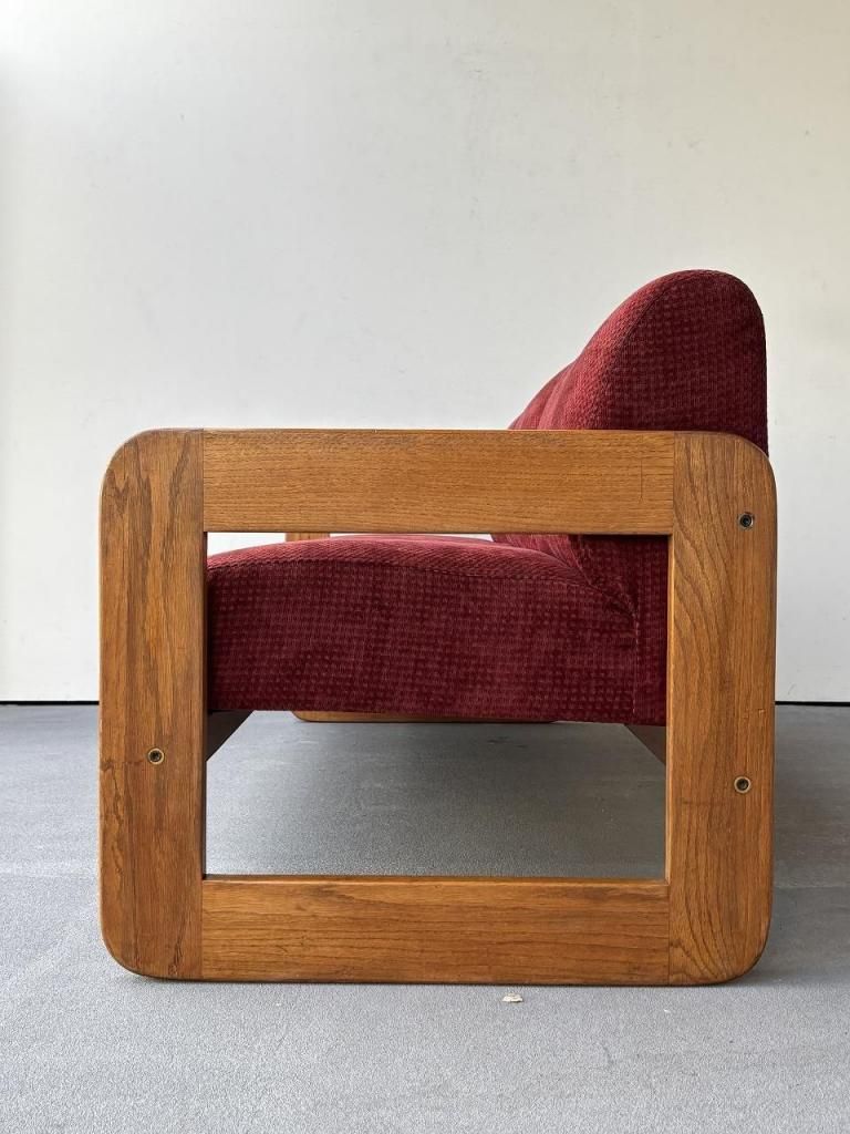 ウッドフレームと生地のコントラストが美しく、木の温かみ×深いボルドーカラーの生地という組み合わせは現代家具とも好相性で、細かい格子状の織りが入った立体的なファブリックは色に奥行きを生み、ソファに表情を作ります。