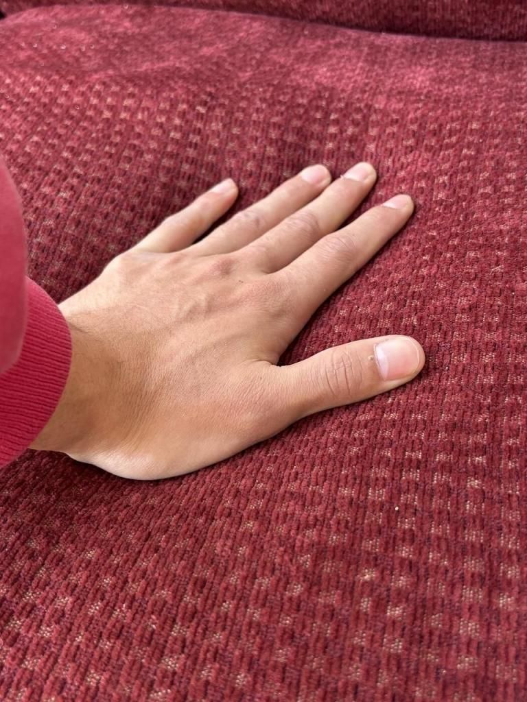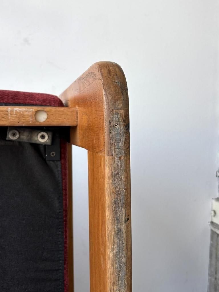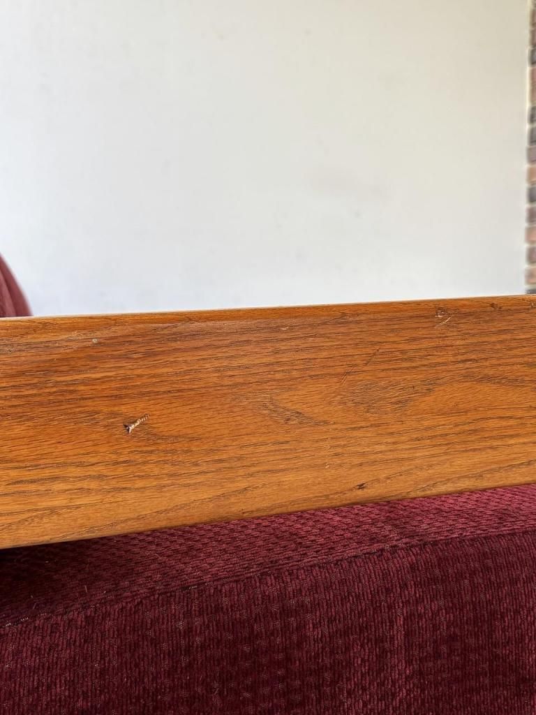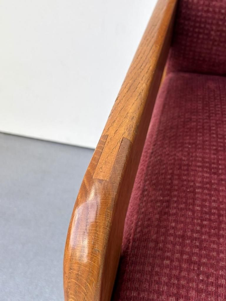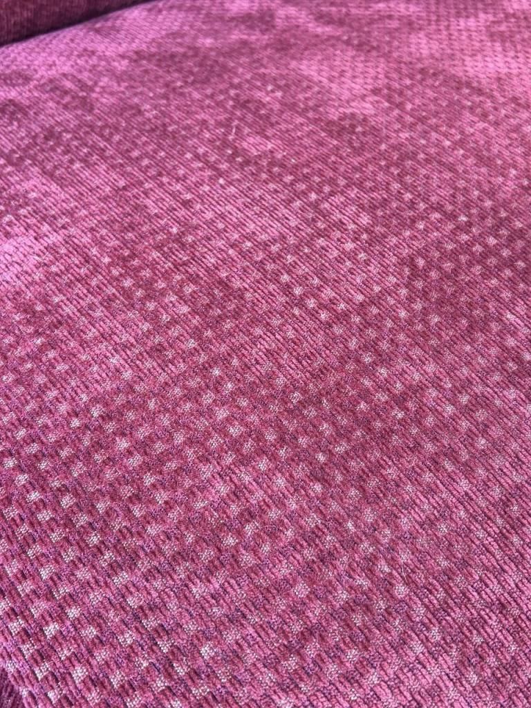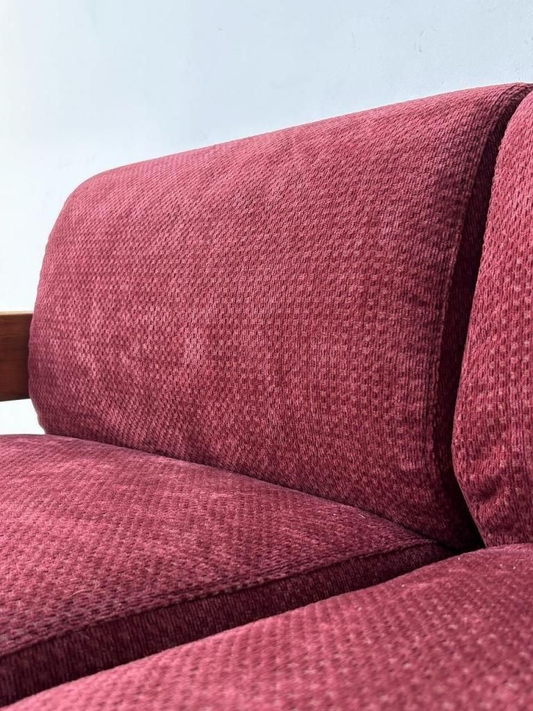 ウッドフレームと生地のコントラストが美しく、木の温かみ×深いボルドーカラーの生地という組み合わせは現代家具とも好相性で、細かい格子状の織りが入った立体的なファブリックは色に奥行きを生み、ソファに表情を作ります。