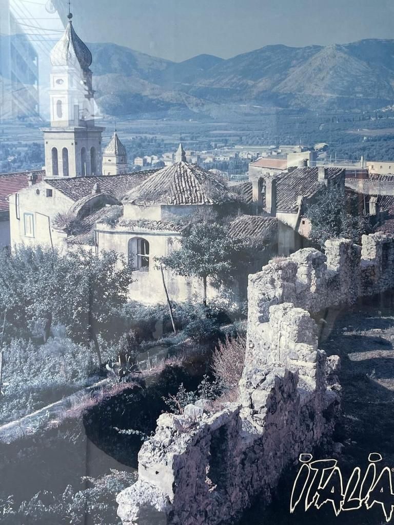 当時の旅行広告や観光ポスターによく見られる、柔らかいブルートーンの写真と、勢いのある“ITALIA”ロゴの組み合わせが印象的な一枚。
