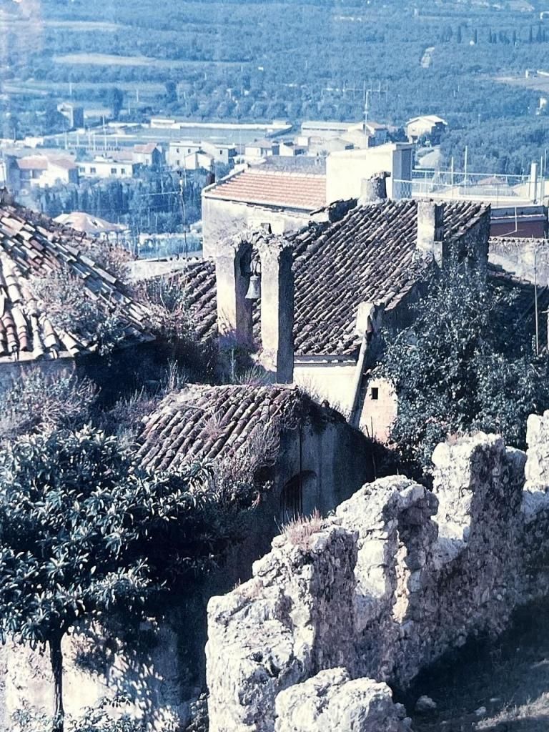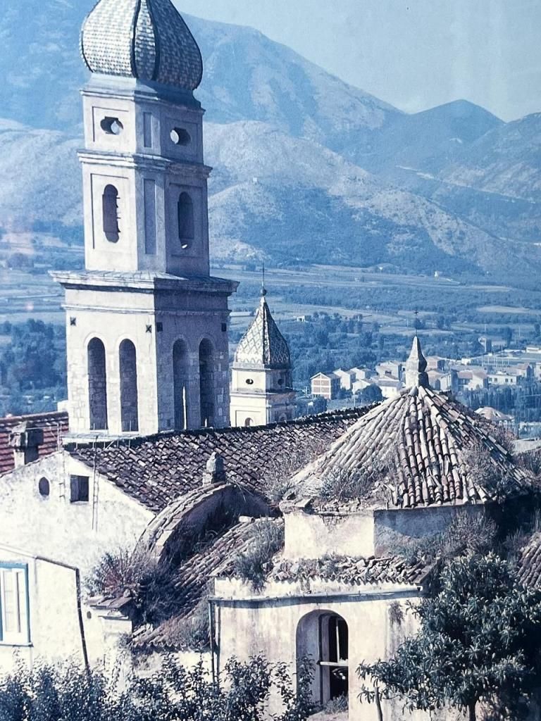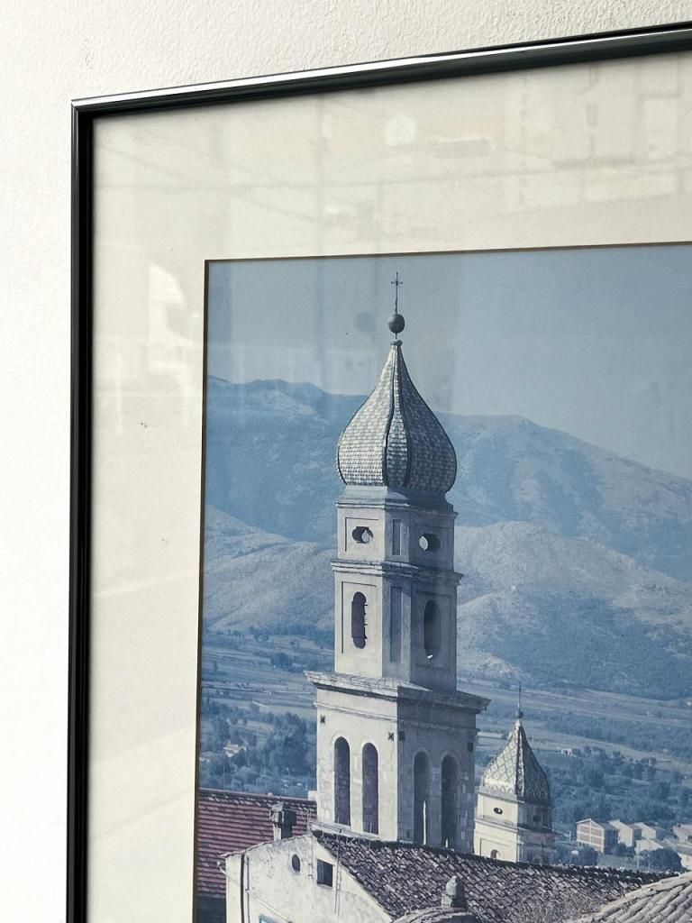 石畳の路地や瓦屋根、尖塔が連なる静かな街並みが広がり、遠景には山脈が重なるドラマチックなデザイン。フォトプリント特有の淡い退色や紙質のざらつきがそのまま残っており、80’sヴィジュアルらしいノスタルジックな空気感を強く感じます。