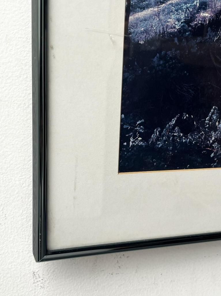 黒のメタルフレームにガラスカバーが採用された仕様で、すっきりとしたミニマルな縁取りが写真の透明感をより引き立てます。重厚さもあり、壁面を一枚の窓のように演出してくれるアイテムです。