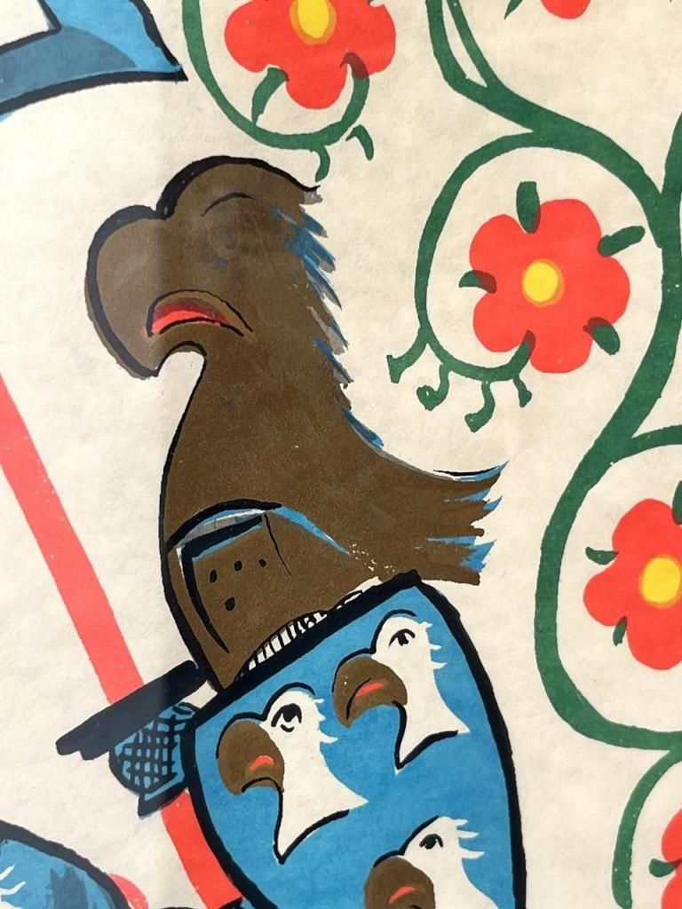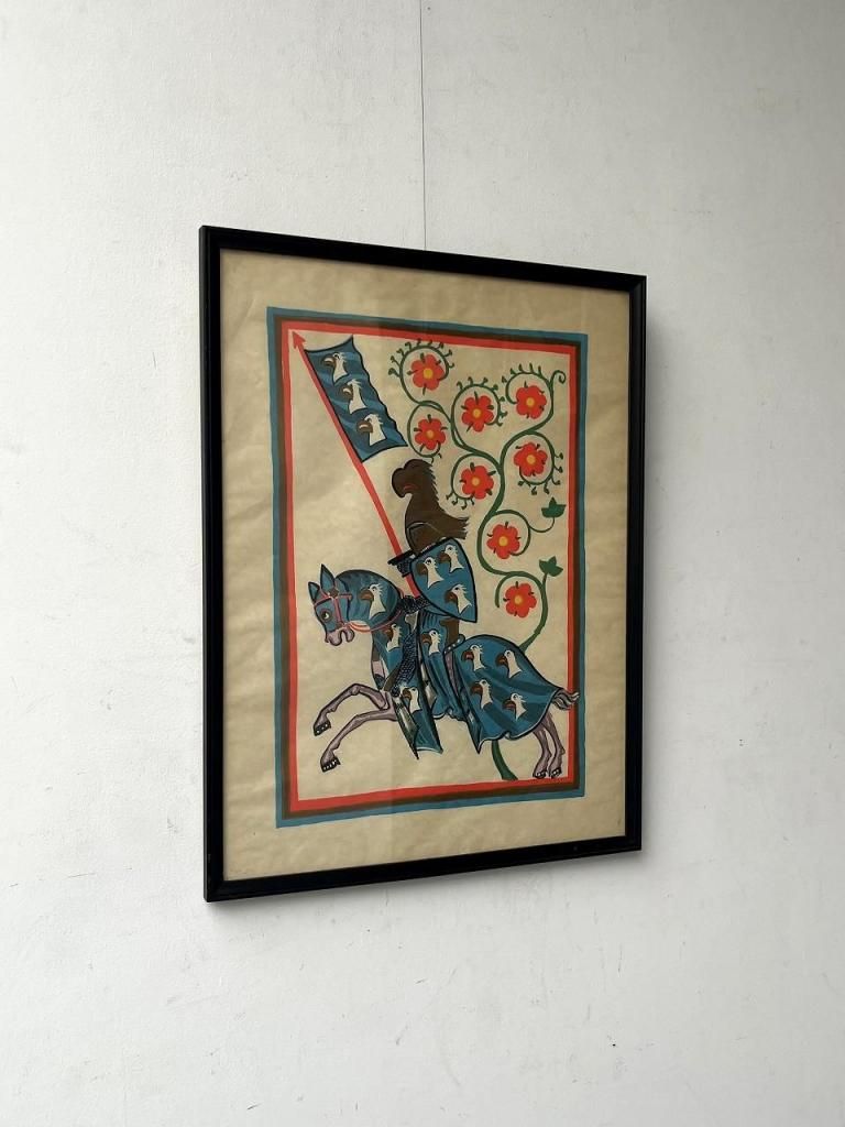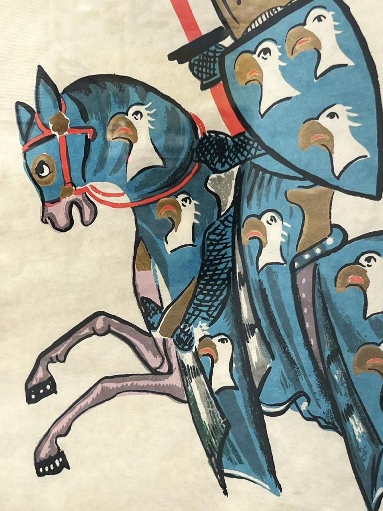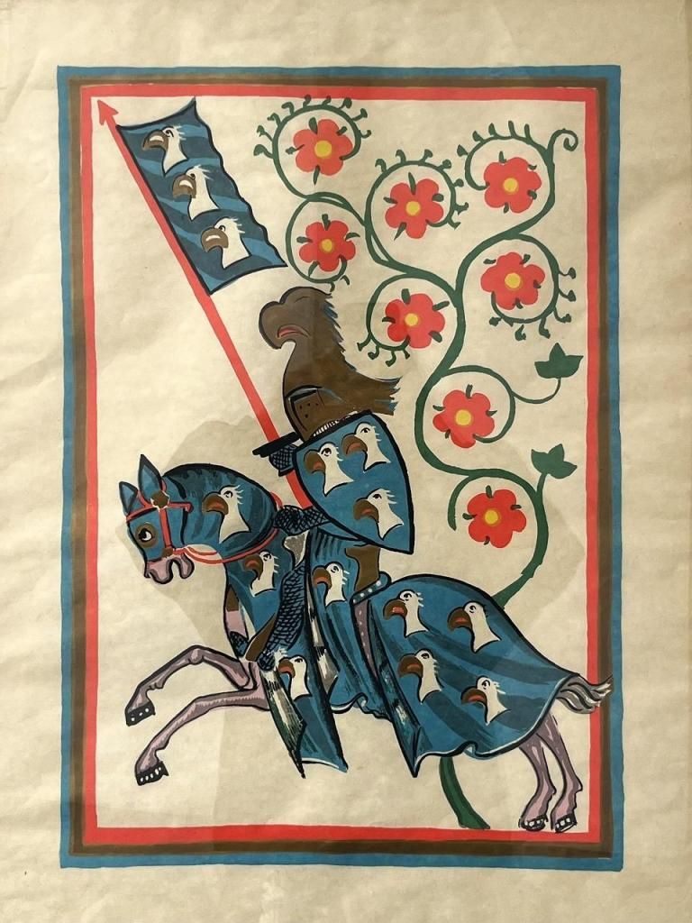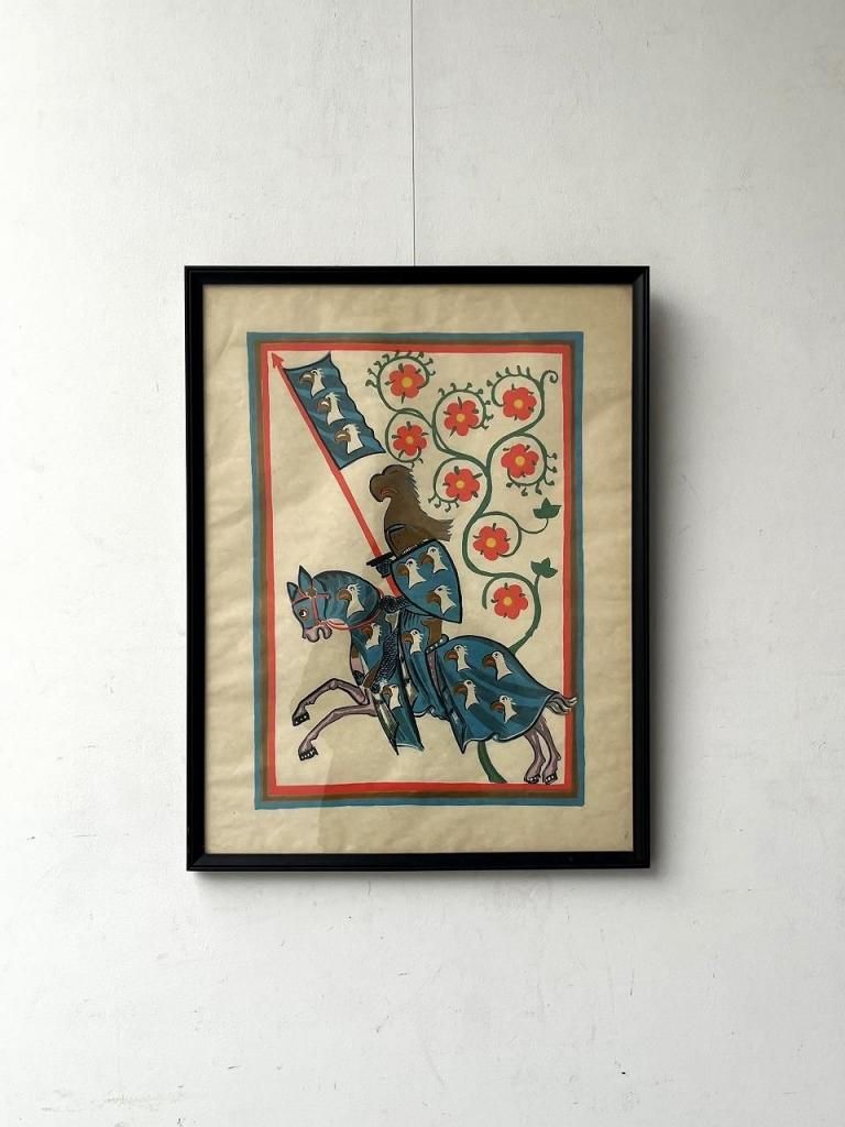 勇壮な騎士と騎馬が象徴的に描かれ、鎧や馬の装飾には同紋章がリズミカルに配置されるなど、中世の紋章学(ヘラルドリー)の意匠を忠実に再現しています。周囲には写本特有の植物文様が描かれており、赤・青・緑の原色構成がクラシックかつグラフィカルな存在感を放っています。