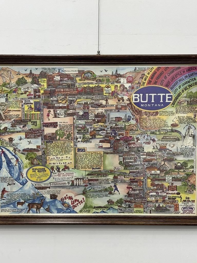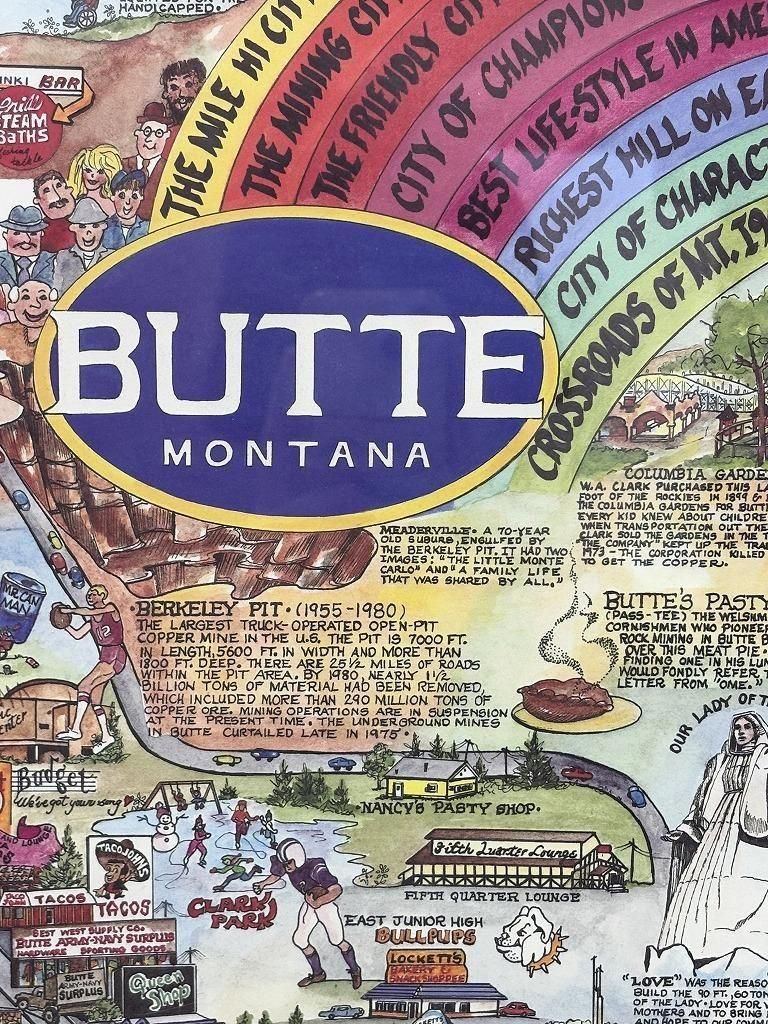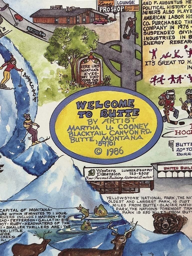 アメリカ・モンタナ州ビュート(BUTTE, MONTANA)で制作された、ローカルアーティスト Martha U. Cooney による1986年のイラストマップポスター。