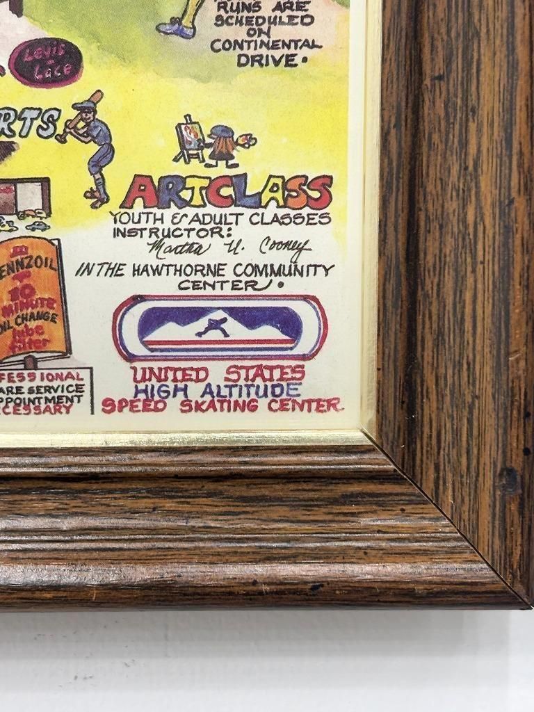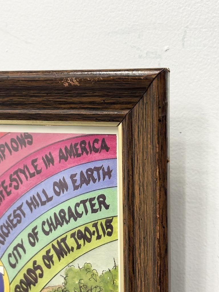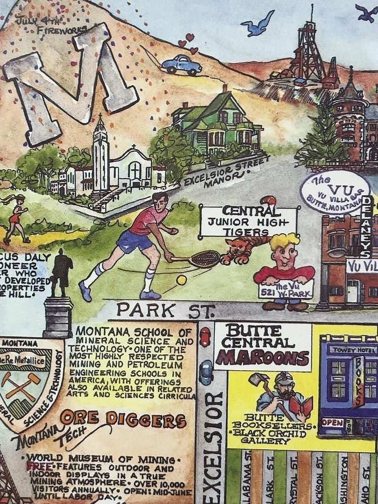 手描きの水彩タッチで、鉱山町として知られるビュートの街並み、鉱山、ショップ、スポーツ文化など、1980年代当時のローカルシーンを細かく描き込んだ一枚です。
