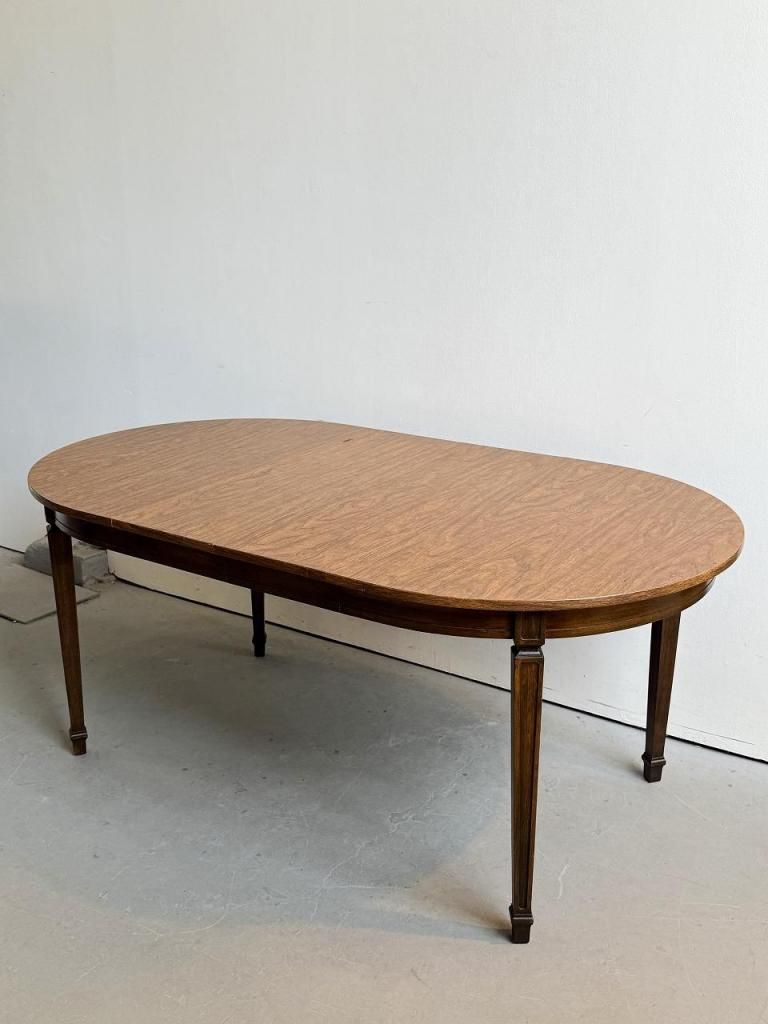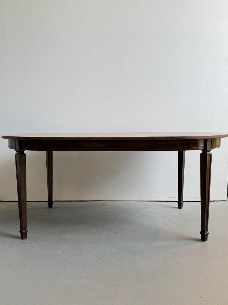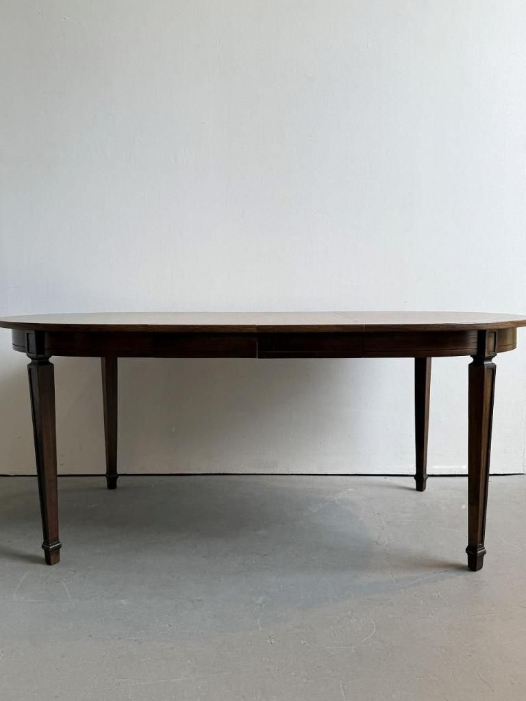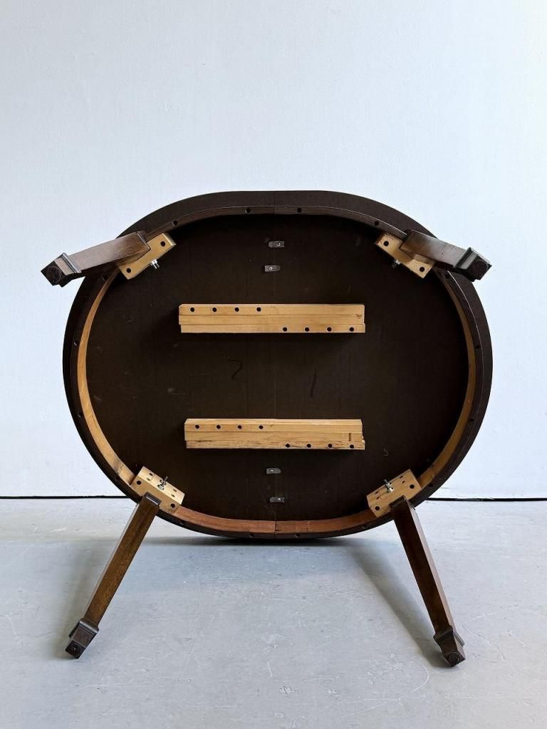丸みのあるオーバル天板と、クラシカルな角脚の組み合わせが印象的な一台。