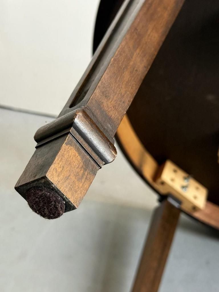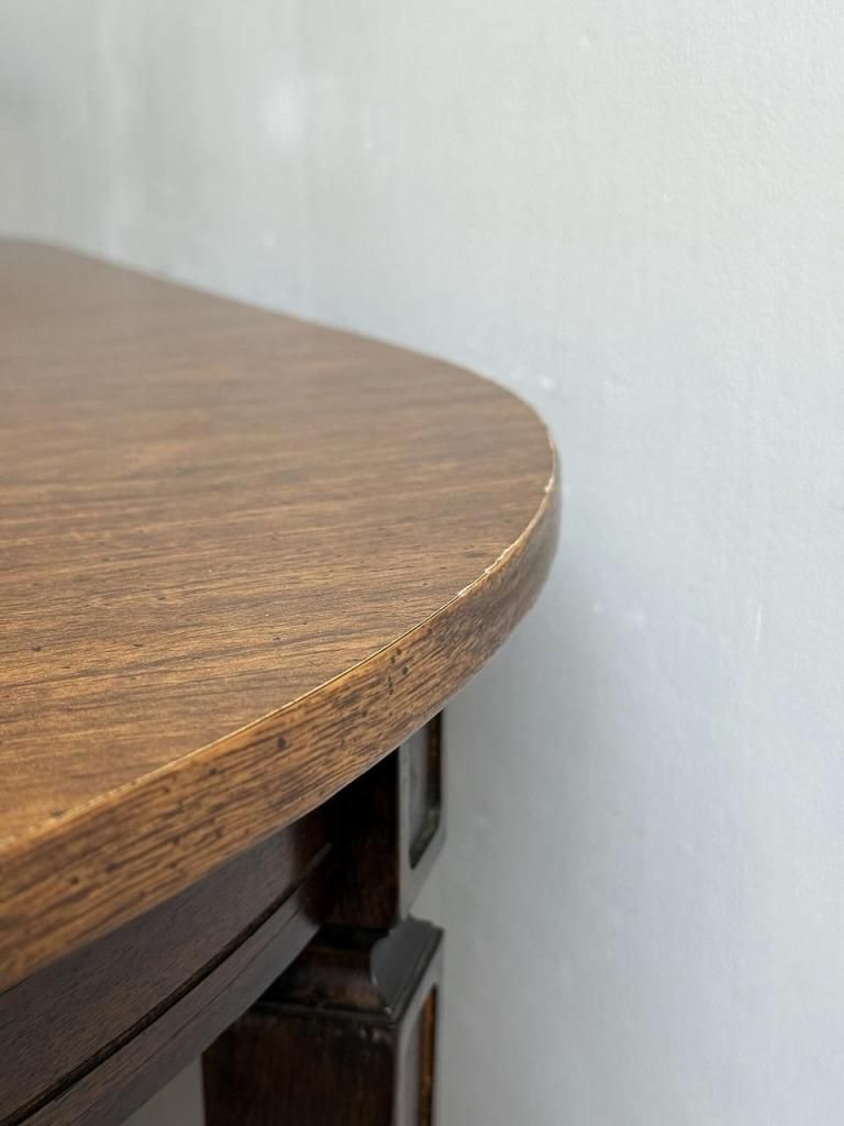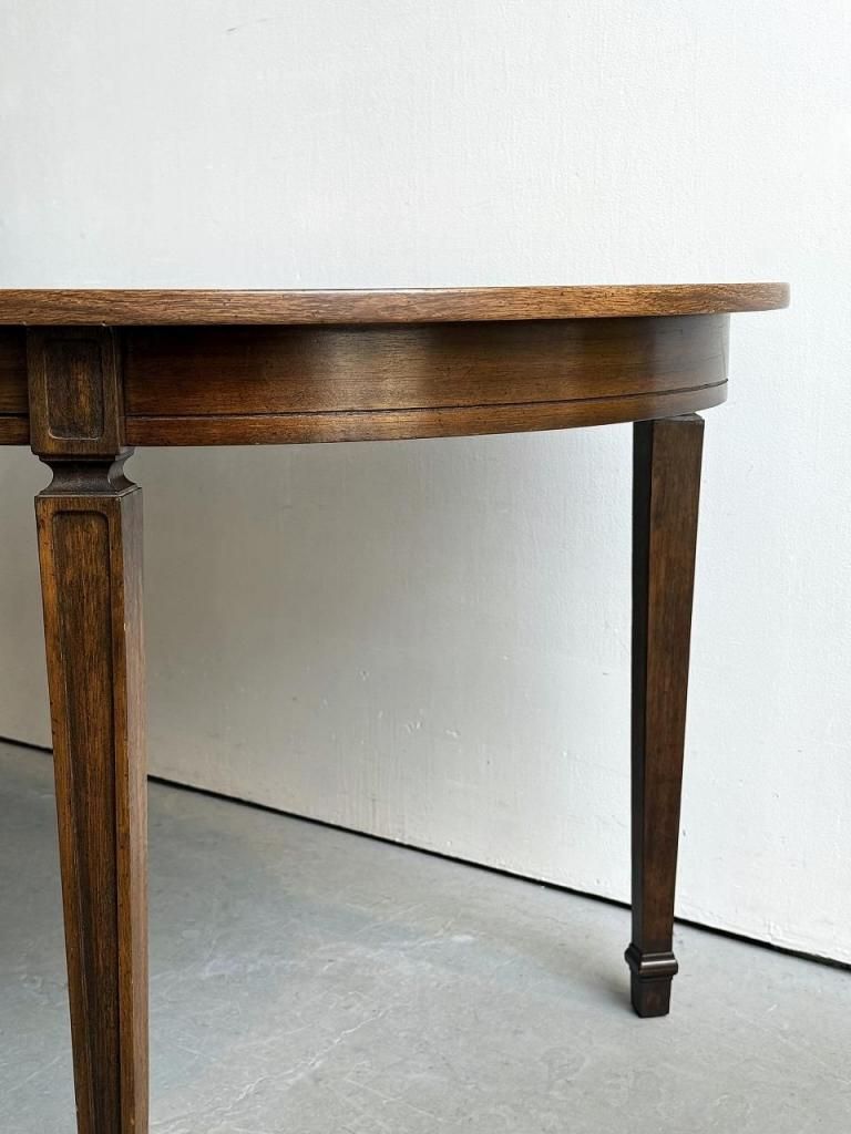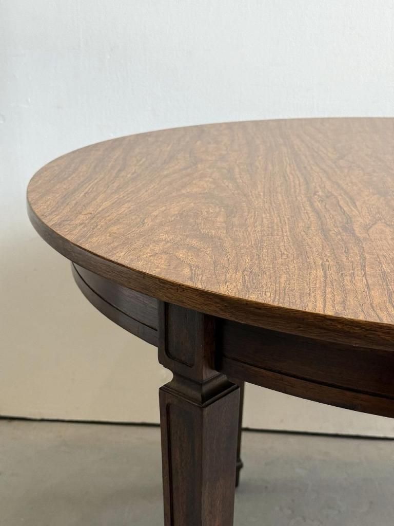 丸みのあるオーバル天板と、クラシカルな角脚の組み合わせが印象的な一台。