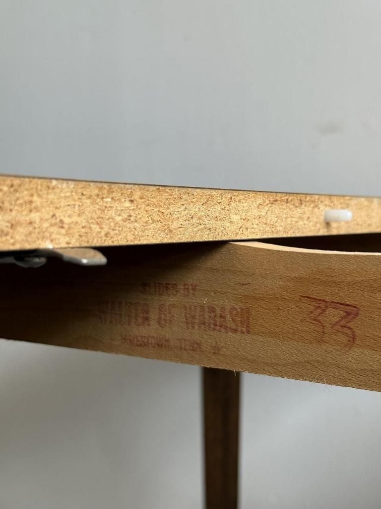 木製のスライドレールには1950-70年代の家具に多く用いられていたWalter of Wabash社のものが用いられています。エクステンションスライドを製造していたWabash社は当時のアメリカ家具ブランドが多く採用し、Broyhillや、Bassett、Drexel、Laneなどミッドセンチュリーを代表するメーカーが例に挙げられます。
